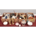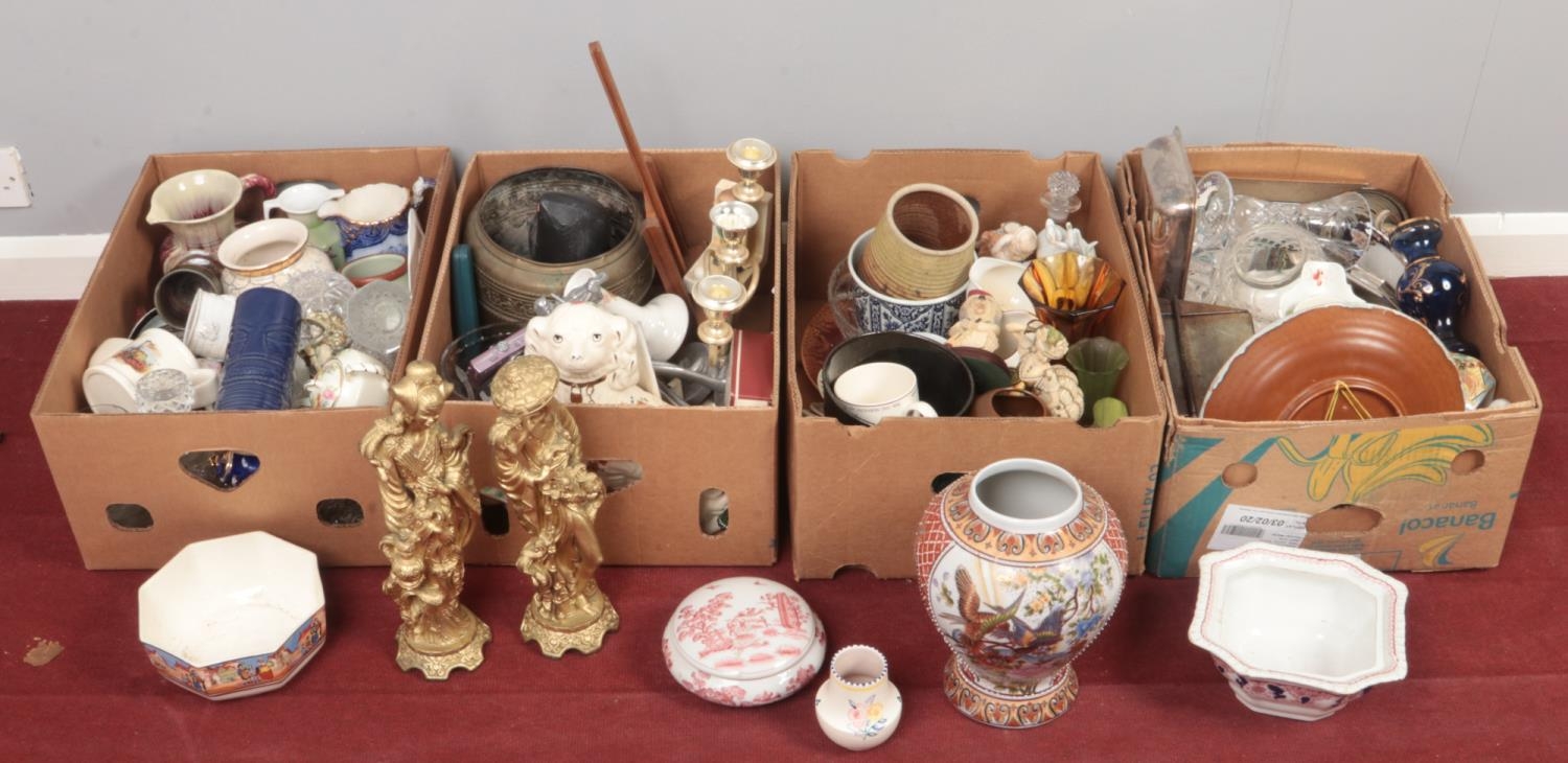 Four boxes of miscellaneous. Including two large gilt figures, glassware, Nao figure, Poole, Rockingham plate, etc.