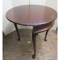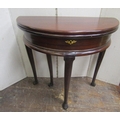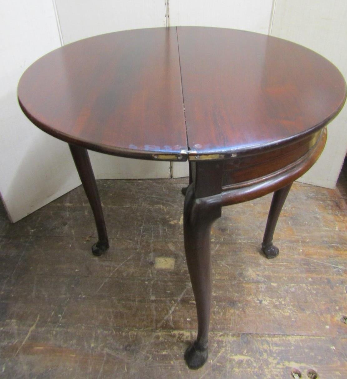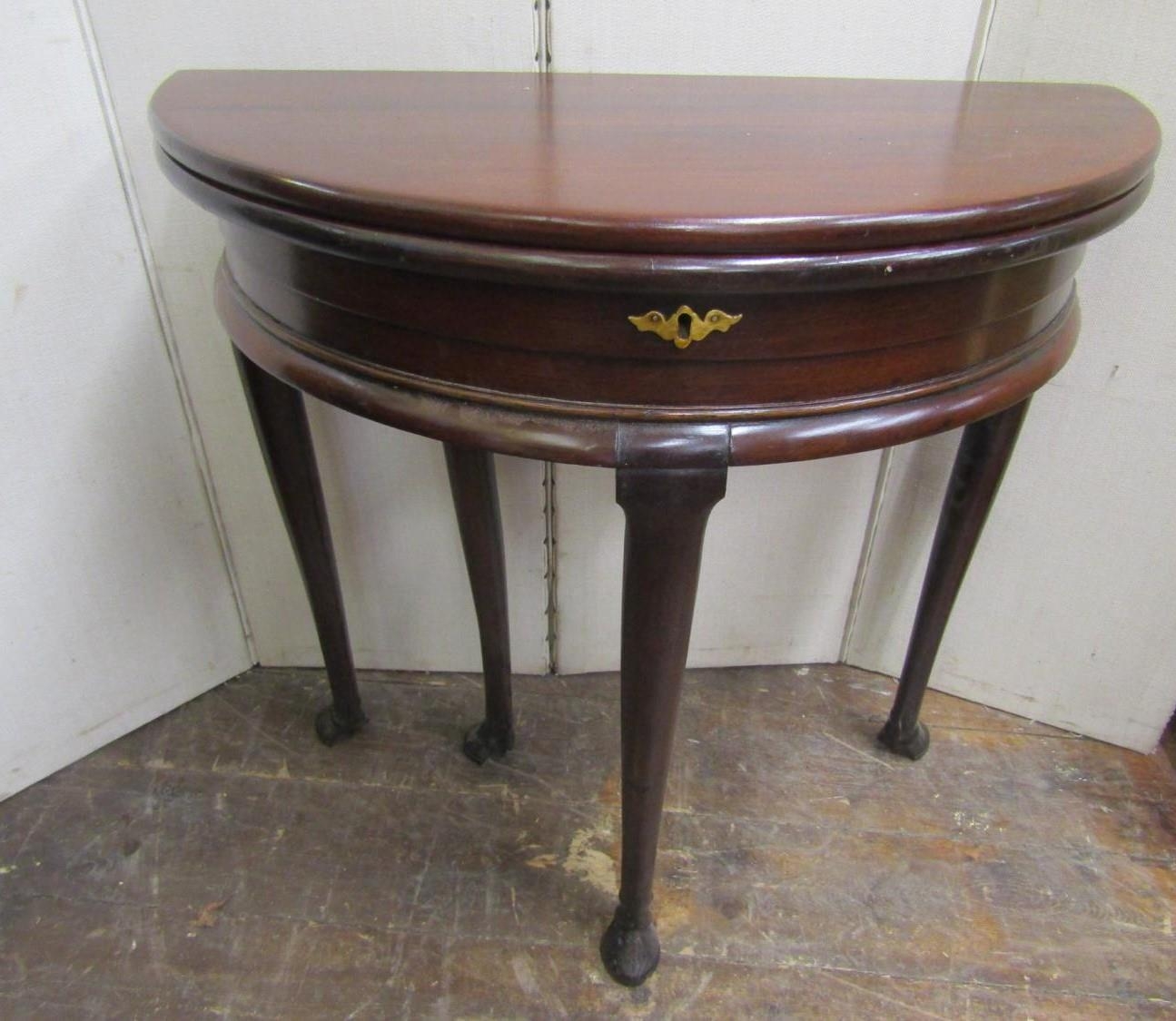 A Georgian mahogany demi-lune fold-over top tea table with enclosed centre, raised on four carved hoof supports, 66cm diameter