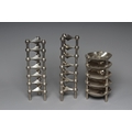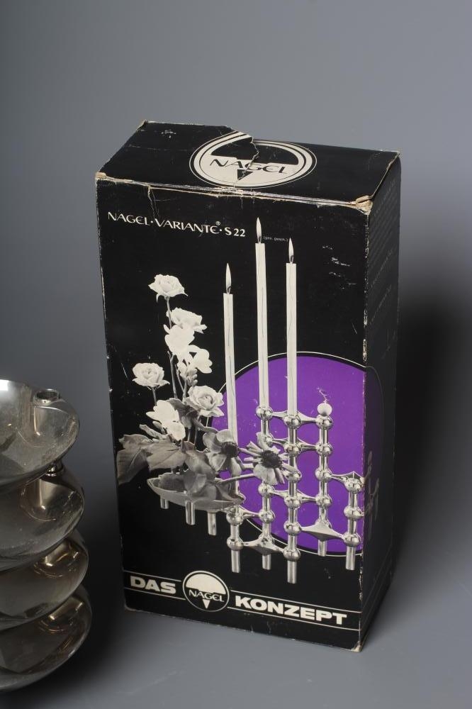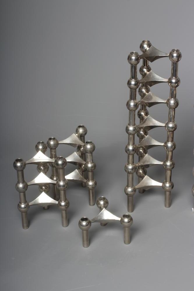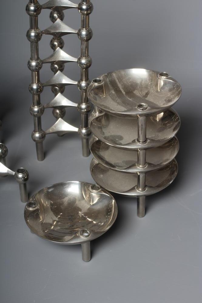 WERNER STOFF FOR NAGEL - a set of fourteen Variante S22 Konzept cast chrome modular triple candle holders, 4" wide, together with five matching and interlocking traylets, 5 1/4" diameter, with original candle holder box (20) (Est. plus 24% premium inc. VAT)