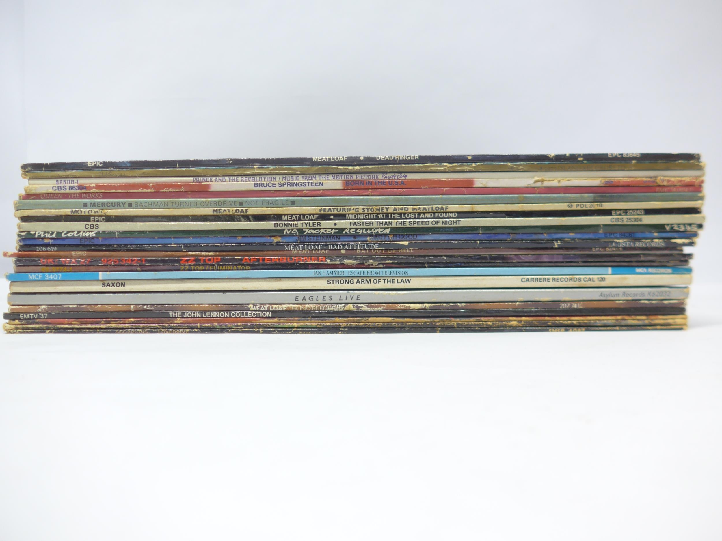 A collection of twenty-two assorted Rock and Pop LPs, artists to include Prince, Bruce Springsteen, Meat Loaf, Roxy Music, Queen, Bachman-Turner Overdrive, Bonnie Tyler, Phil collins, Jim Steinman, ZZ Top, Jan Hammer, Saxon, Eagles, John Lennon, Alice Cooper, Scorpions (22, vinyl and sleeves VG-VG+)