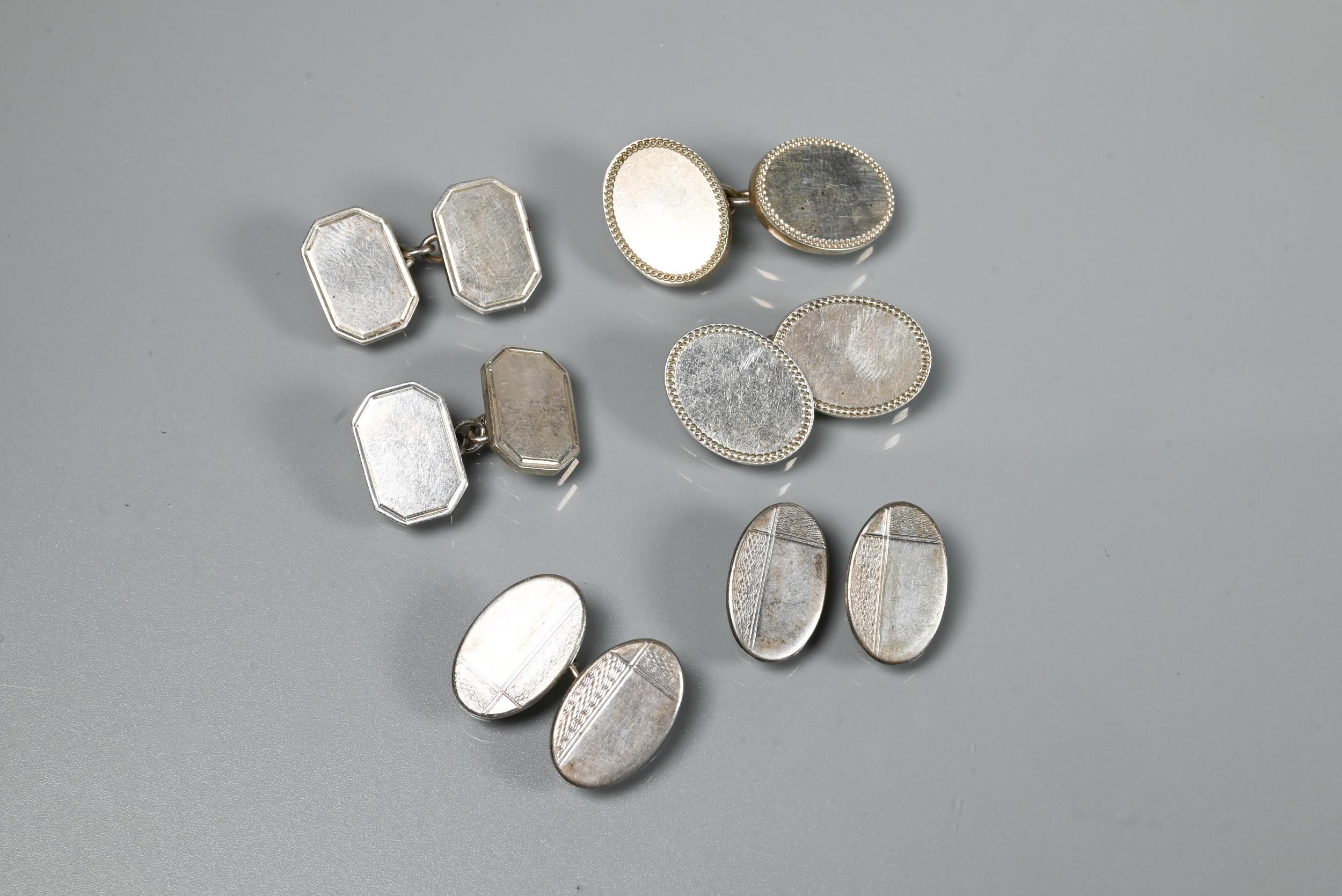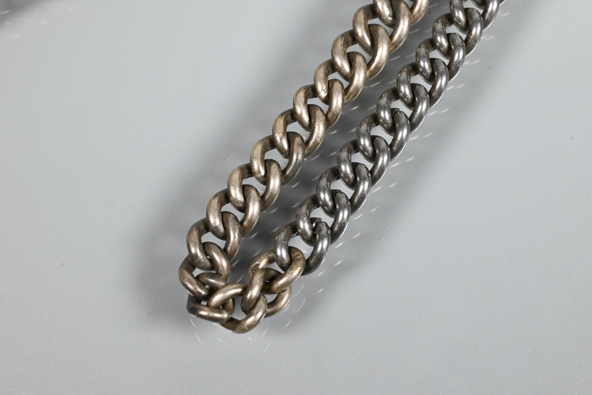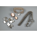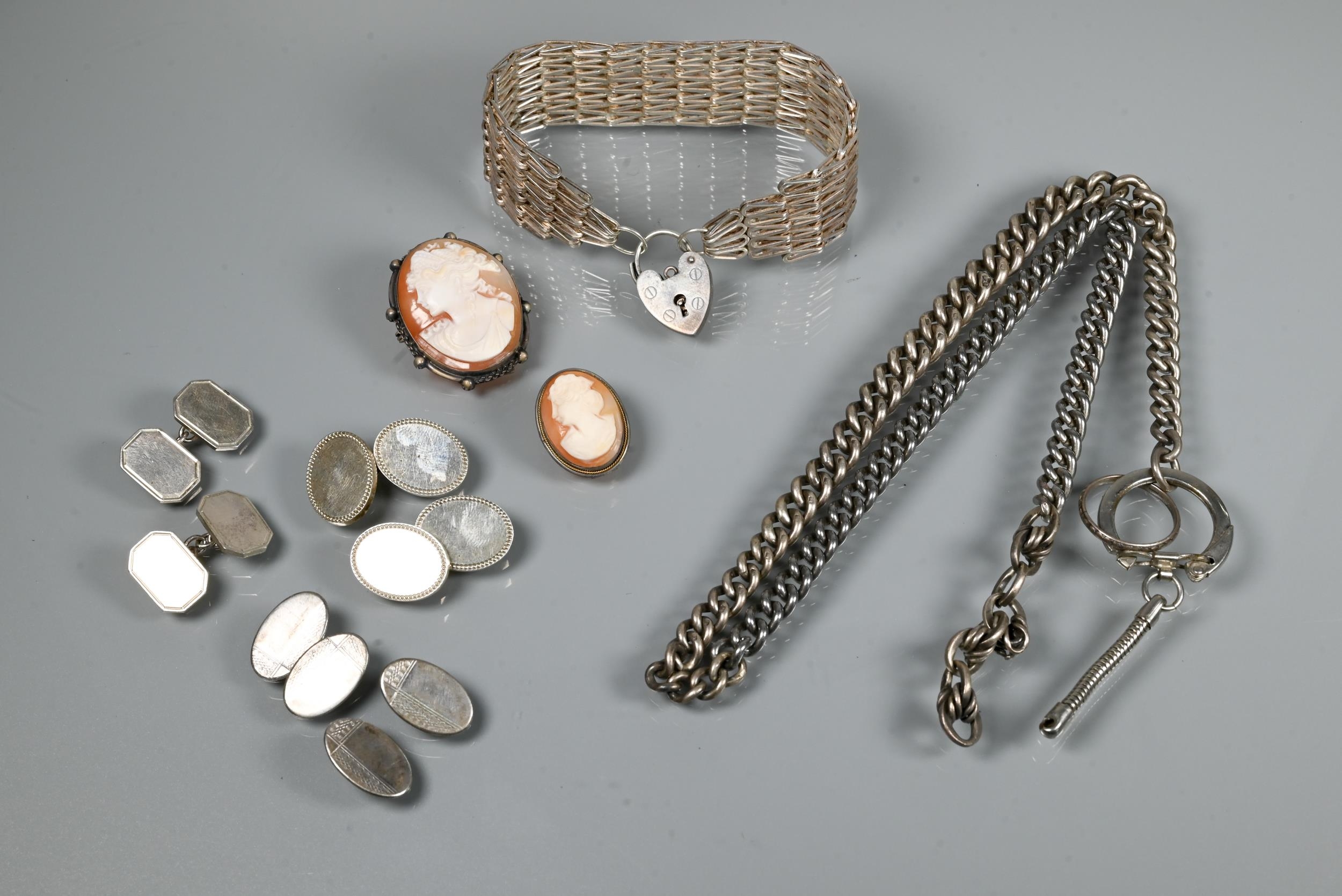 A Victorian silver graduated Albert, four various pairs of silver cufflinks, a silver mesh-link bracelet, two cameo brooches and a fine wedding band