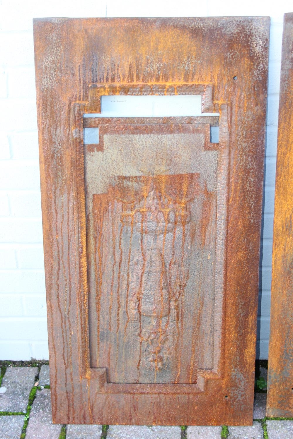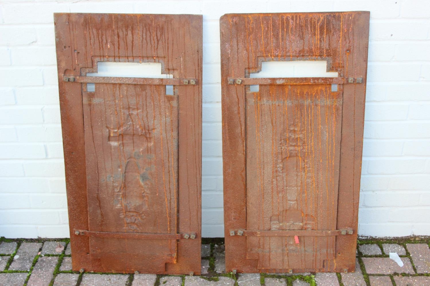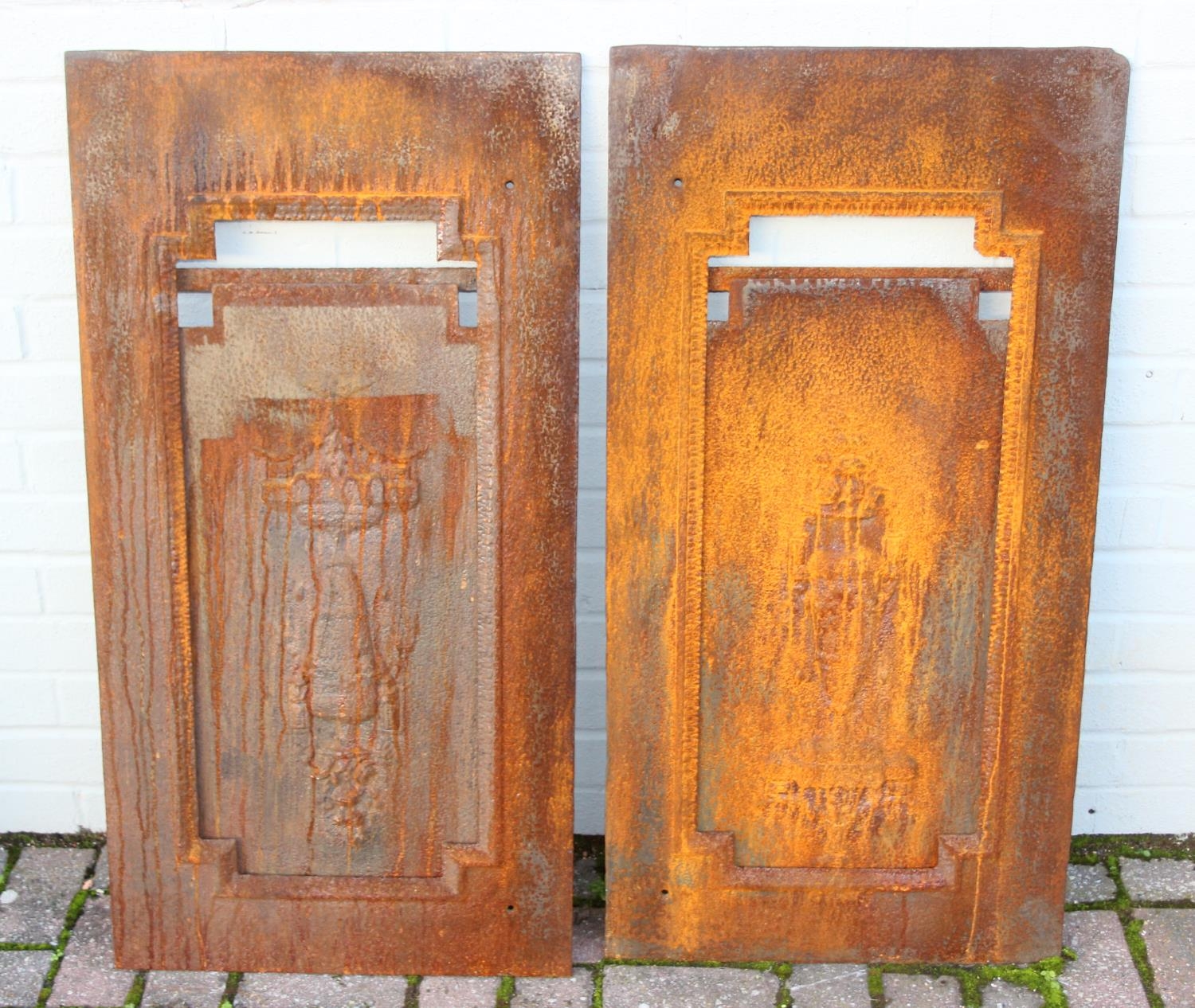 Two antique cast iron fire backs, 51cm x 91cm [2]