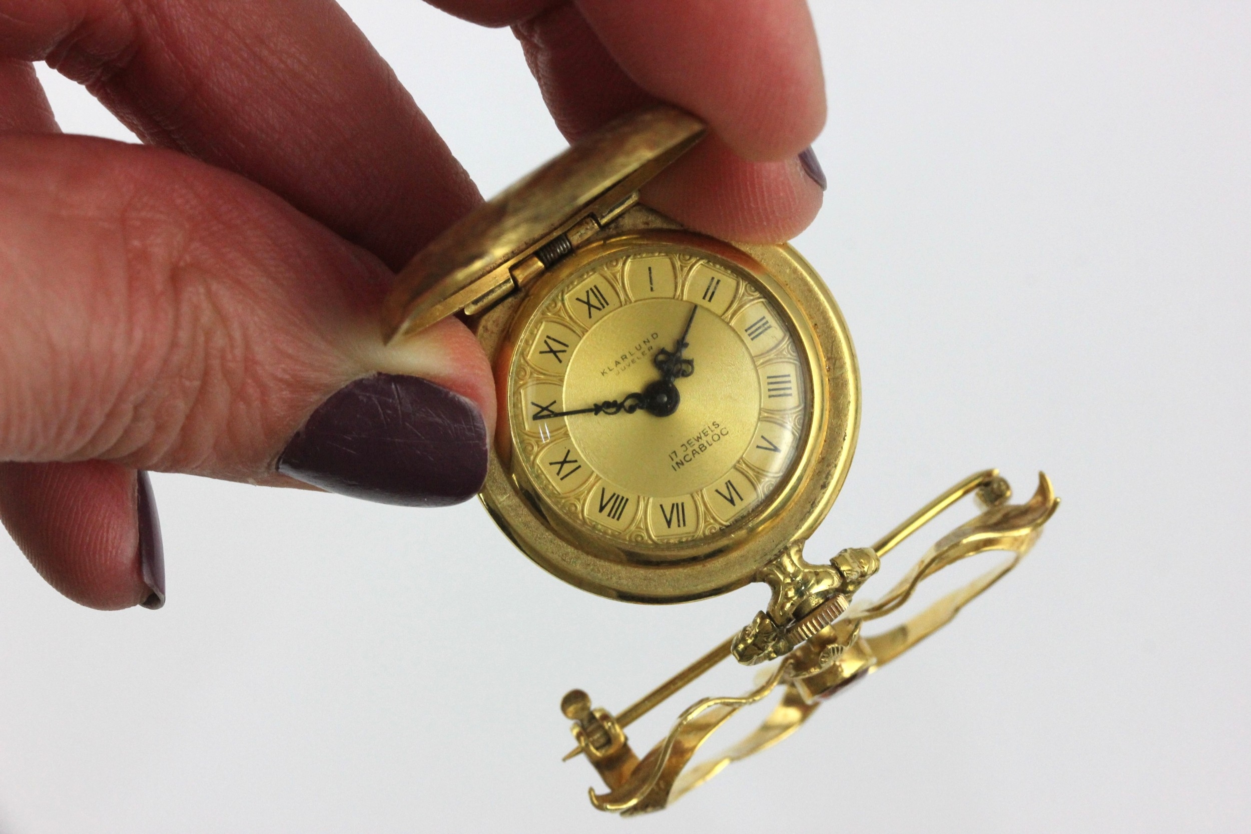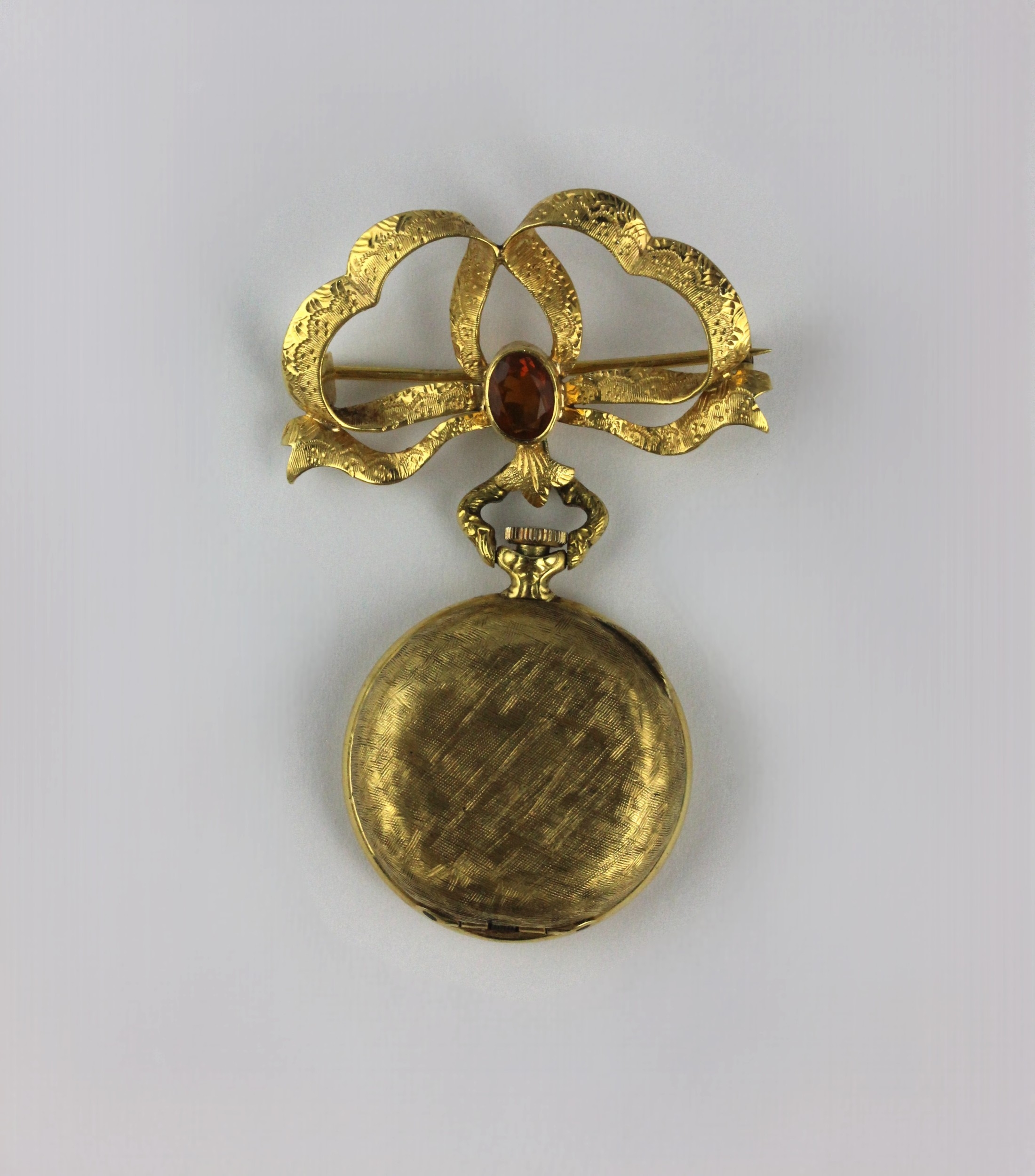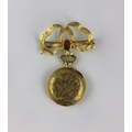A Klarlund gold cased keyless wind hunting case ladies fob watch detailed 18K 0.750 with a gold and citrine set bow brooch, unmarked, gross weight 27g