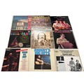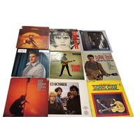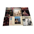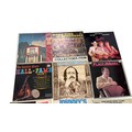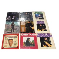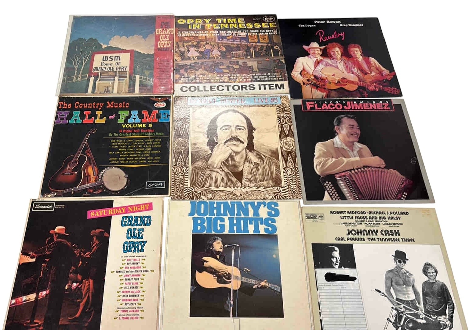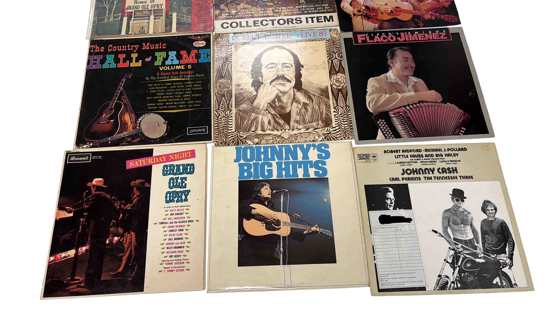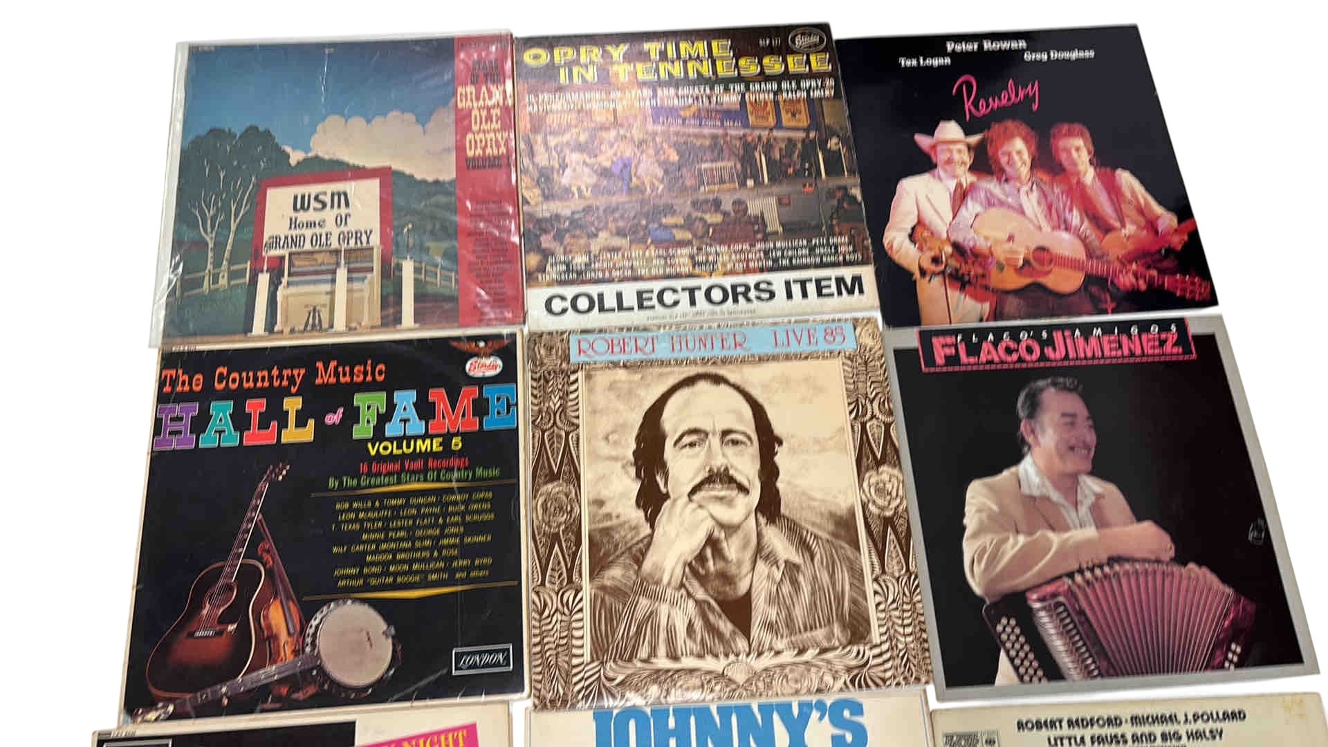 A group of country music vinyl LP records, including Grand Ole Opry-themed compilations and artist albums, with illustrated sleeves featuring Robert Hunter, Flaco Jiménez, Johnny Cash, and others.