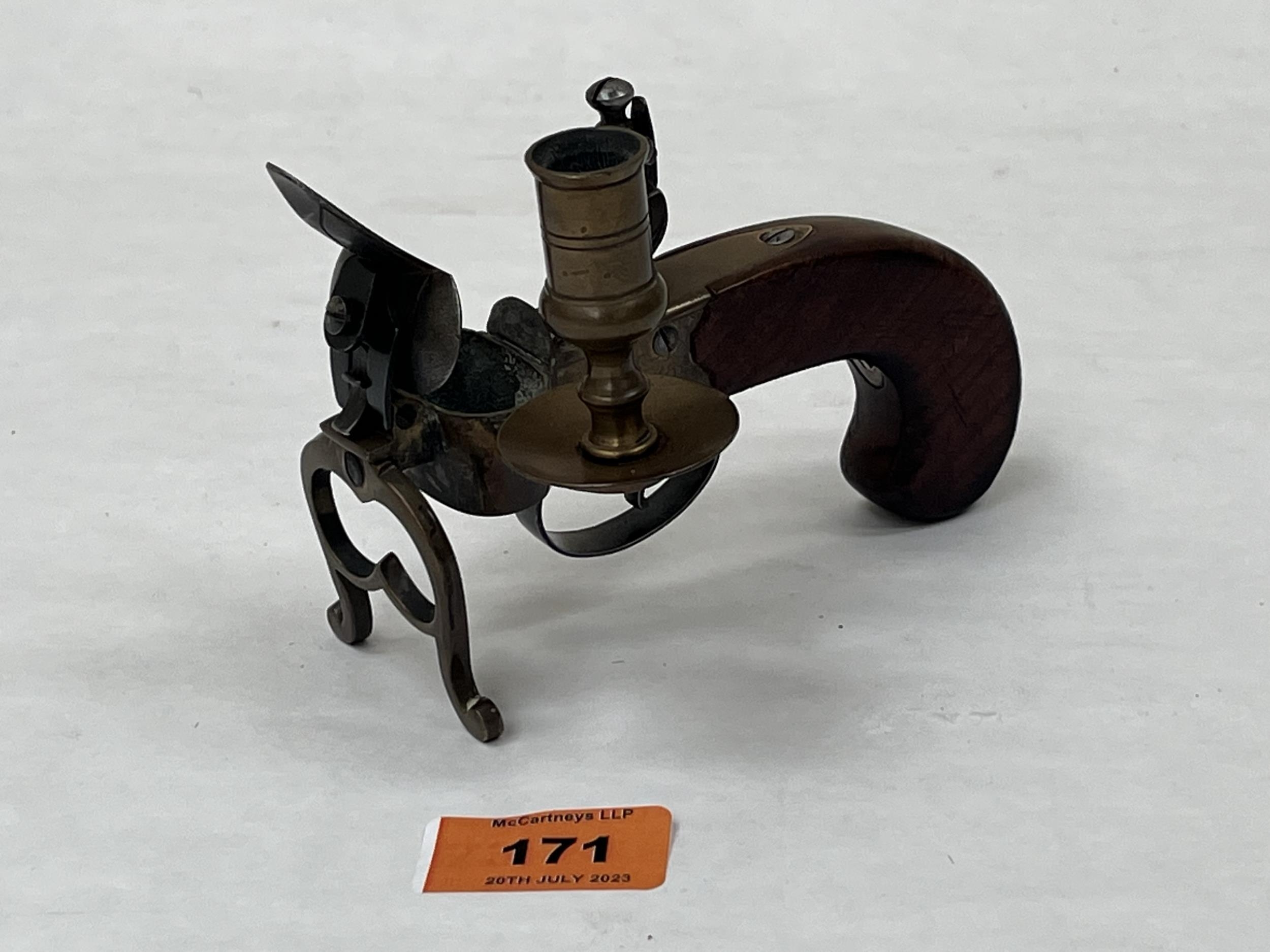A 20th century flintlock table lighter with walnut stock. 5¼' long.
