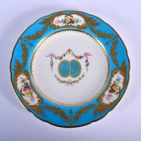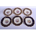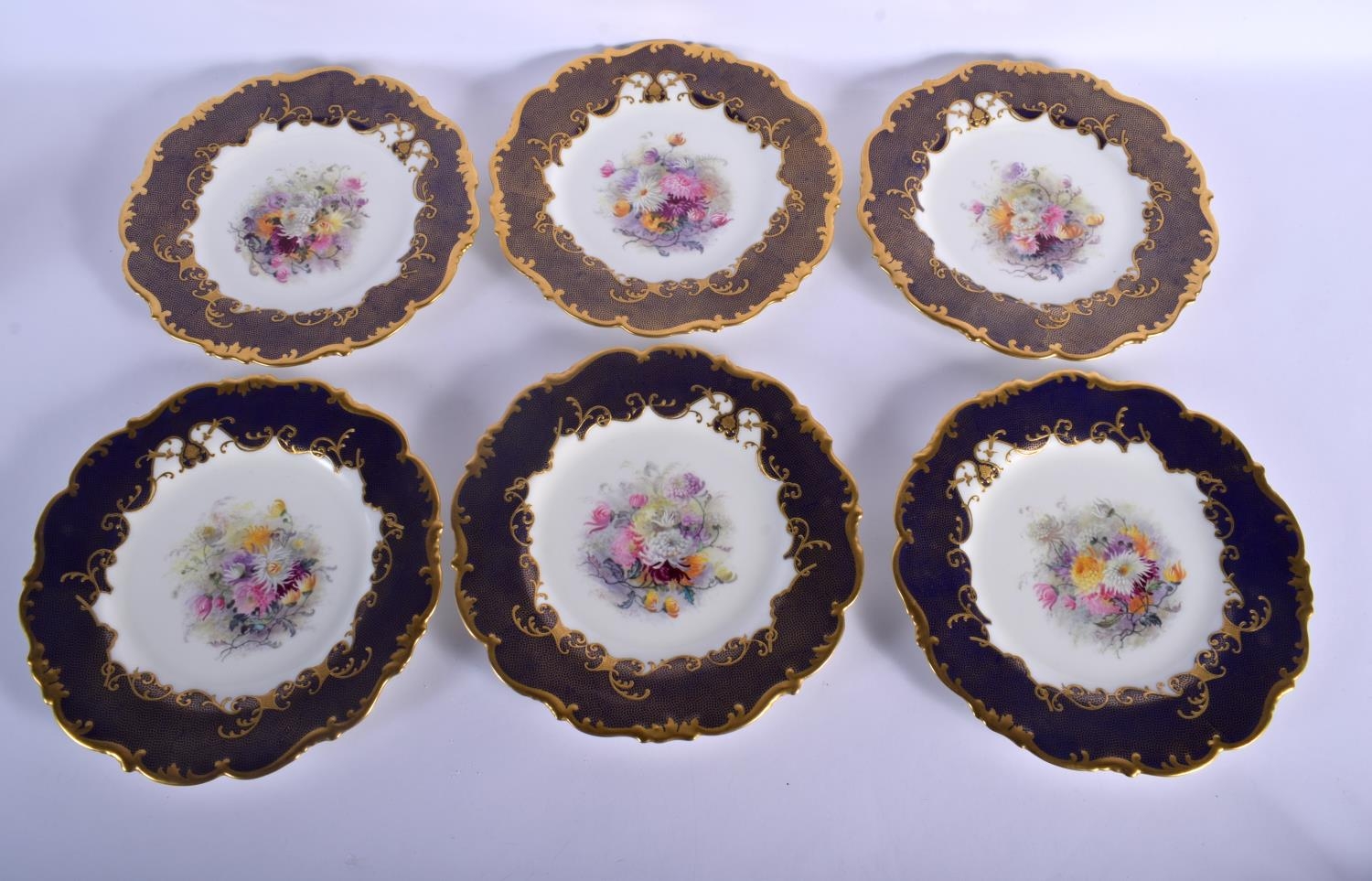 EARLY 20TH C. BROWN -WESTHEAD AND MOORE SET OF SIX PLATES FINELY PAINTED WITH FLOWERS SURROUNDED A HIGHLY GILT BLUE BORDER, RETAIL BY PITKIN & BROOKS, CHICAGO.23cm diameter