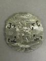 A Chinese dark green jade pierced pendant with carved bat and character decoration to both sides, 2' diameter