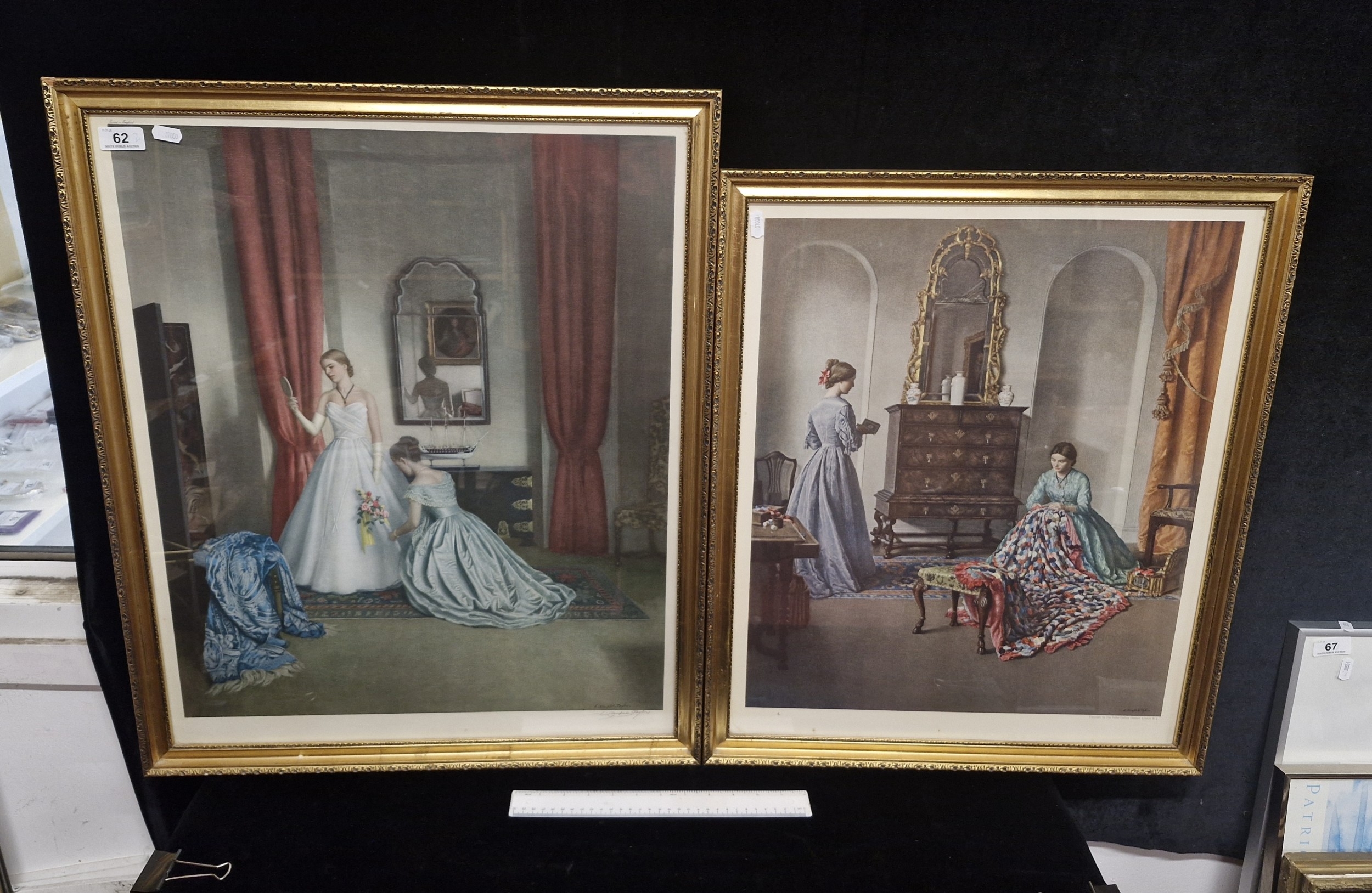 Two quality vintage prints titled 'The Patchwork Quilt' and 'Her First Ball Dress' after 'Leonord Cambell Taylor'. 'Her First Ball Dress' example hand signed by artist in pencil lower right. Both housed in gilt frames behind glass.