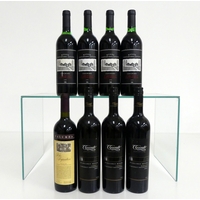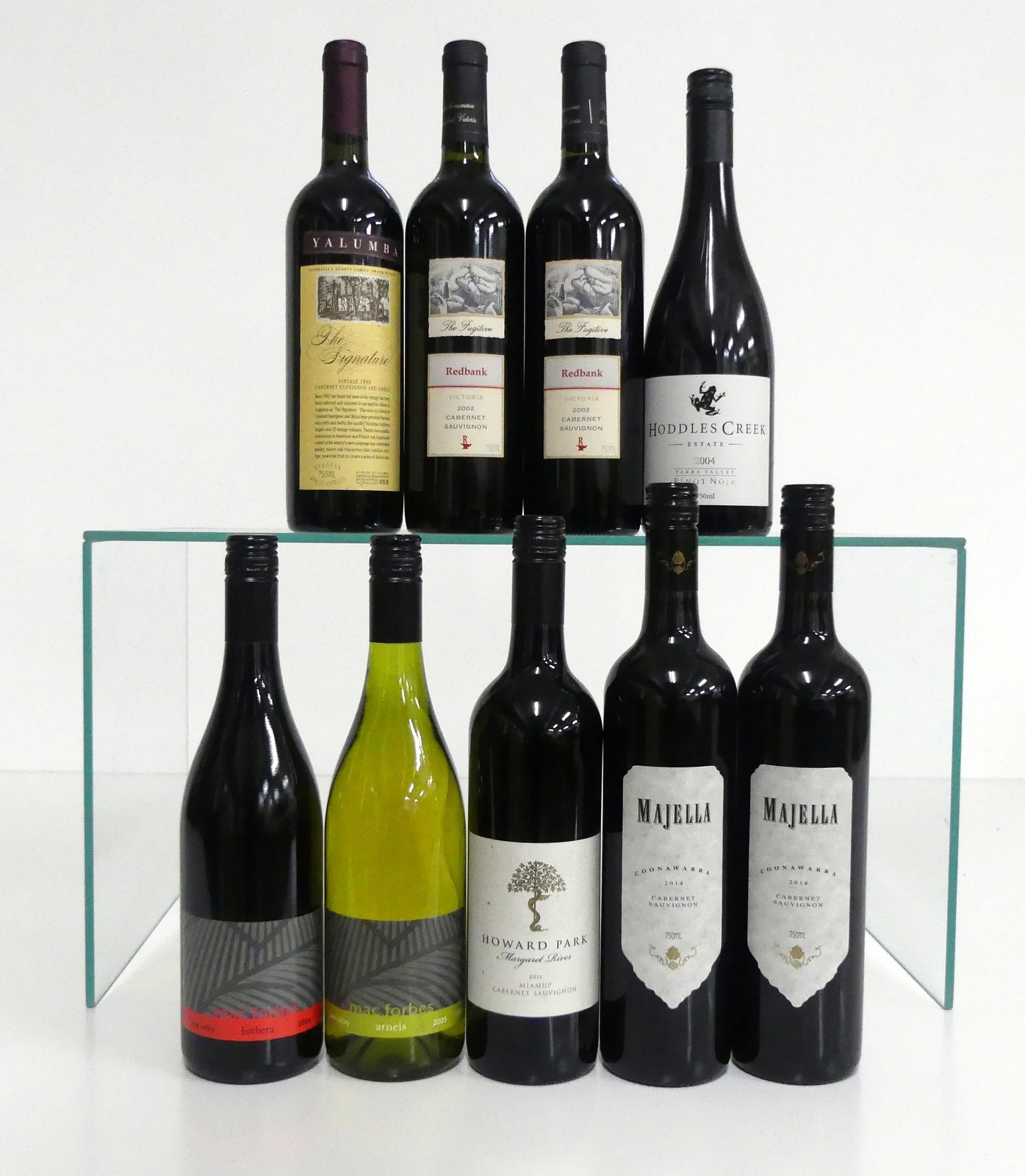 1 bt Yalumba The Signature 1999 i.n 2 bts Redbank The Fugitive Cabernet Sauvignon 2002 Victoria i.n 1 bt Hoddles Creek Estate Pinot Noir 2004 Yarra Valley hf 1 bt Mac forbes Barbera 2004 King Valley hf 1 bt Mac forbes Arneis 2005 Yarra Valley hf 1 bt Howard Park Miamup Cabernet Sauvignon 2011 Margaret River hf 2 bts Majella Cabernet Sauvignon 2014 Coonawarra Above 9 bottles