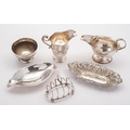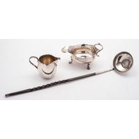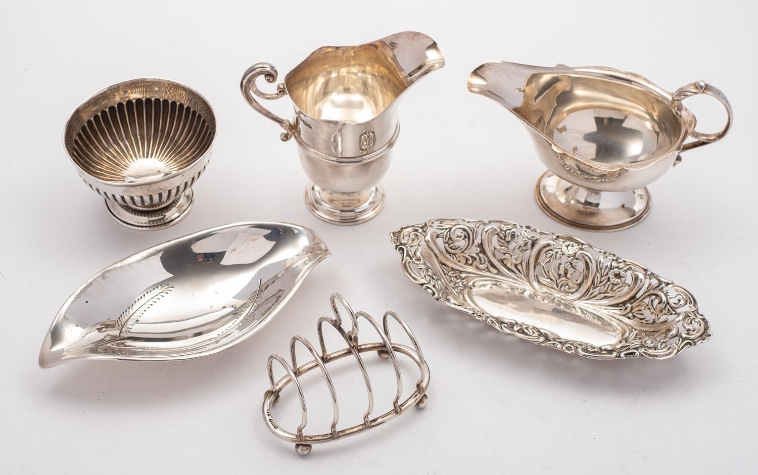 A mixed group of silver including; a helmet shaped cream jug by Mappin Brothers, Sheffield 1895, a Sheffield silver sauce boat, Birmingham bon bon dish of oval form, a Birmingham breakfast tray toast rack, a Sheffield pipe rest/ ashtray by Frank Cobb & Co Ltd and a small silver bowl, 416gms., (13.4ozs.), gross, (6)