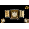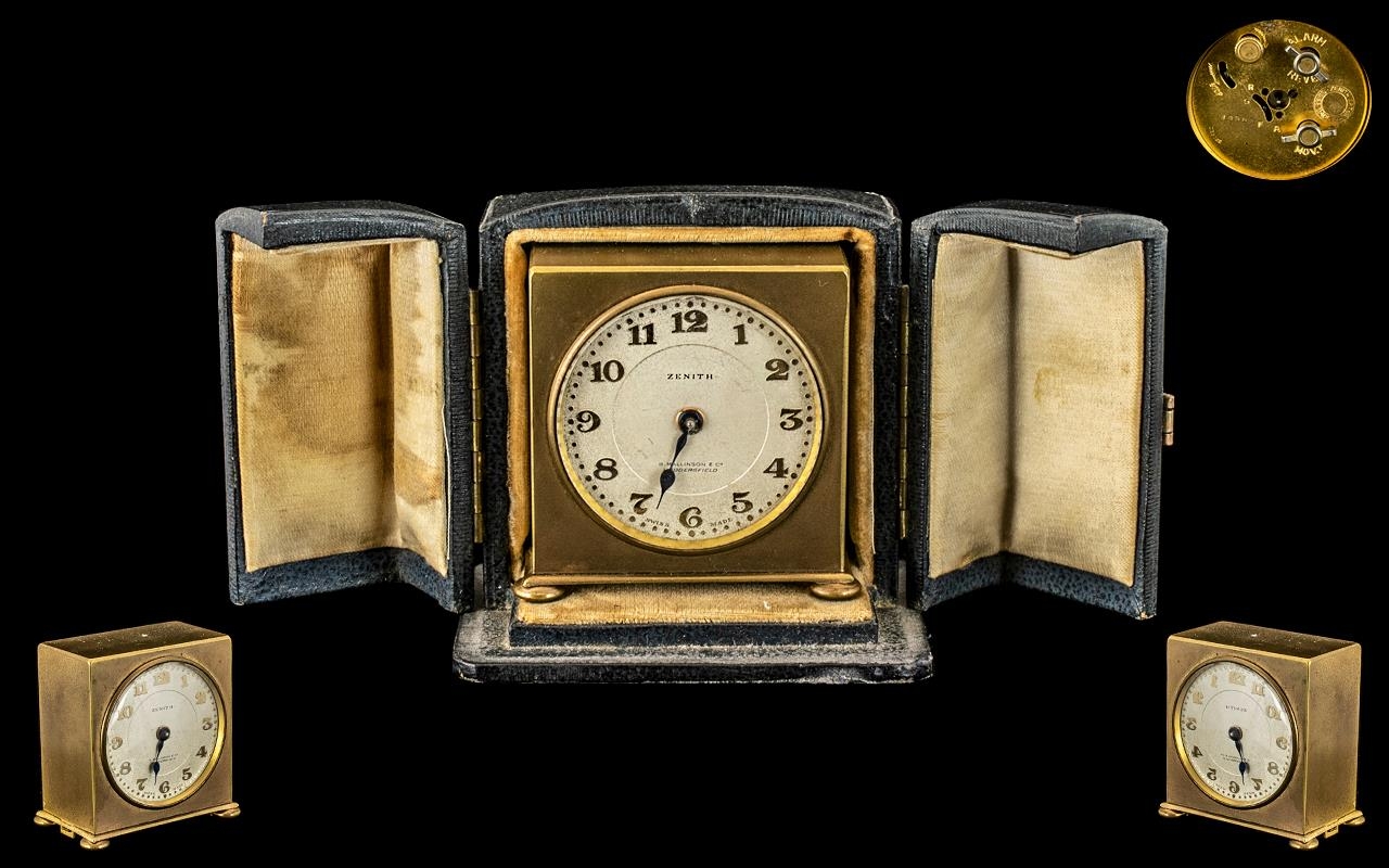 Zenith Watch Company Excellent Quality Gilt Metal Square Shaped Small Travel Clock in fitted leather case, circa 1930s. Features Alarm facility. Signed to dial. Size 2'' x 2'' - 5 x 5 cm. Working at time of Cataloging.