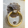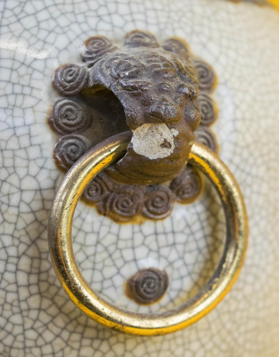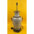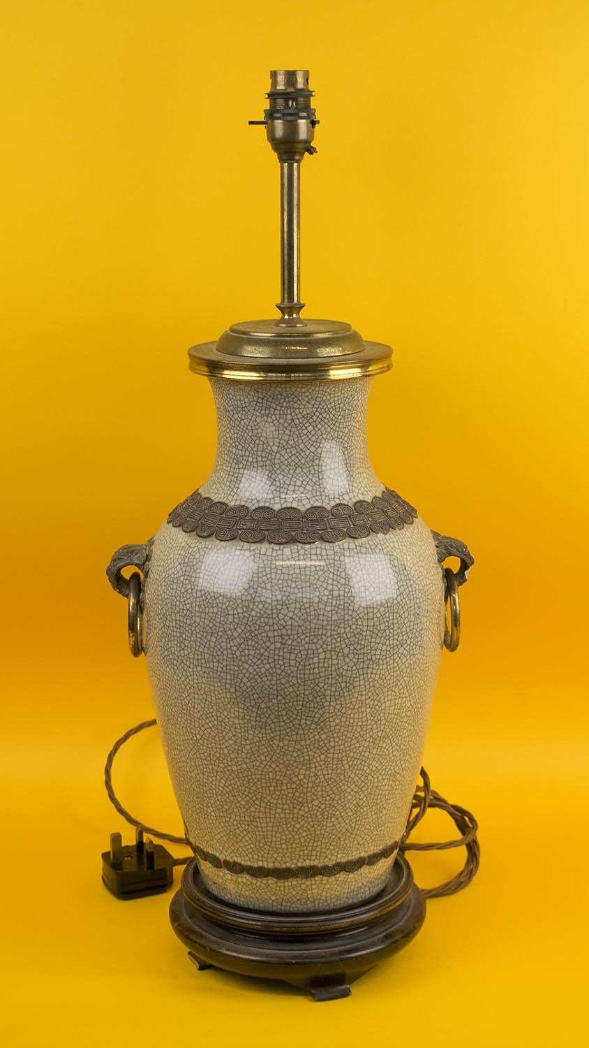 TABLE LAMP, Chinese ceramic of vase form with brass rings and hardwood stand. (slight faults)