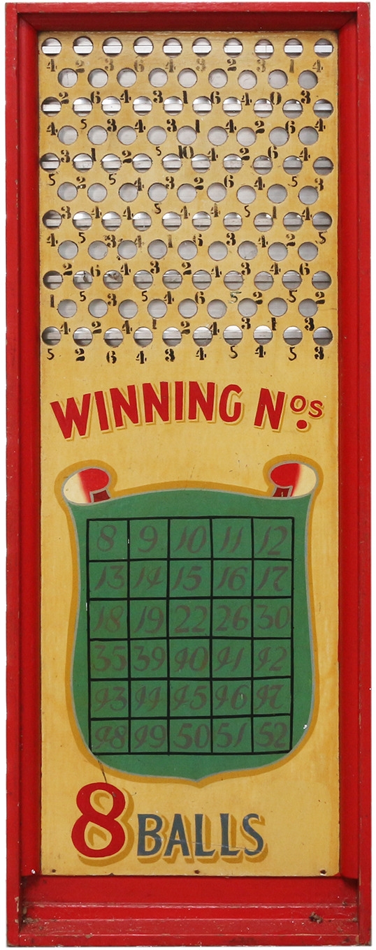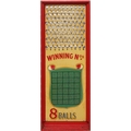 Roll Down Board, score any of the numbers indicated by rolling down 8 ping-pong balls to win. In good condition with old hand-painted artwork.
