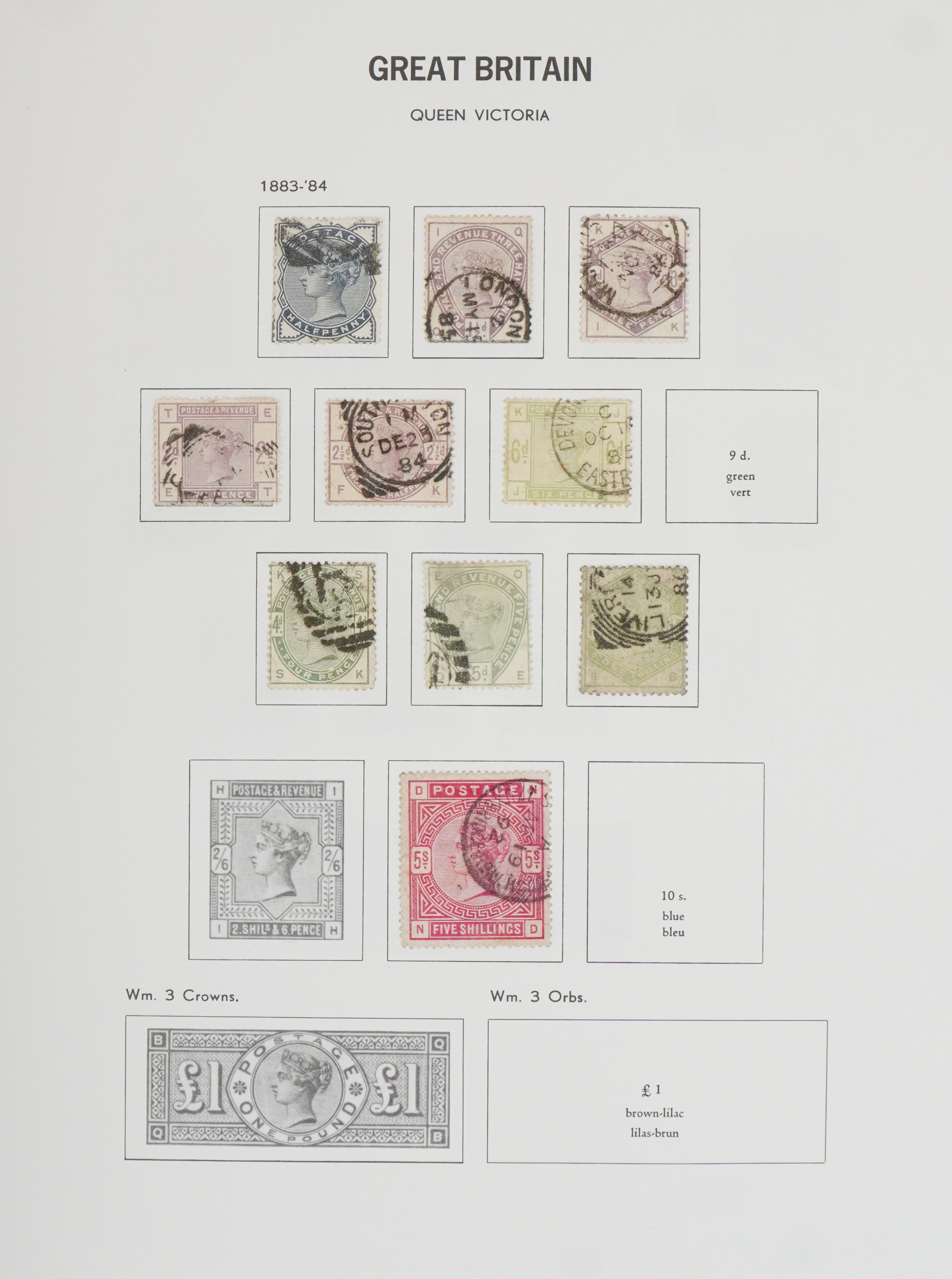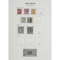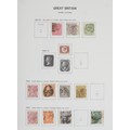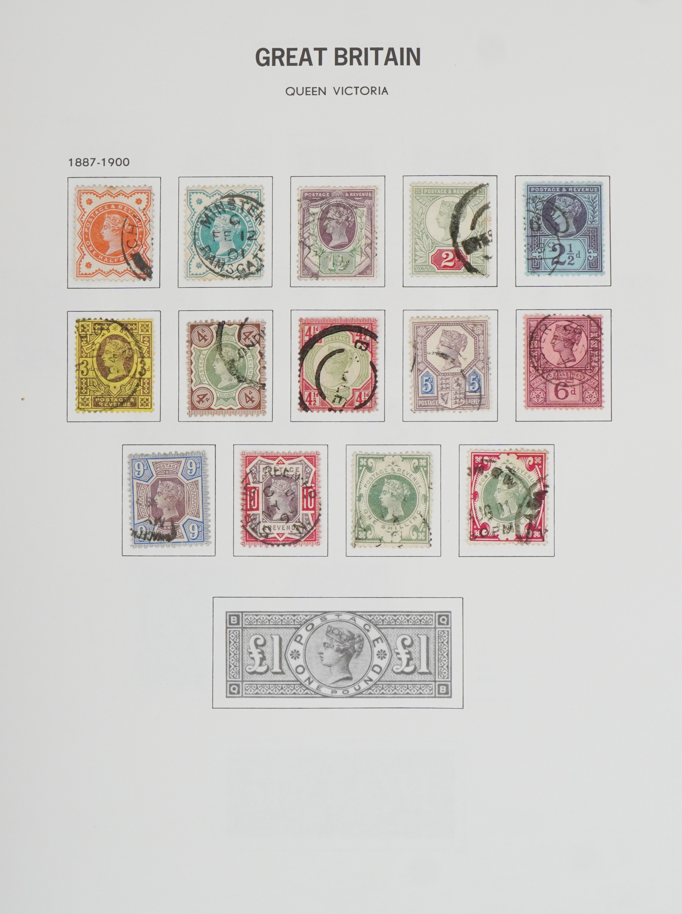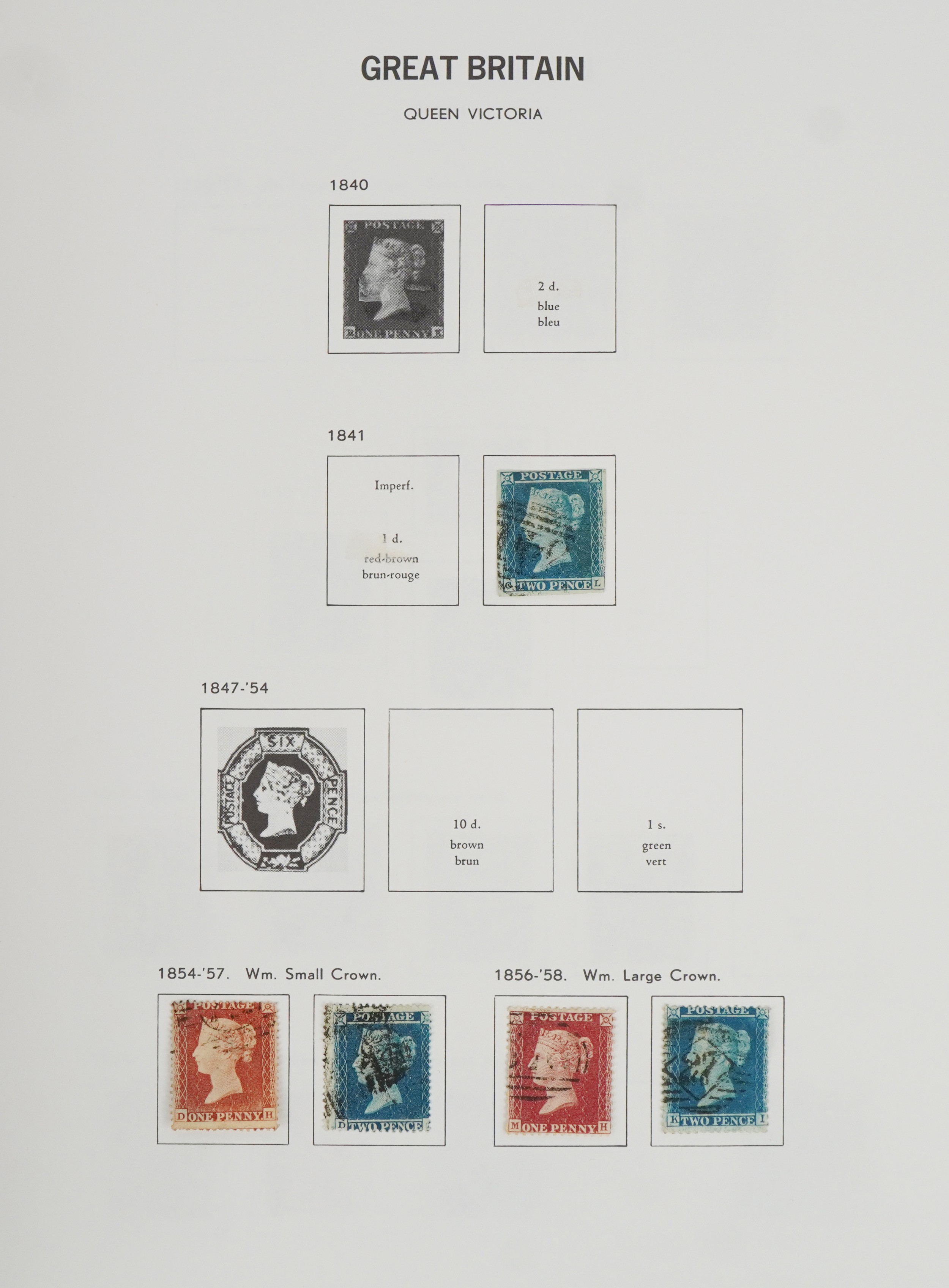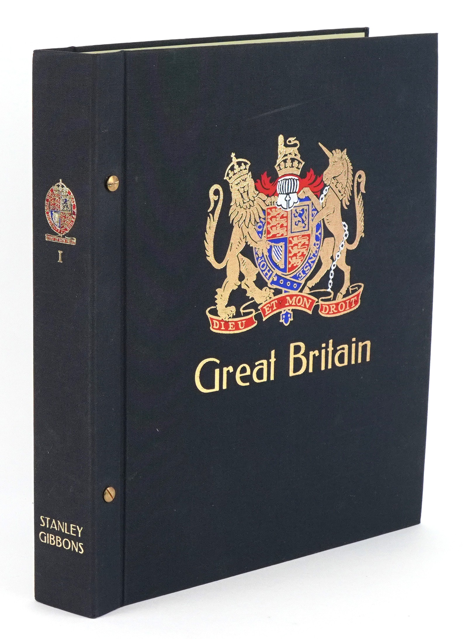 British 19th century and later line engraved and surface printed stamps including Two Penny Blues, Penny Reds, some Victorian surface printed stamps with wing margins, high values, 1887-1900 Jubilee issue up to one shilling, Edward VII 1902-1910 up to five shillings, George V, George VI and Queen Elizabeth II, housed in a black Great Britain stamp album with slip in sleeve.