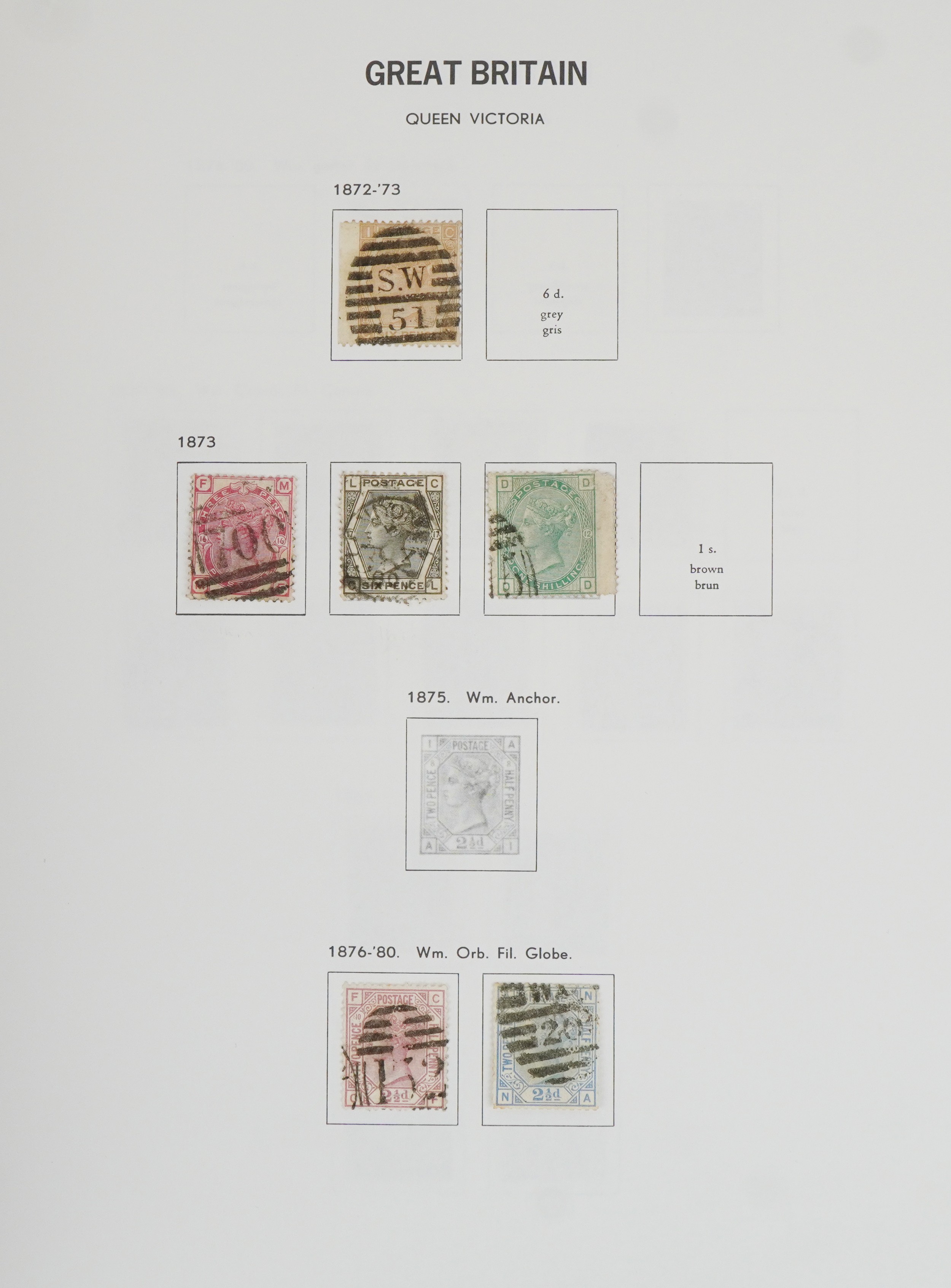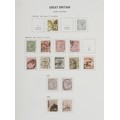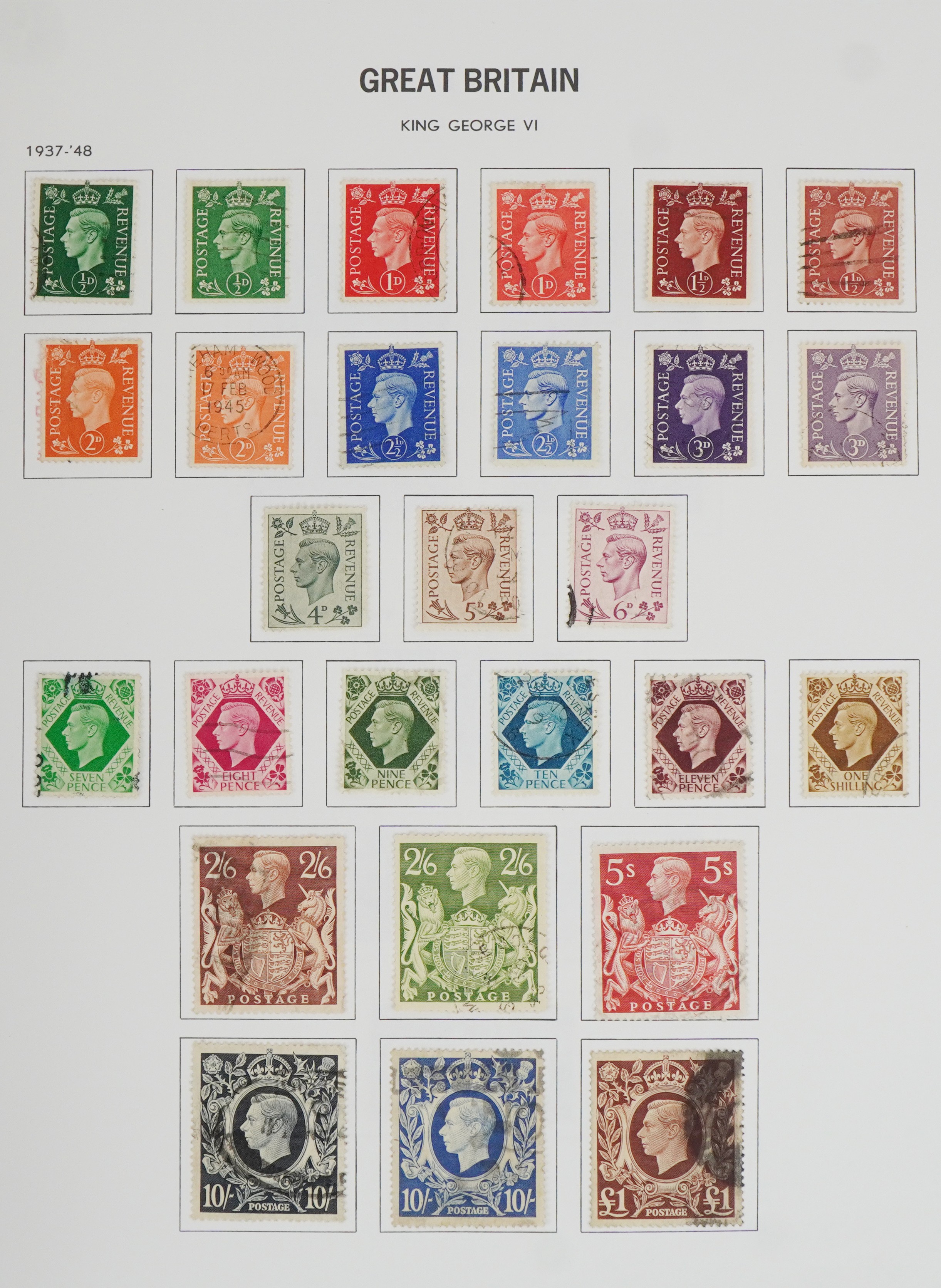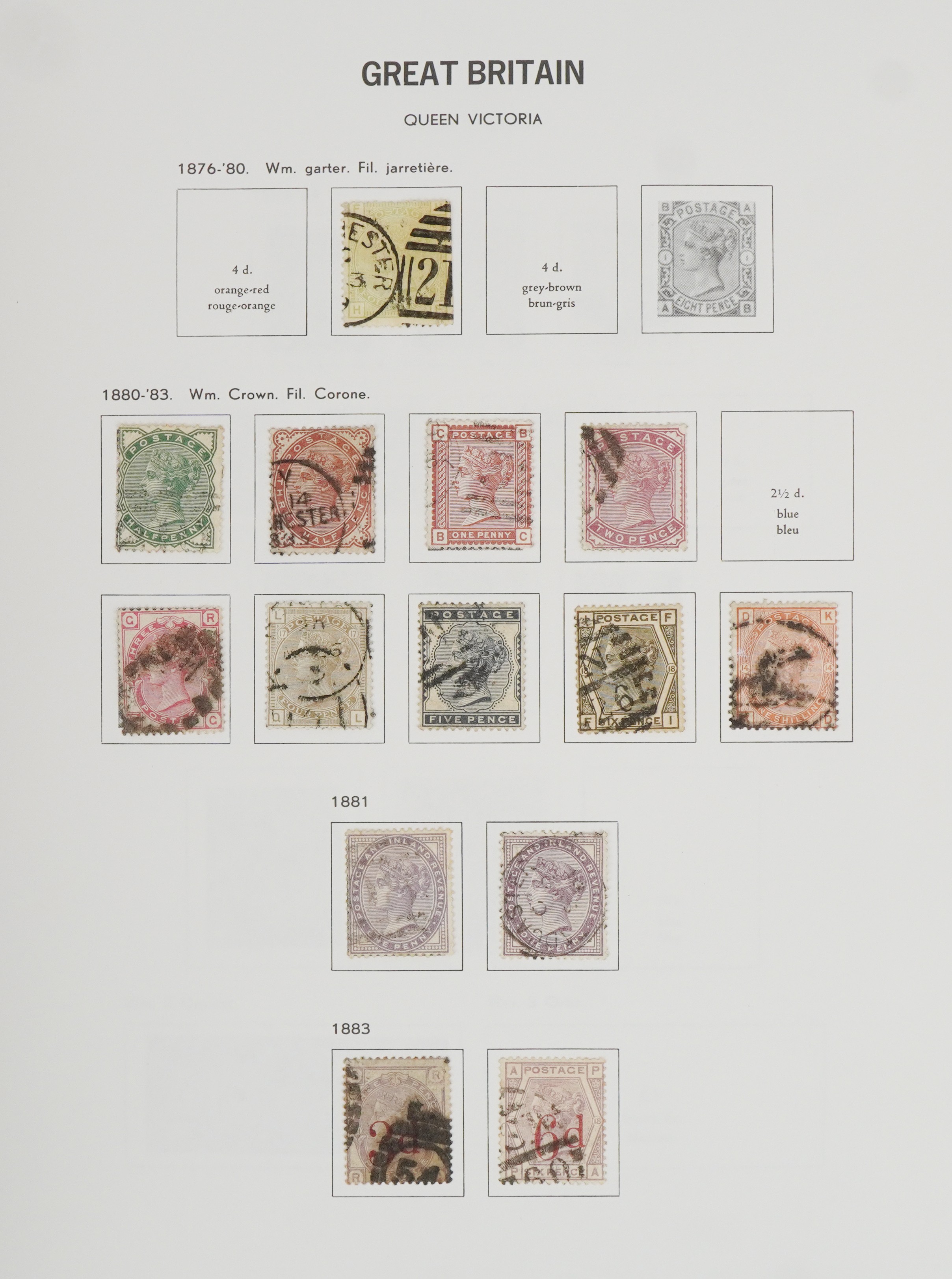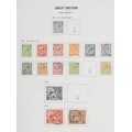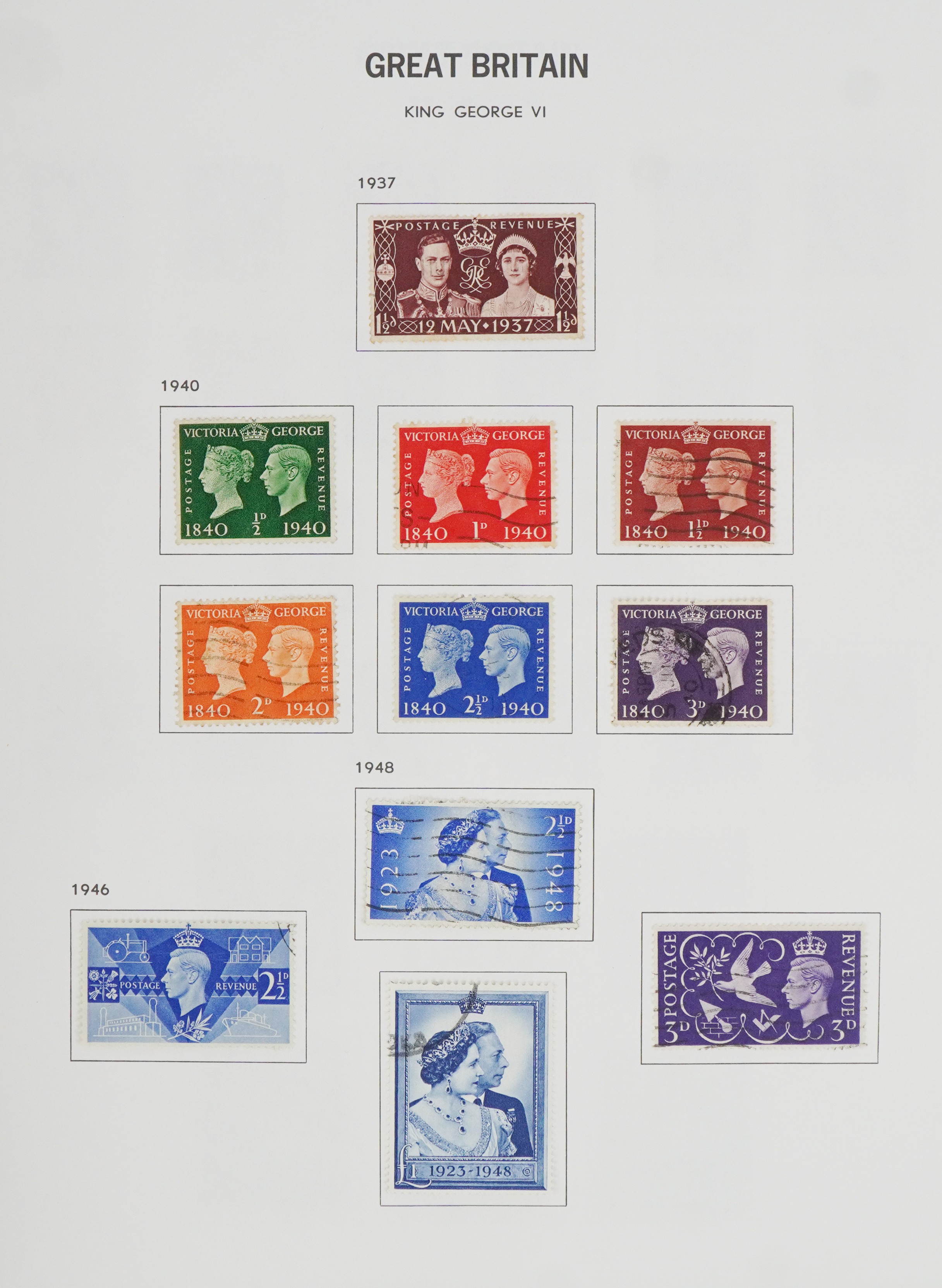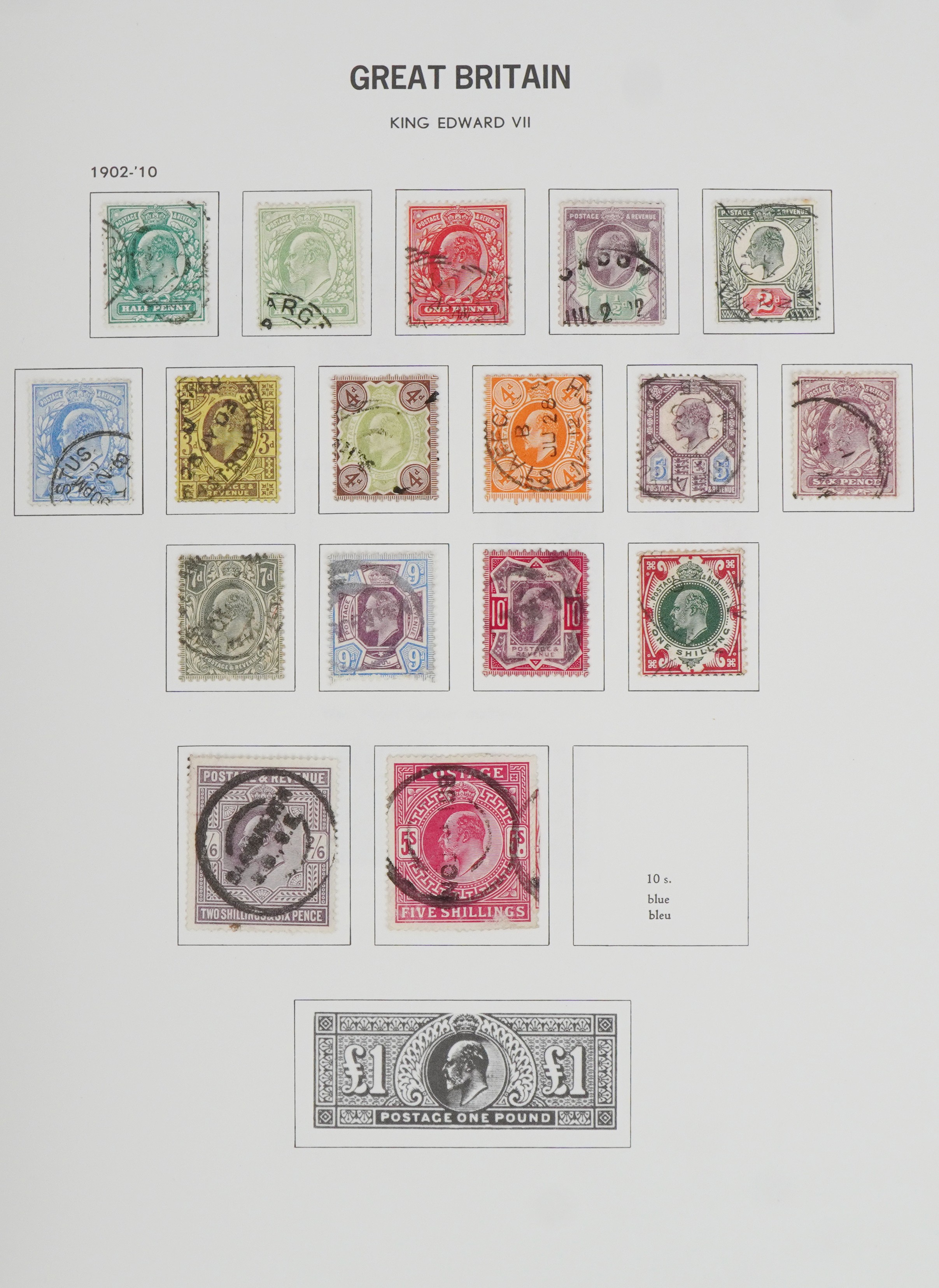 British 19th century and later line engraved and surface printed stamps including Two Penny Blues, Penny Reds, some Victorian surface printed stamps with wing margins, high values, 1887-1900 Jubilee issue up to one shilling, Edward VII 1902-1910 up to five shillings, George V, George VI and Queen Elizabeth II, housed in a black Great Britain stamp album with slip in sleeve.