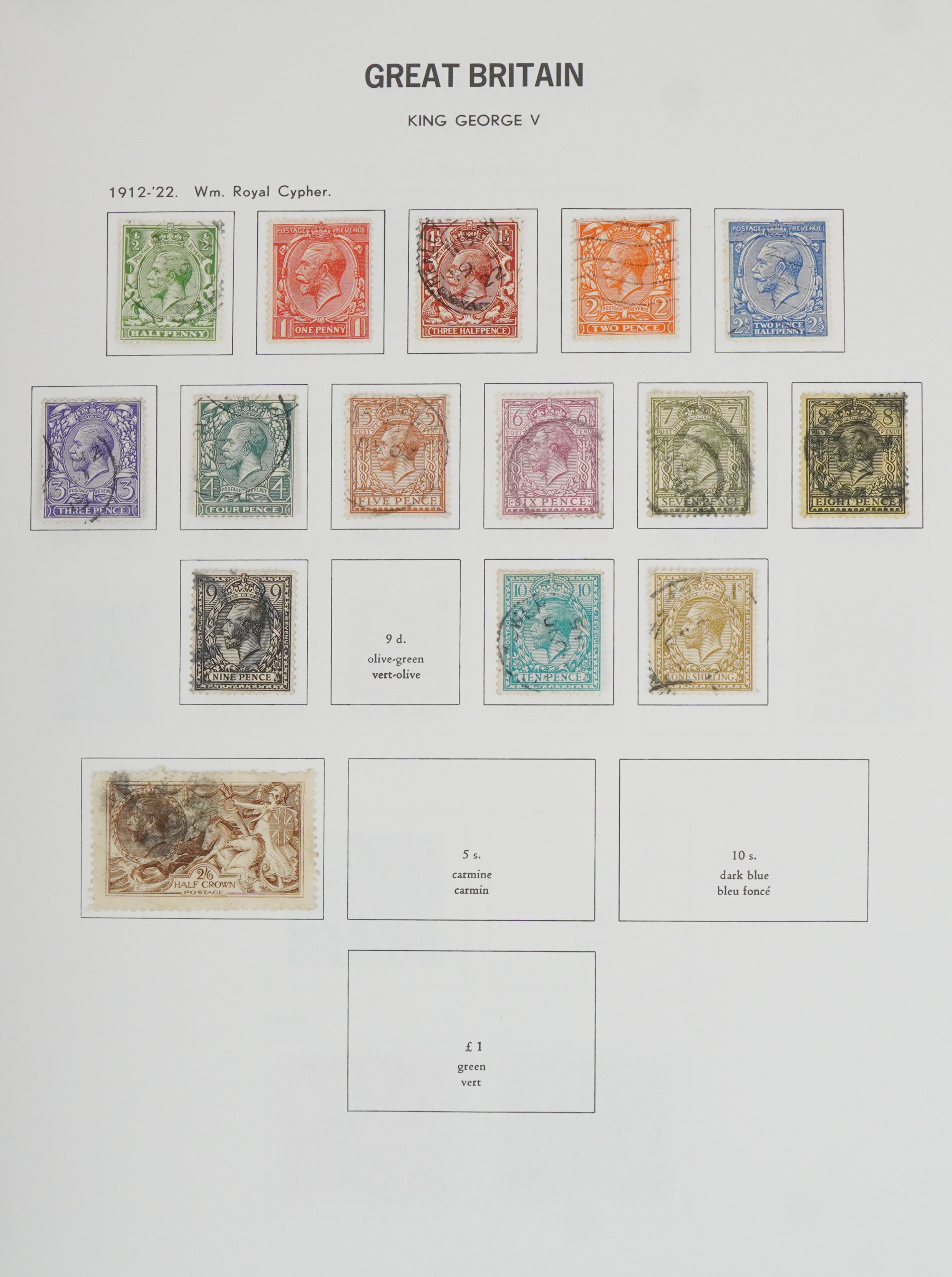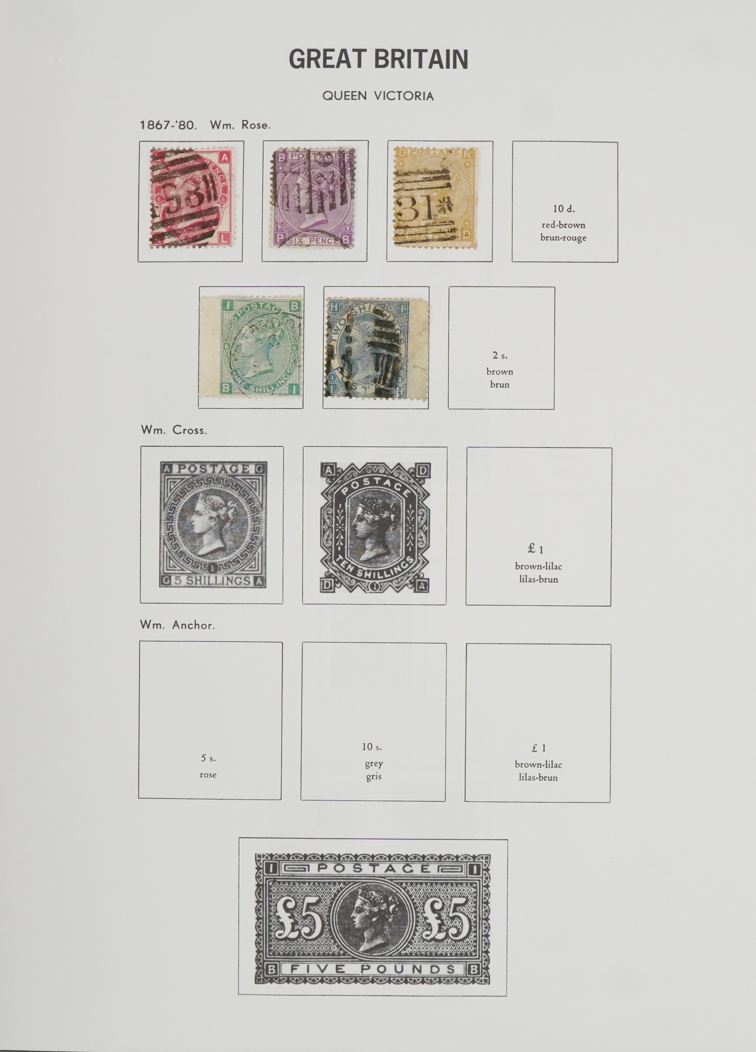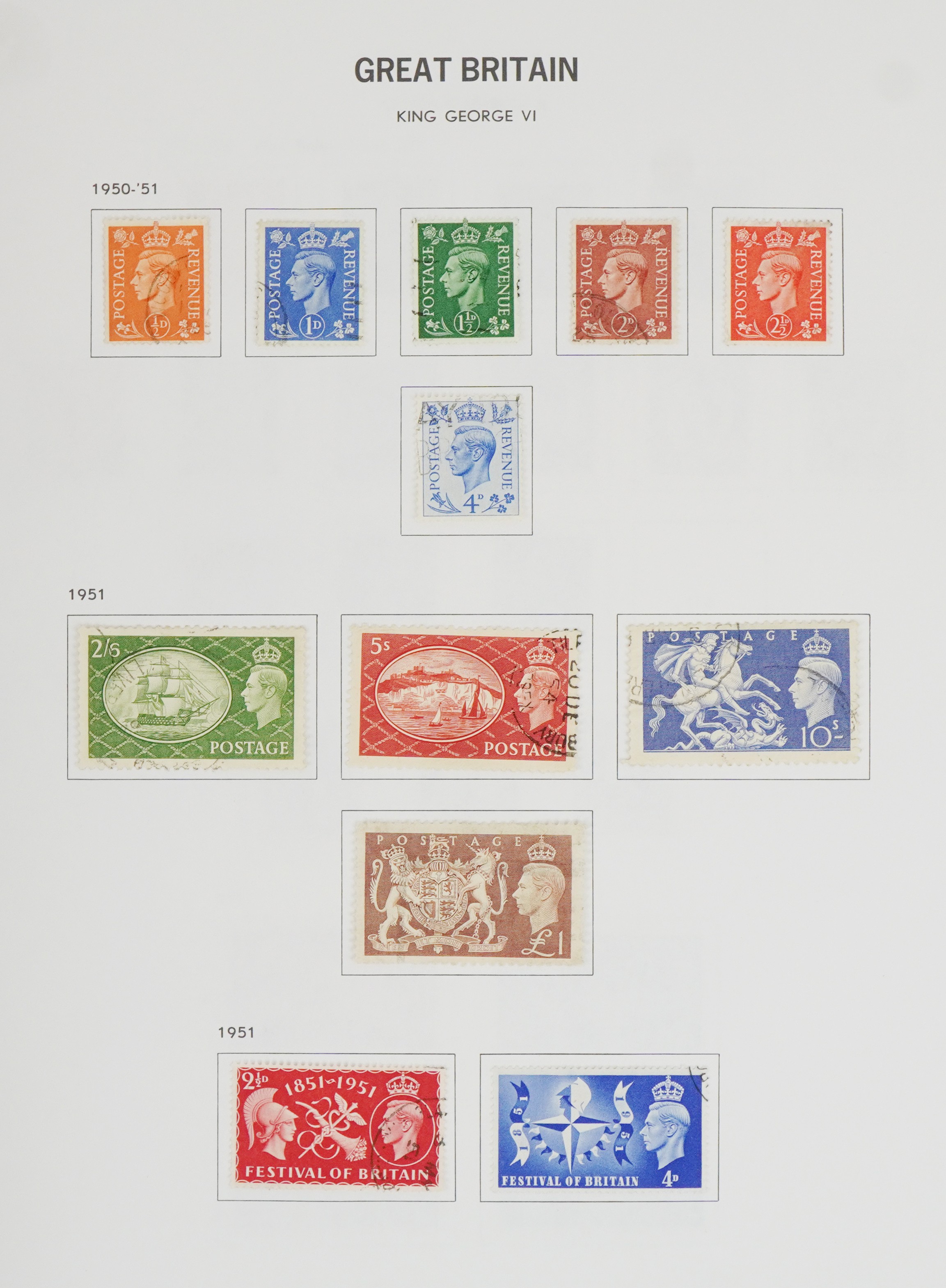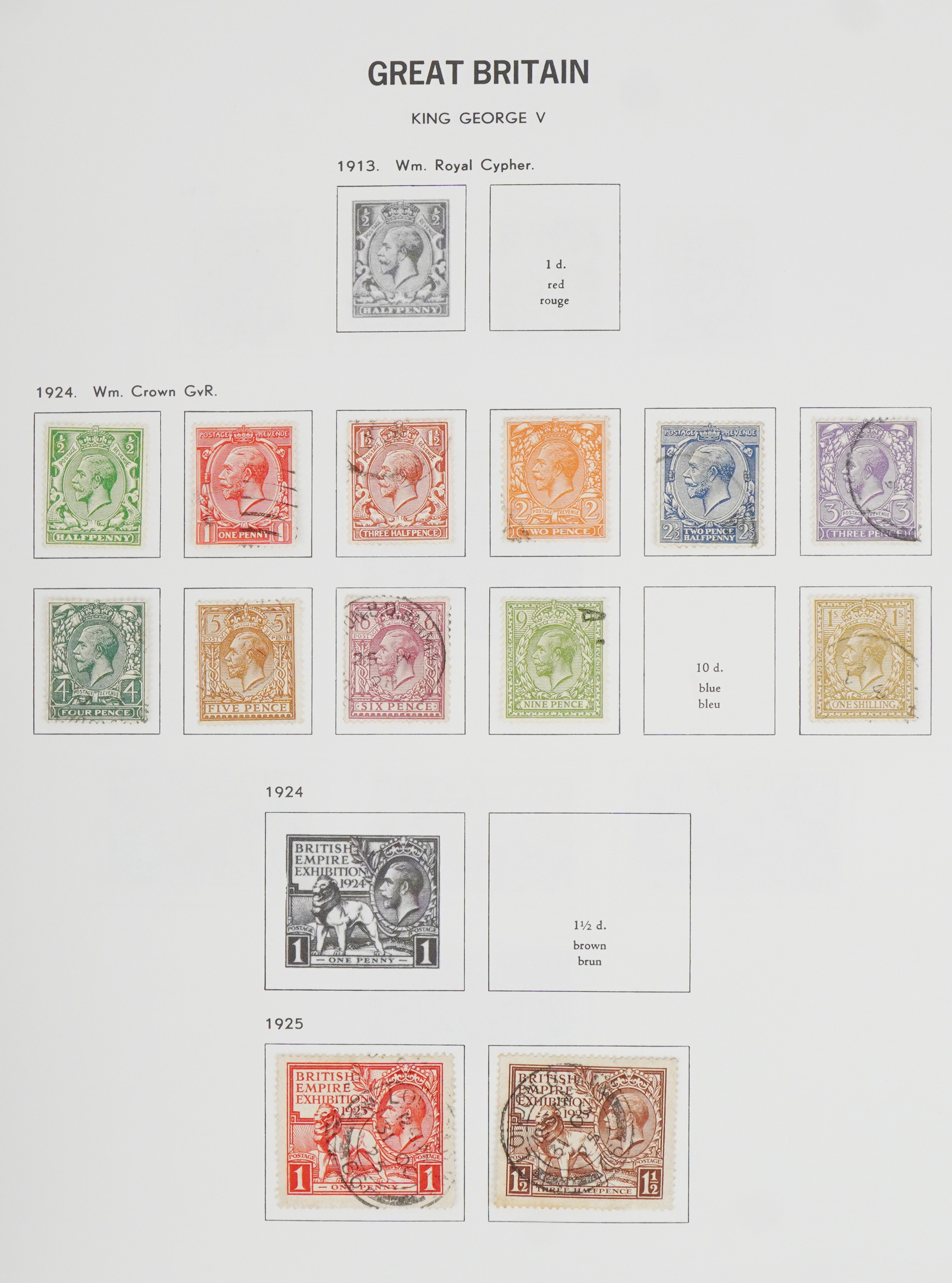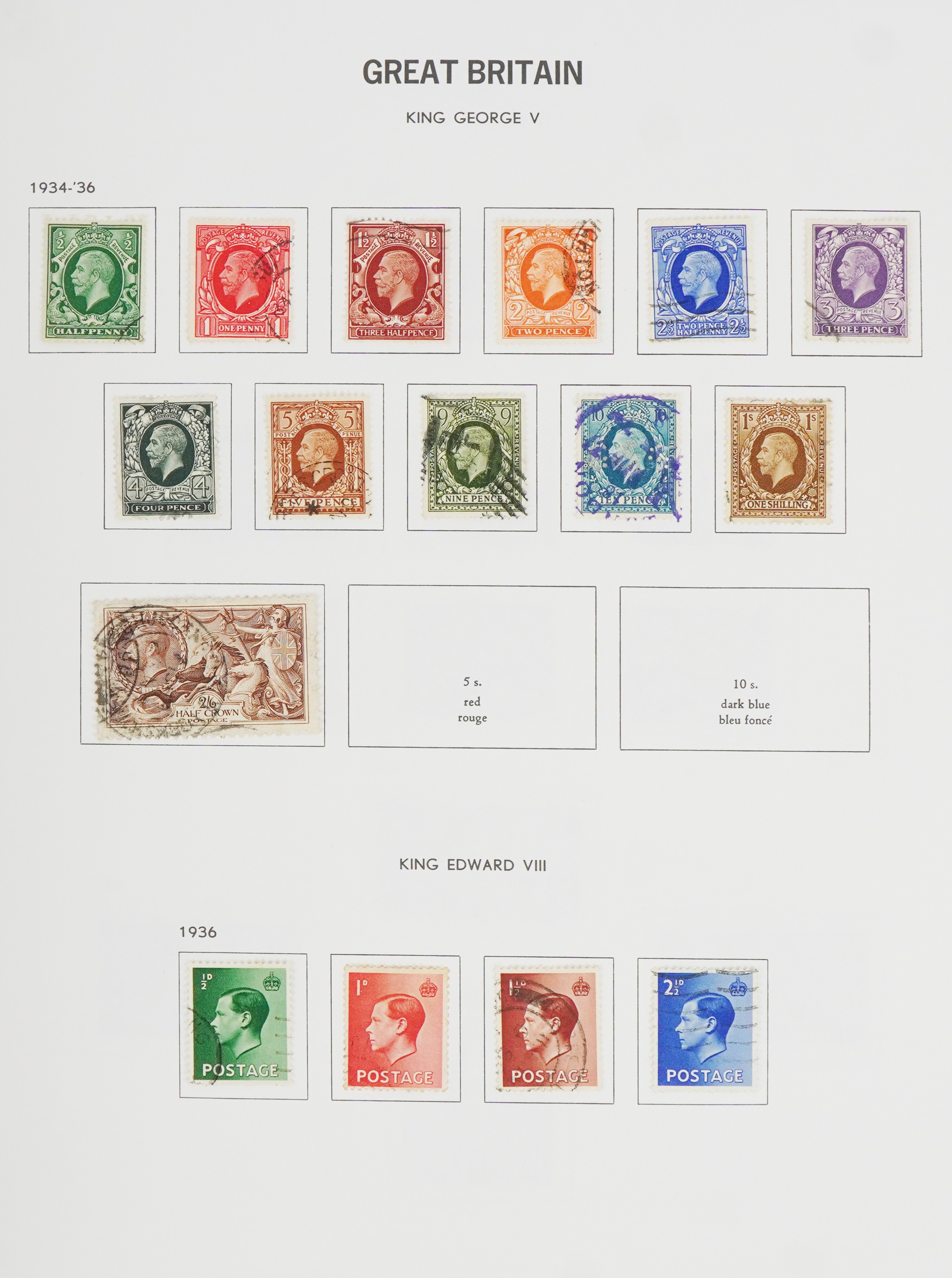 British 19th century and later line engraved and surface printed stamps including Two Penny Blues, Penny Reds, some Victorian surface printed stamps with wing margins, high values, 1887-1900 Jubilee issue up to one shilling, Edward VII 1902-1910 up to five shillings, George V, George VI and Queen Elizabeth II, housed in a black Great Britain stamp album with slip in sleeve.