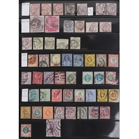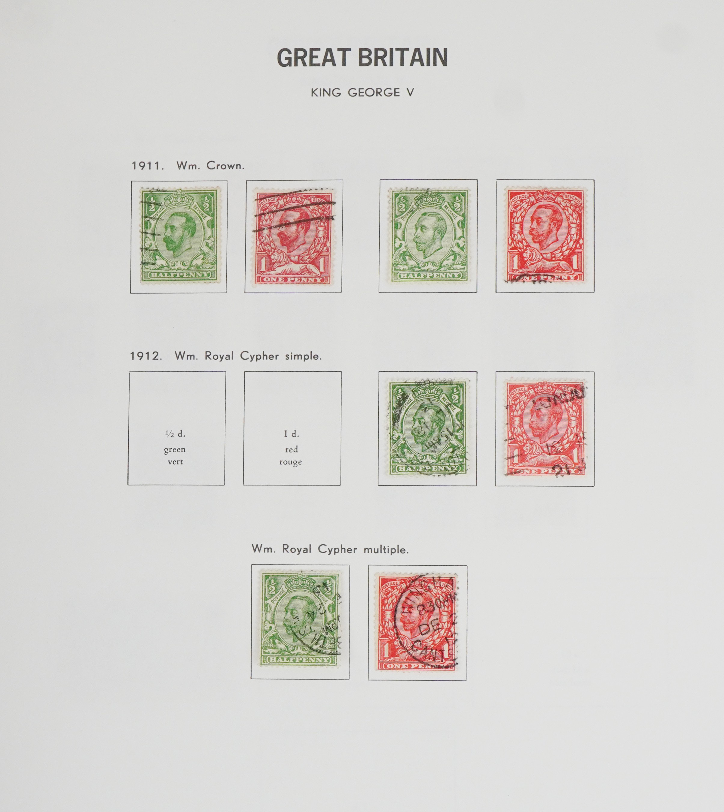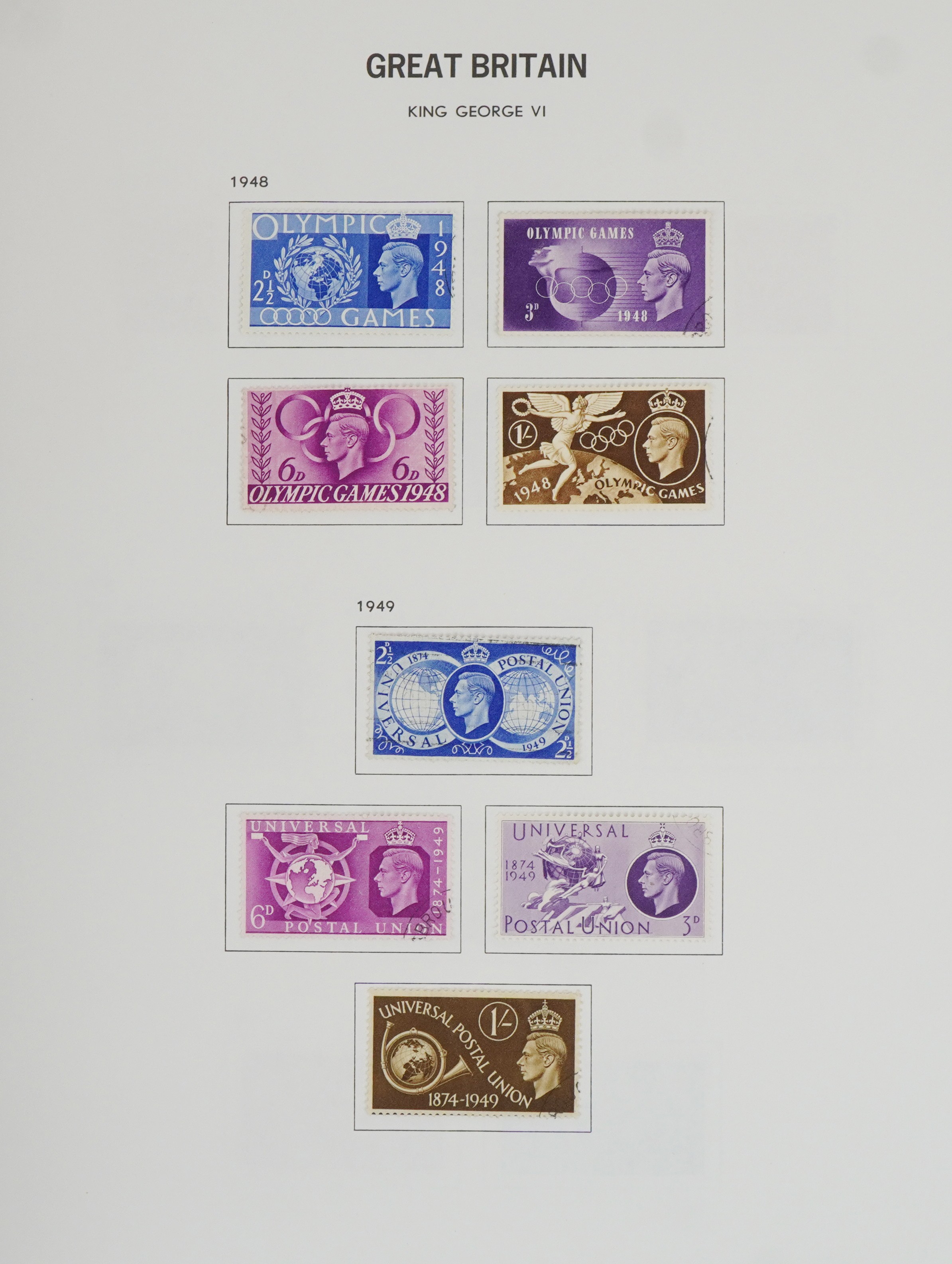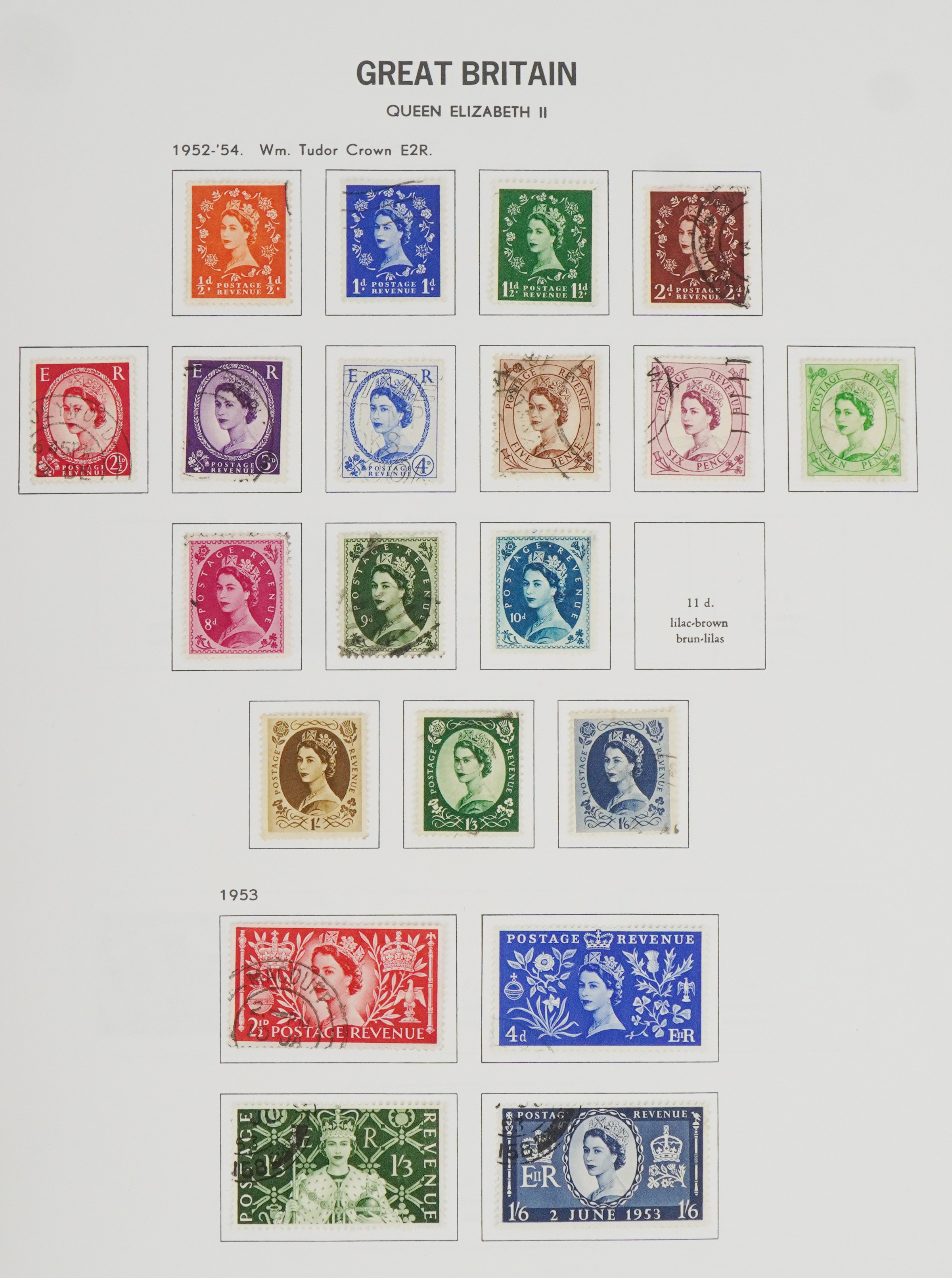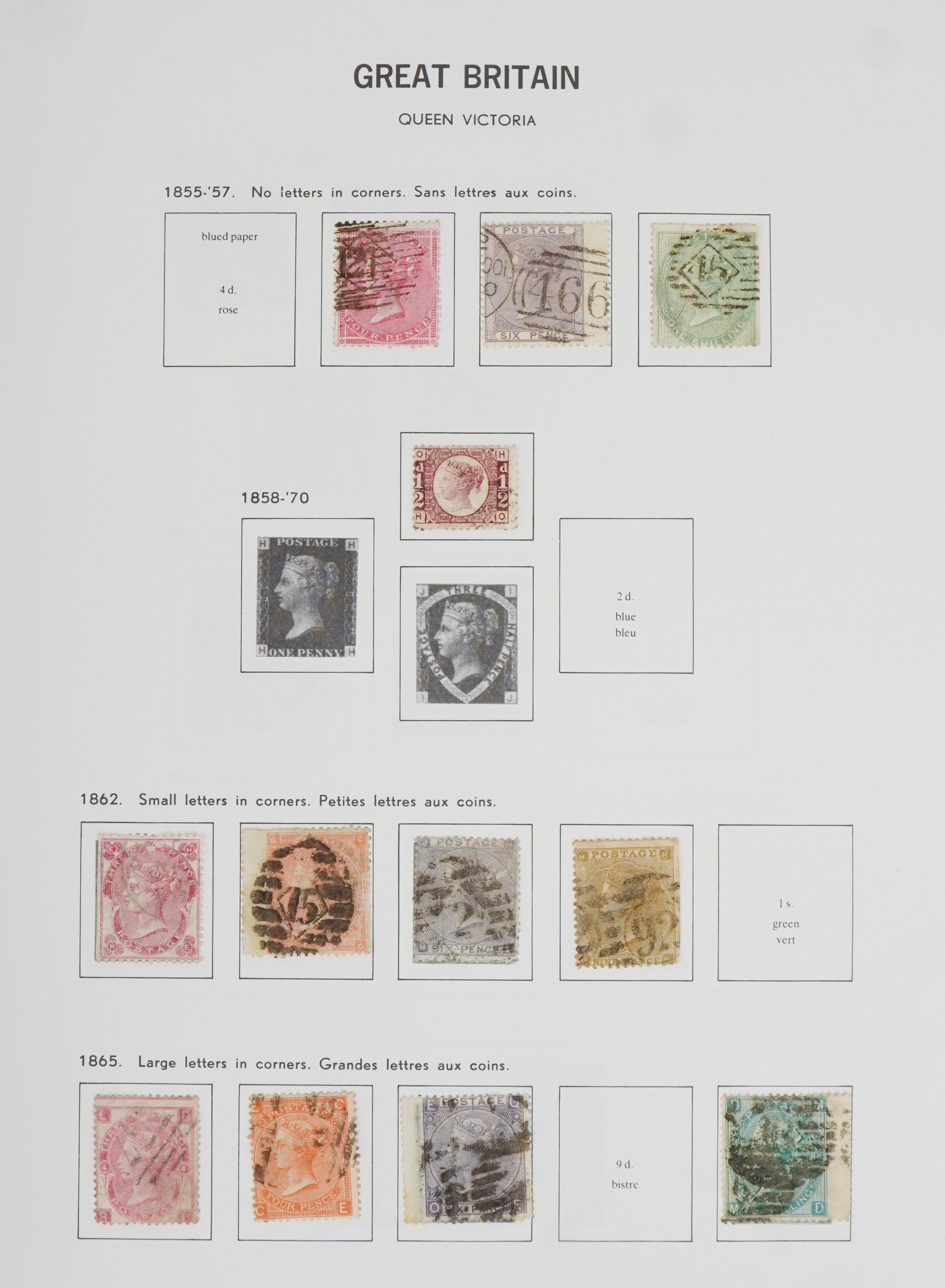 British 19th century and later line engraved and surface printed stamps including Two Penny Blues, Penny Reds, some Victorian surface printed stamps with wing margins, high values, 1887-1900 Jubilee issue up to one shilling, Edward VII 1902-1910 up to five shillings, George V, George VI and Queen Elizabeth II, housed in a black Great Britain stamp album with slip in sleeve.