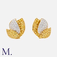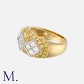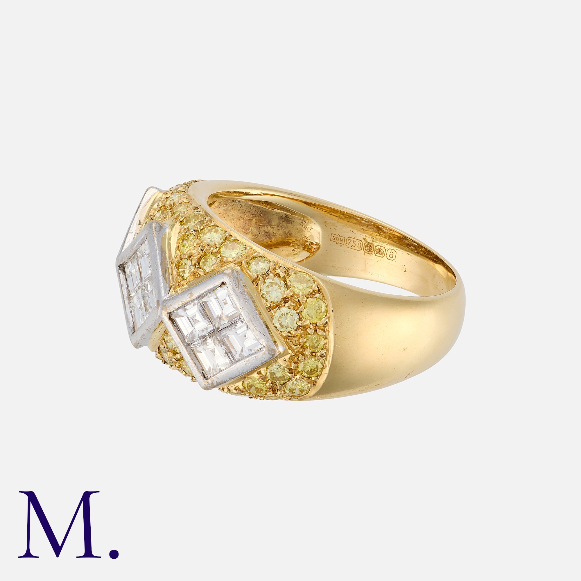 A Yellow and White Diamond Ring in 18 carat yellow gold, the wide band set with round cut yellow diamonds, punctuated by three square motifs set, each set with four square step cut diamonds. Marked 750 for 18 carat gold.