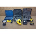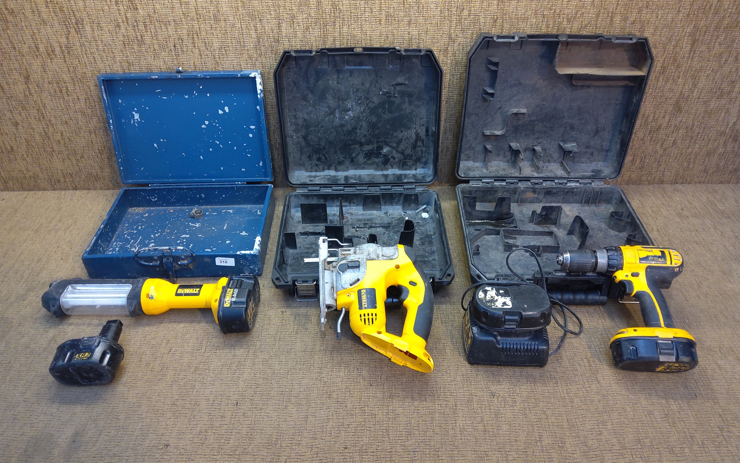 DeWalt power tools including 14.4v torch with 2 batteries. A Jigsaw and a drill with 2 batteries and charger.