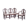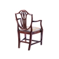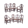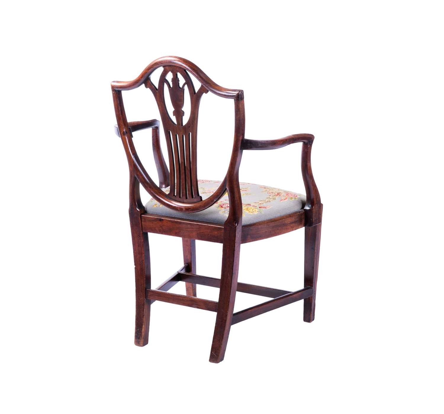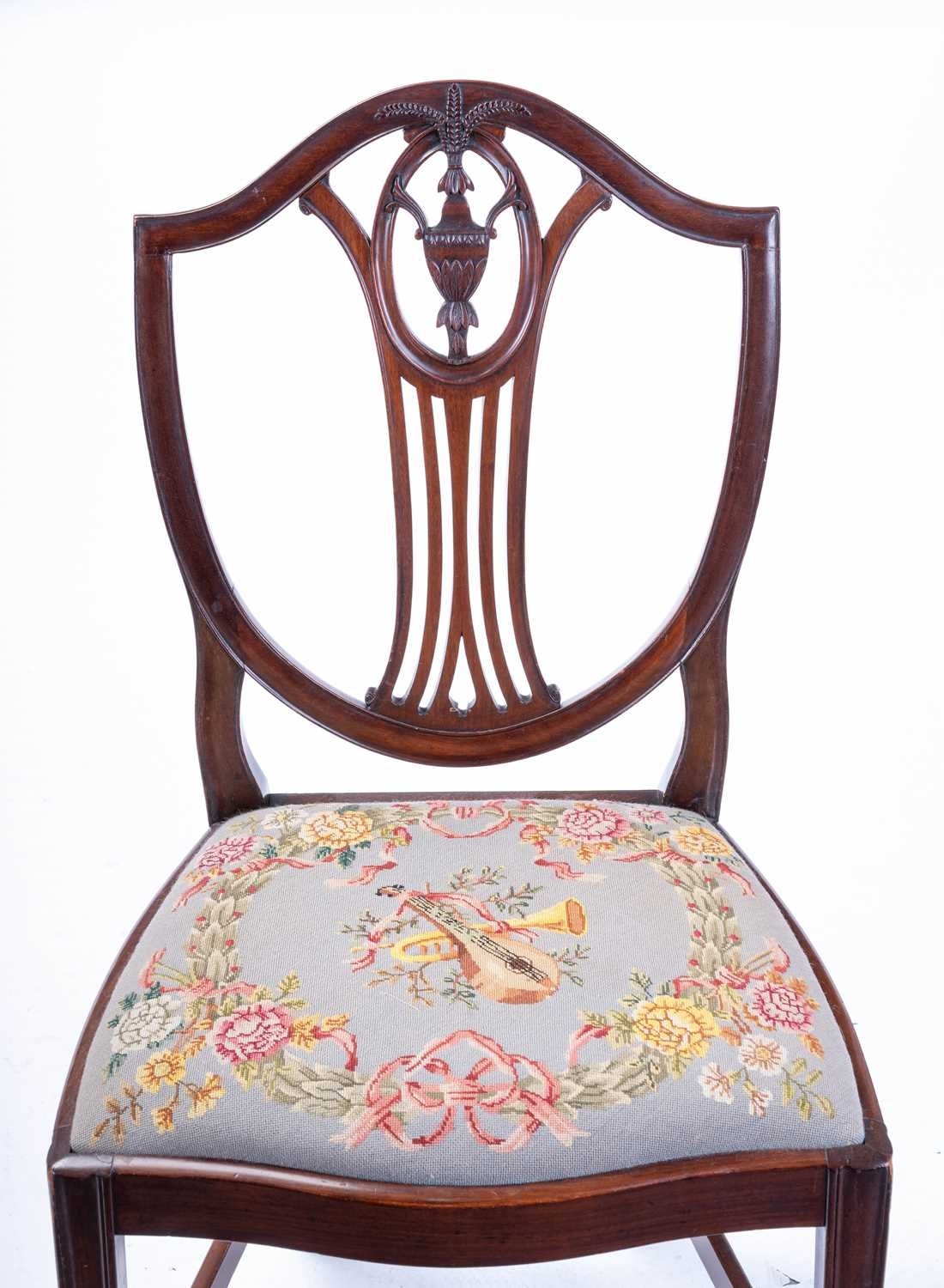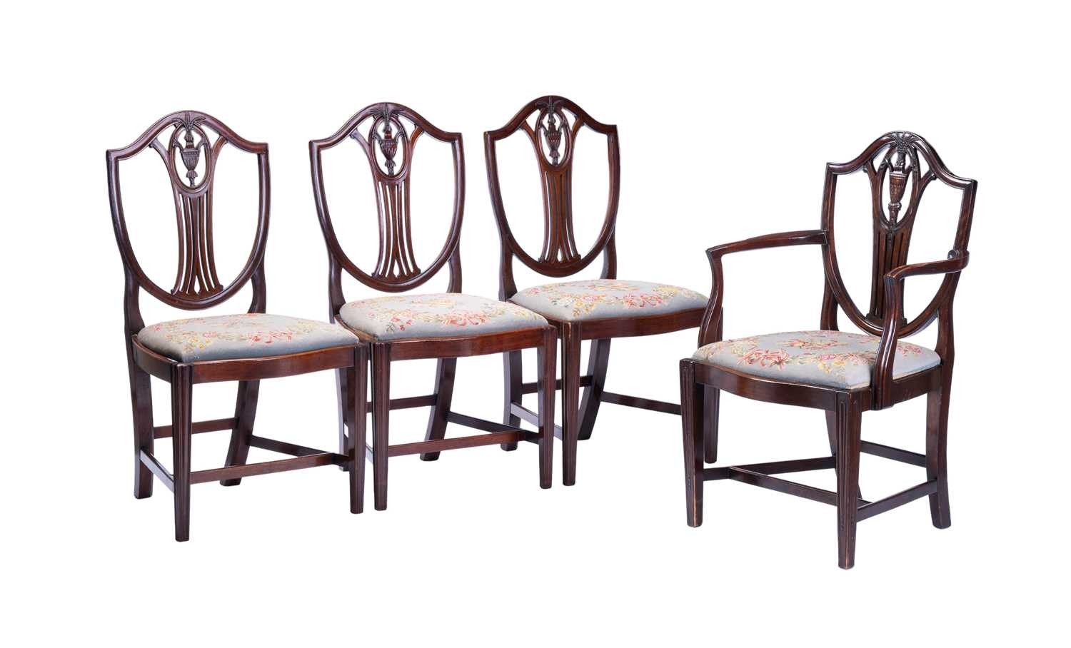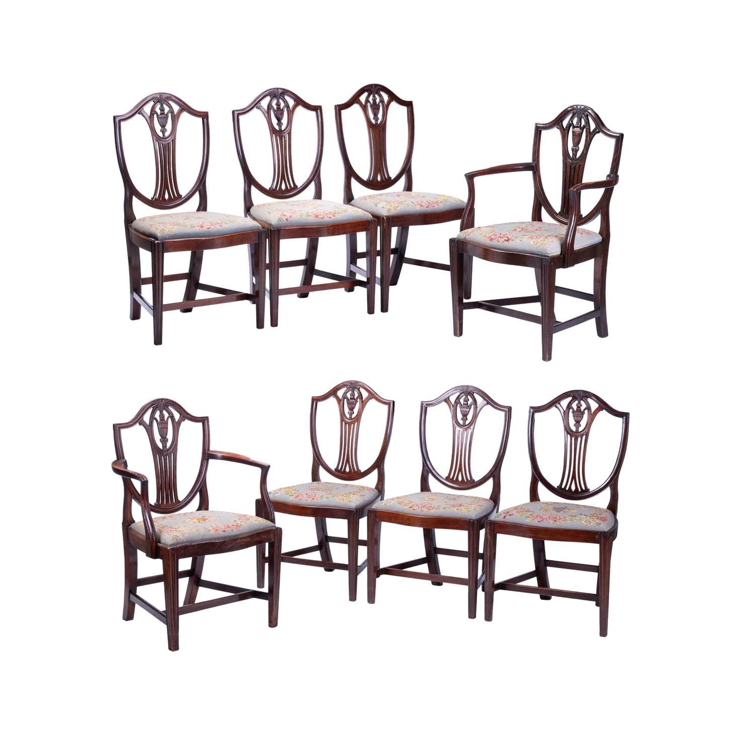 A set of eight mahogany dining chairs of Sheraton design, with shield-shaped backs, drop-in needlework seats and tapering legs, two carvers and six standard (98 cm high x 52 cm, the seats 48 cm high). Qty: (8)
