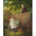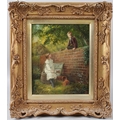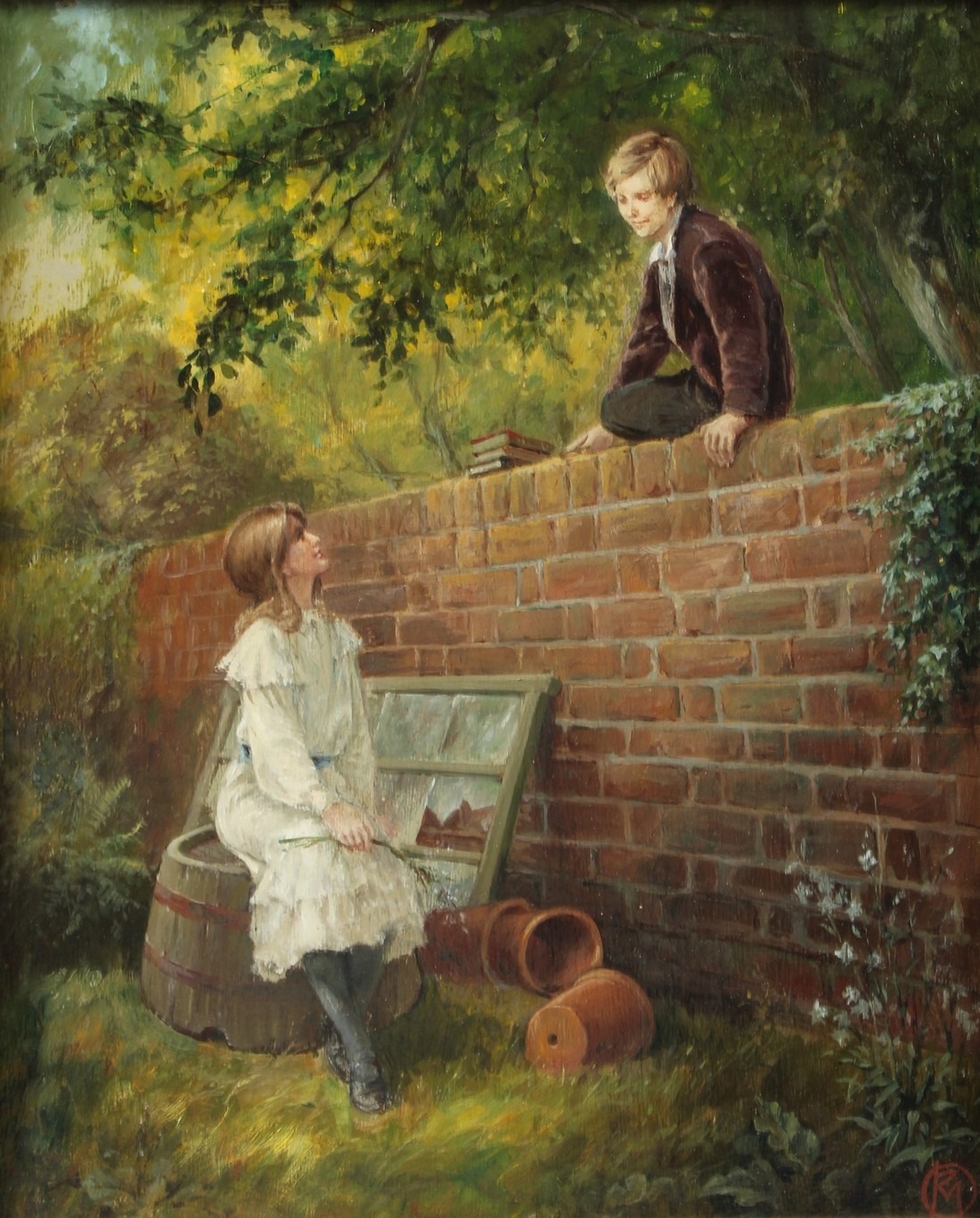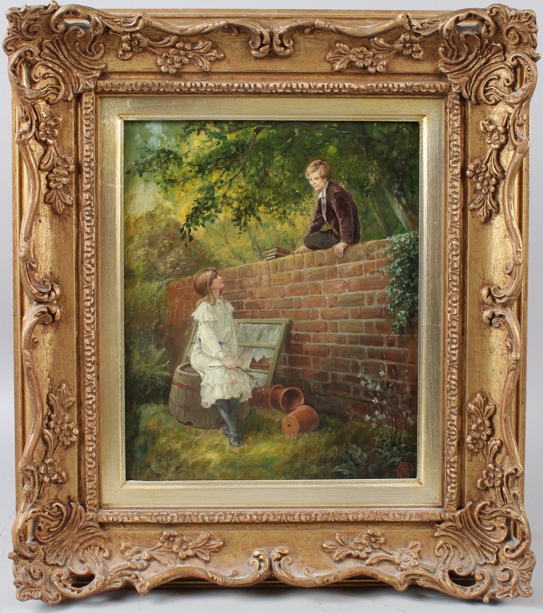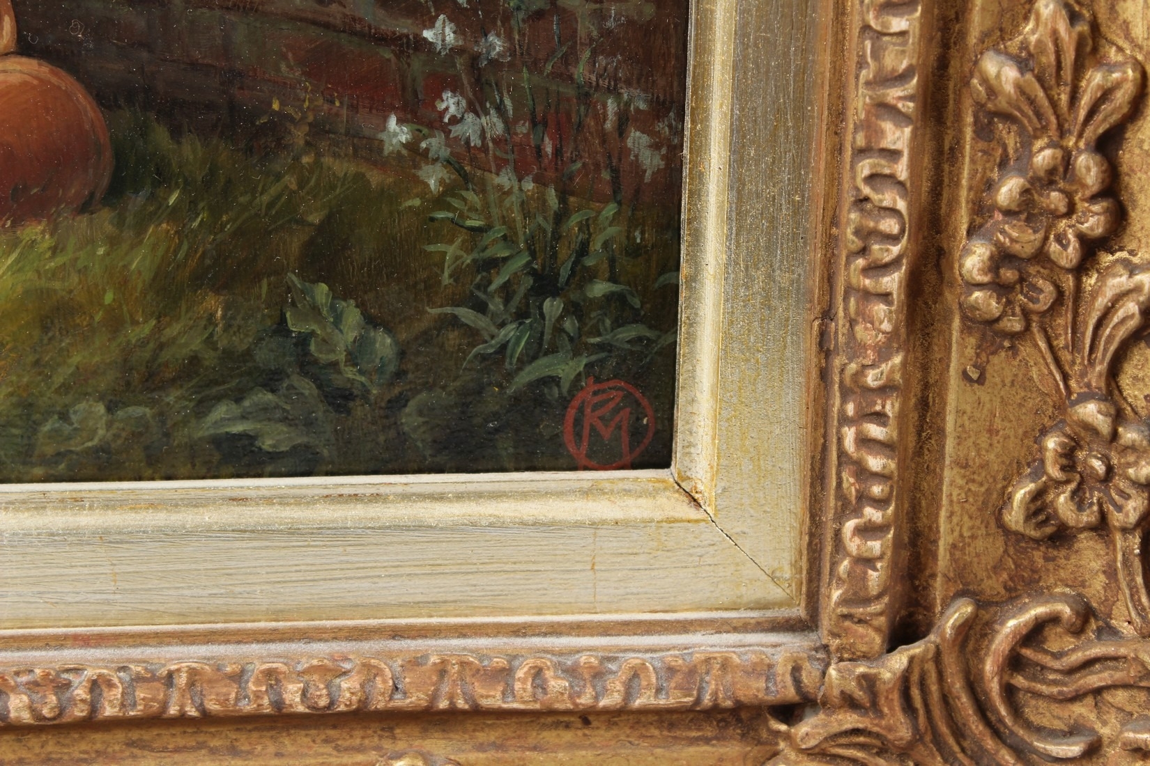 R MARSHALL 'At the bottom of the Garden' oil on panel signed with a monogram 28.5 x 23cm