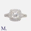A Diamond Ring in 18k white gold, set with a central Asscher cut diamond of 1.01cts set within a two row diamond border with further diamond accents to the shoulders. Hallmarked for 18 carat gold.