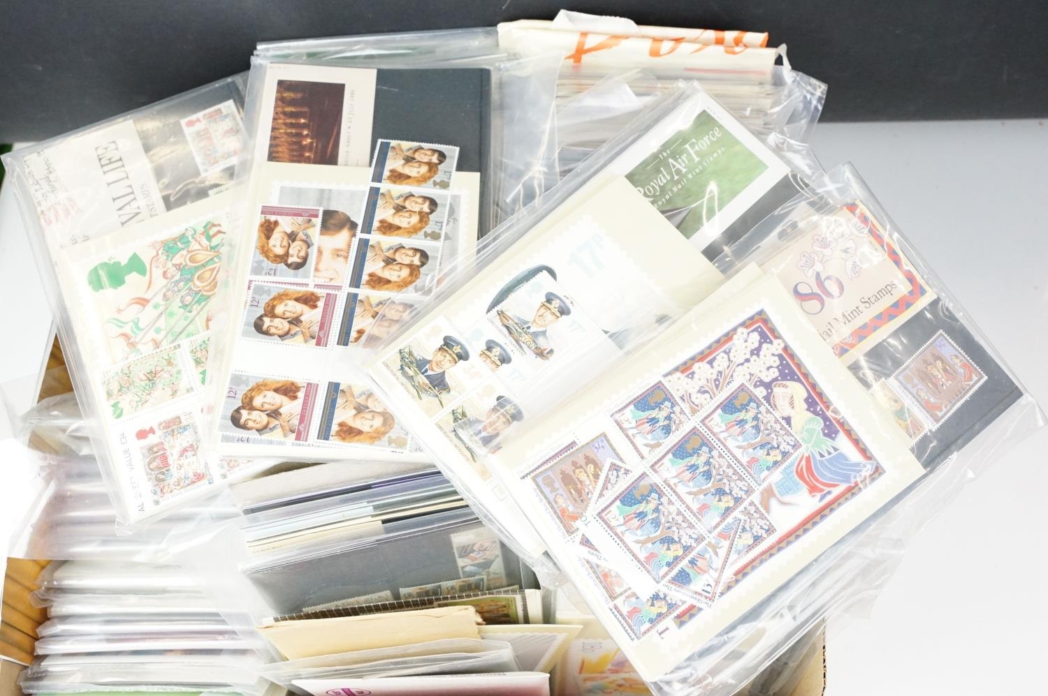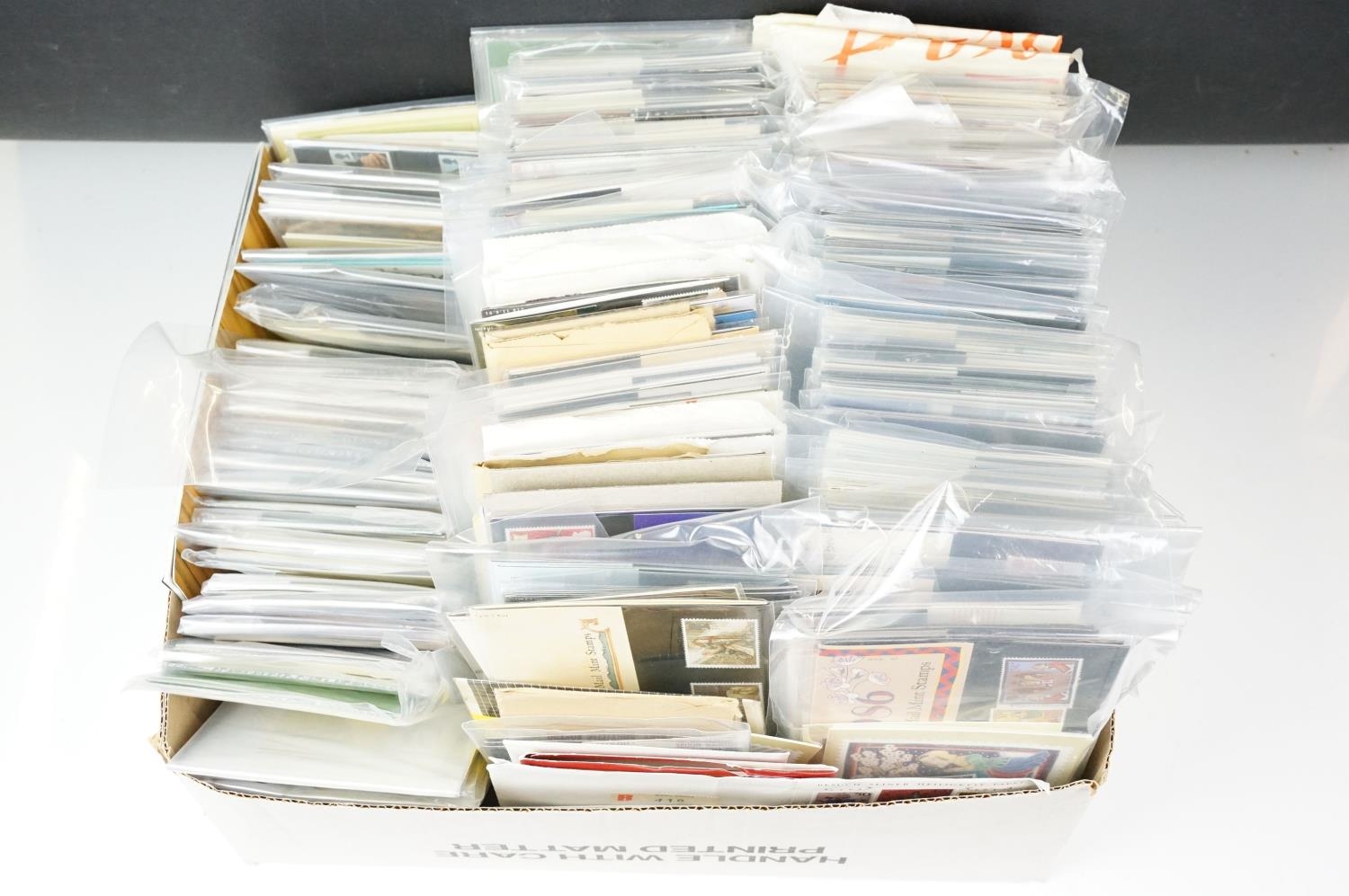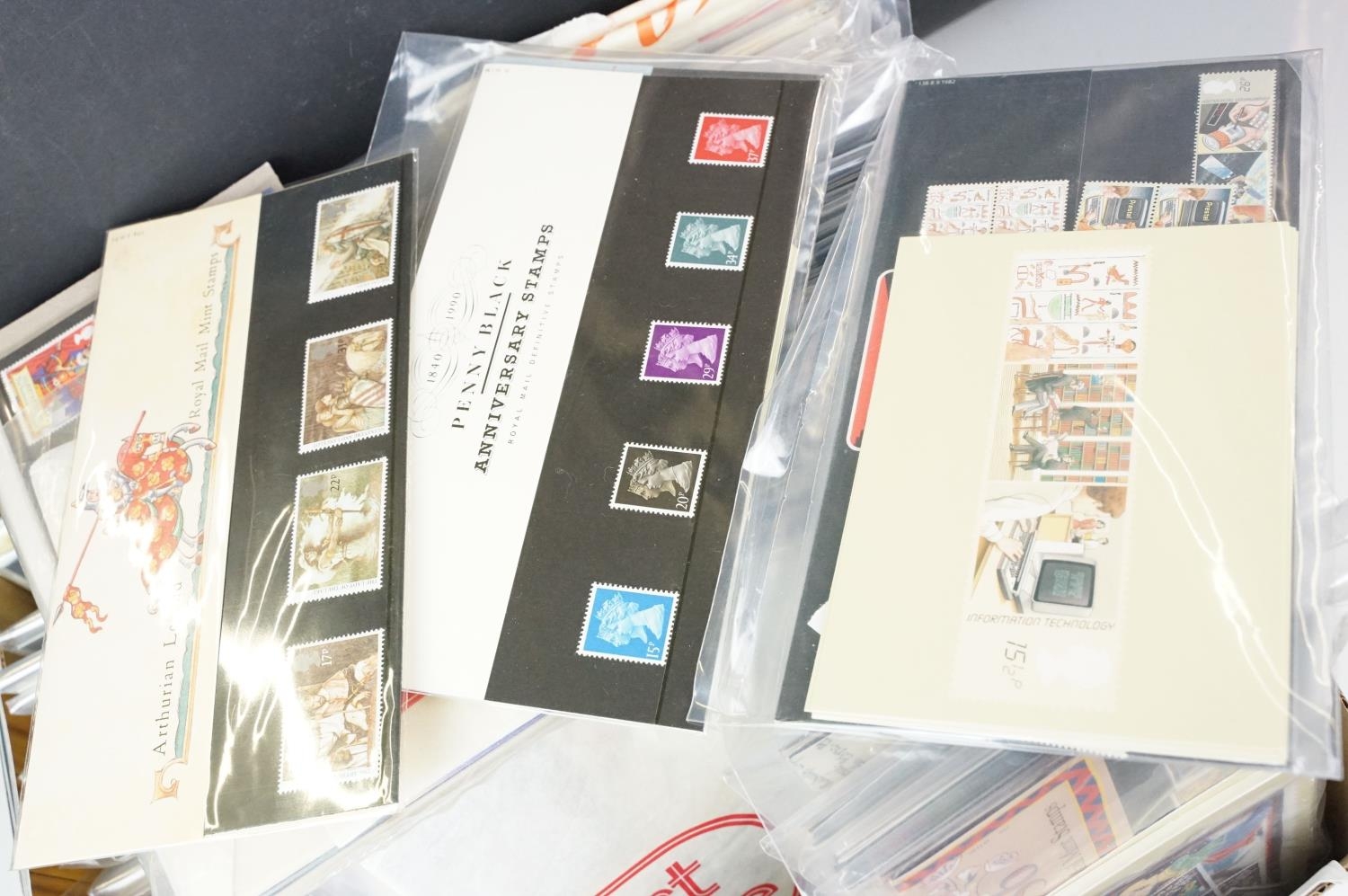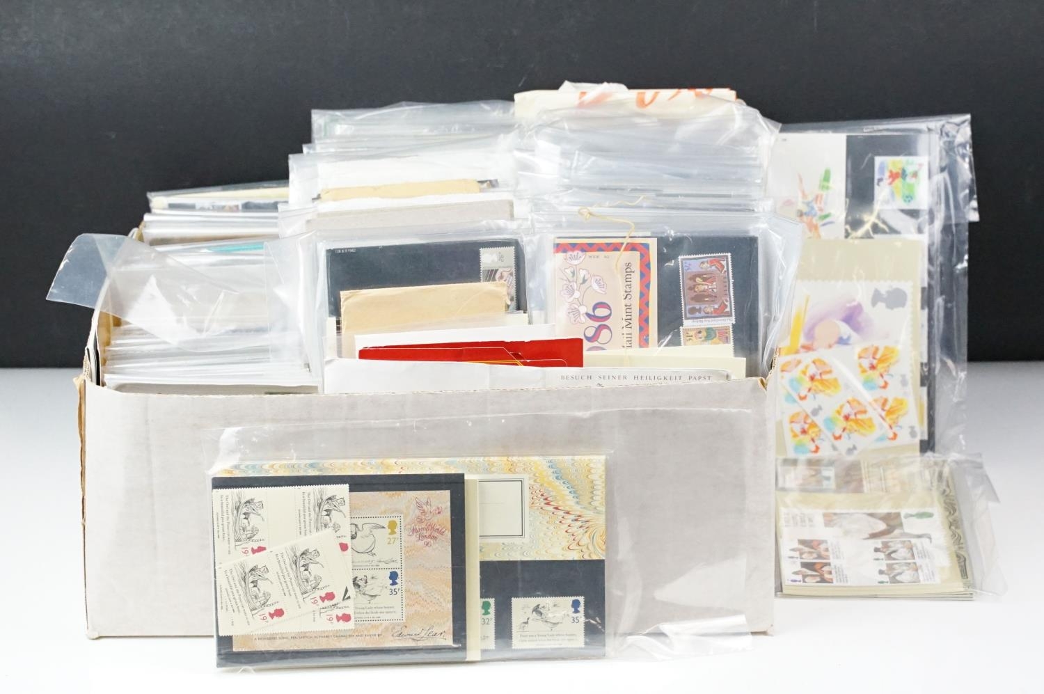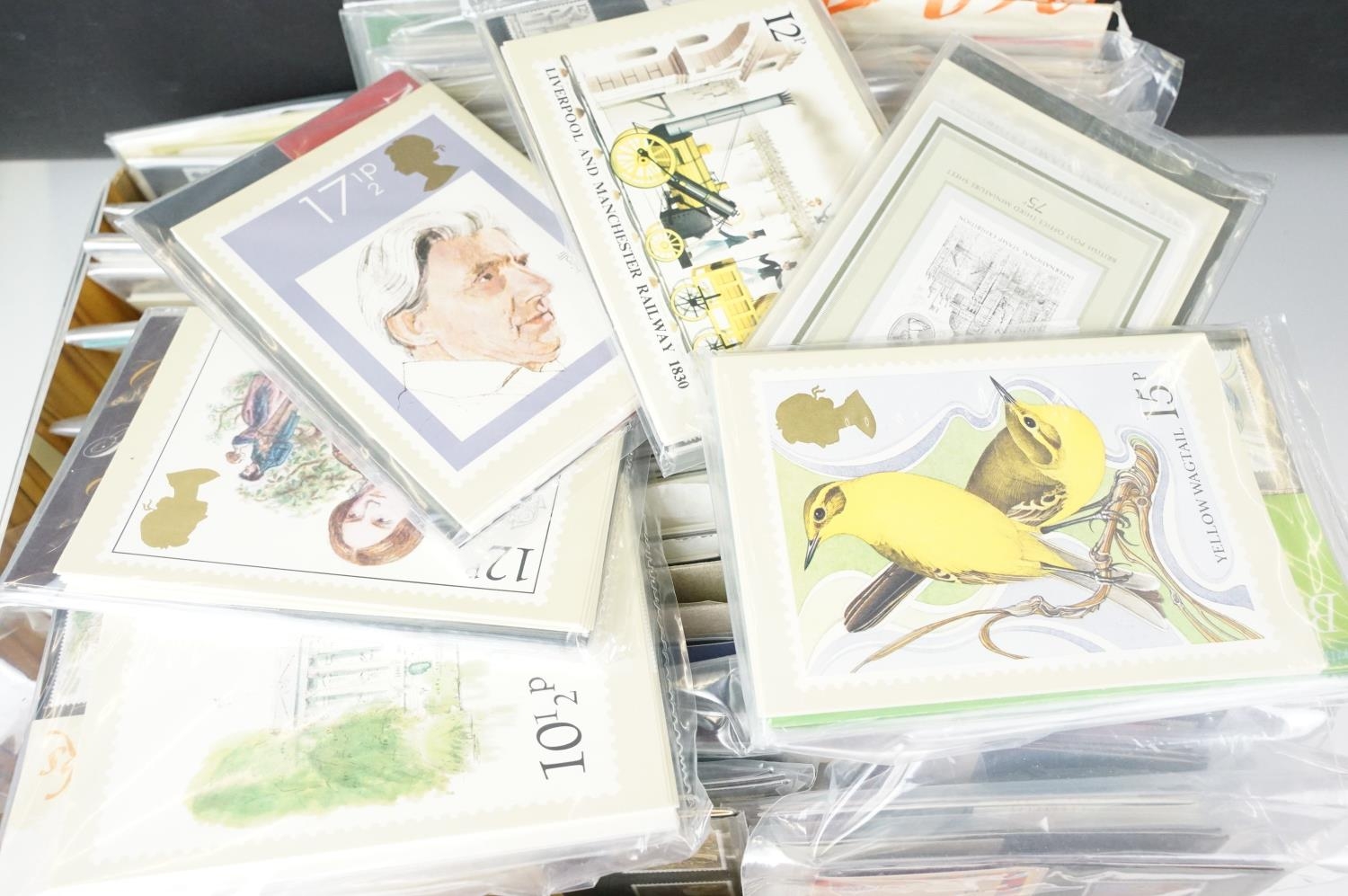 Collection of Royal Mail presentation pack stamps each complete with matching post office post card and loose stamp examples, appears to be mostly two of each pack. Approx 100 sets in total.