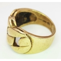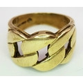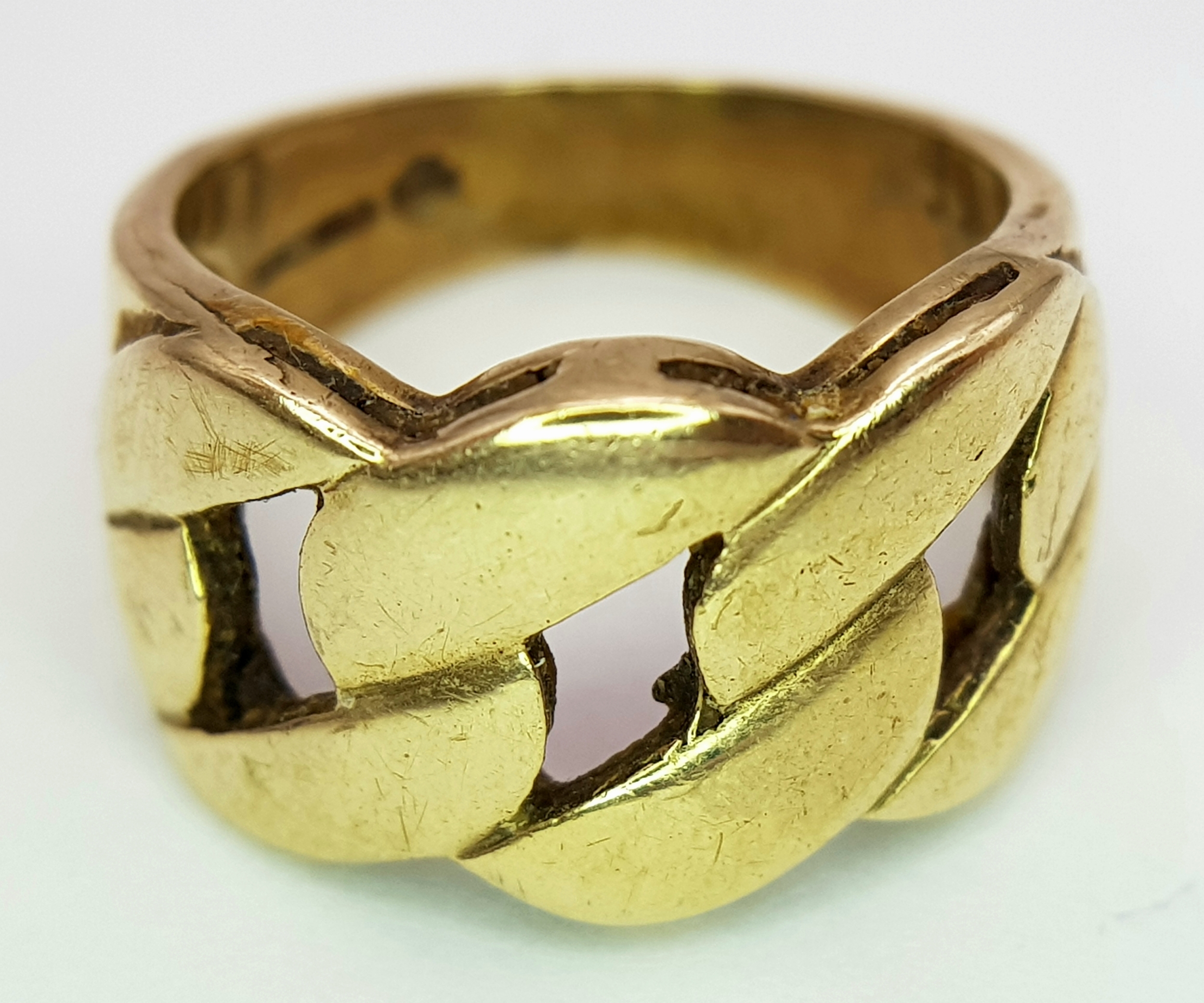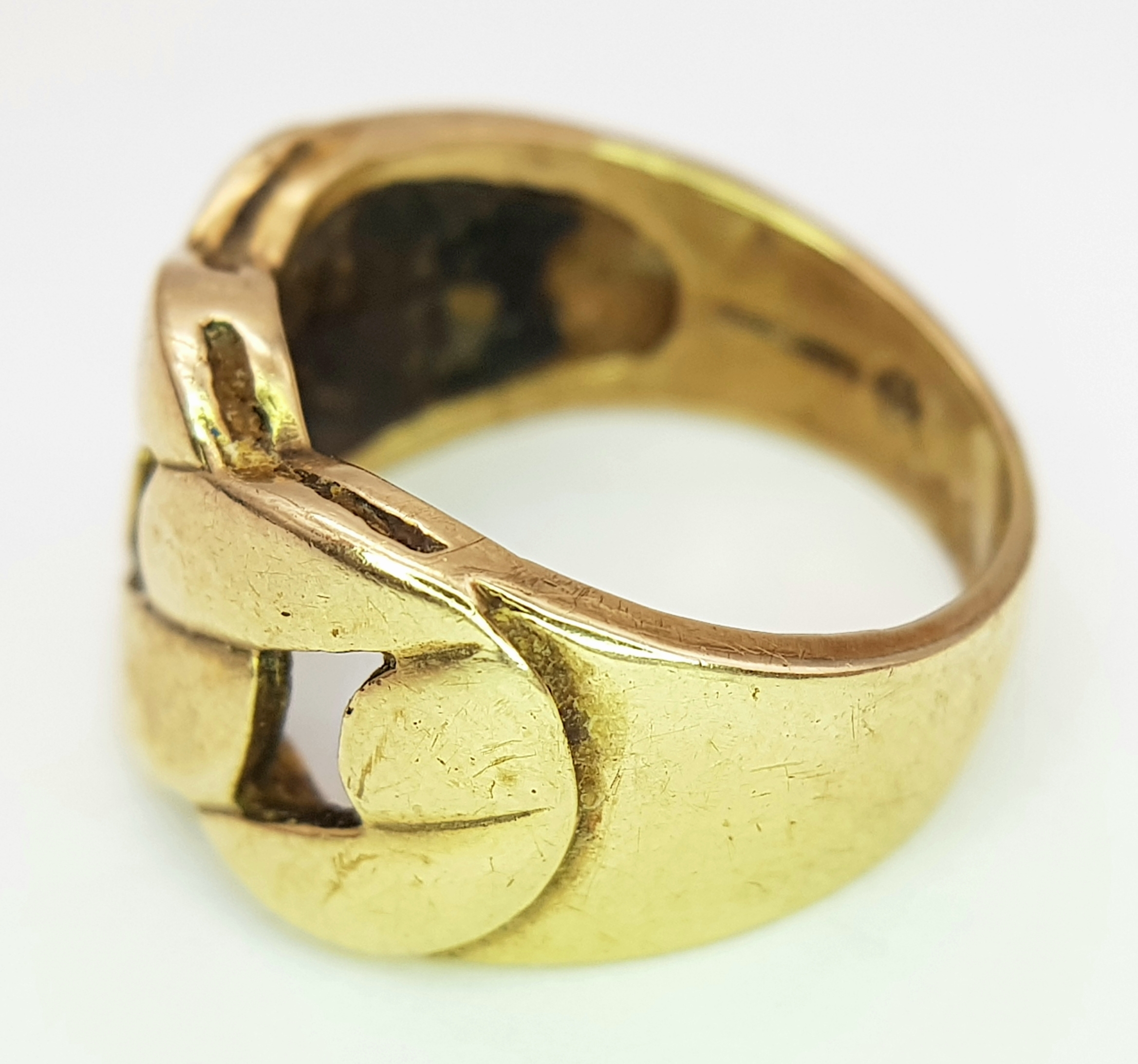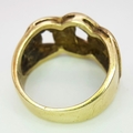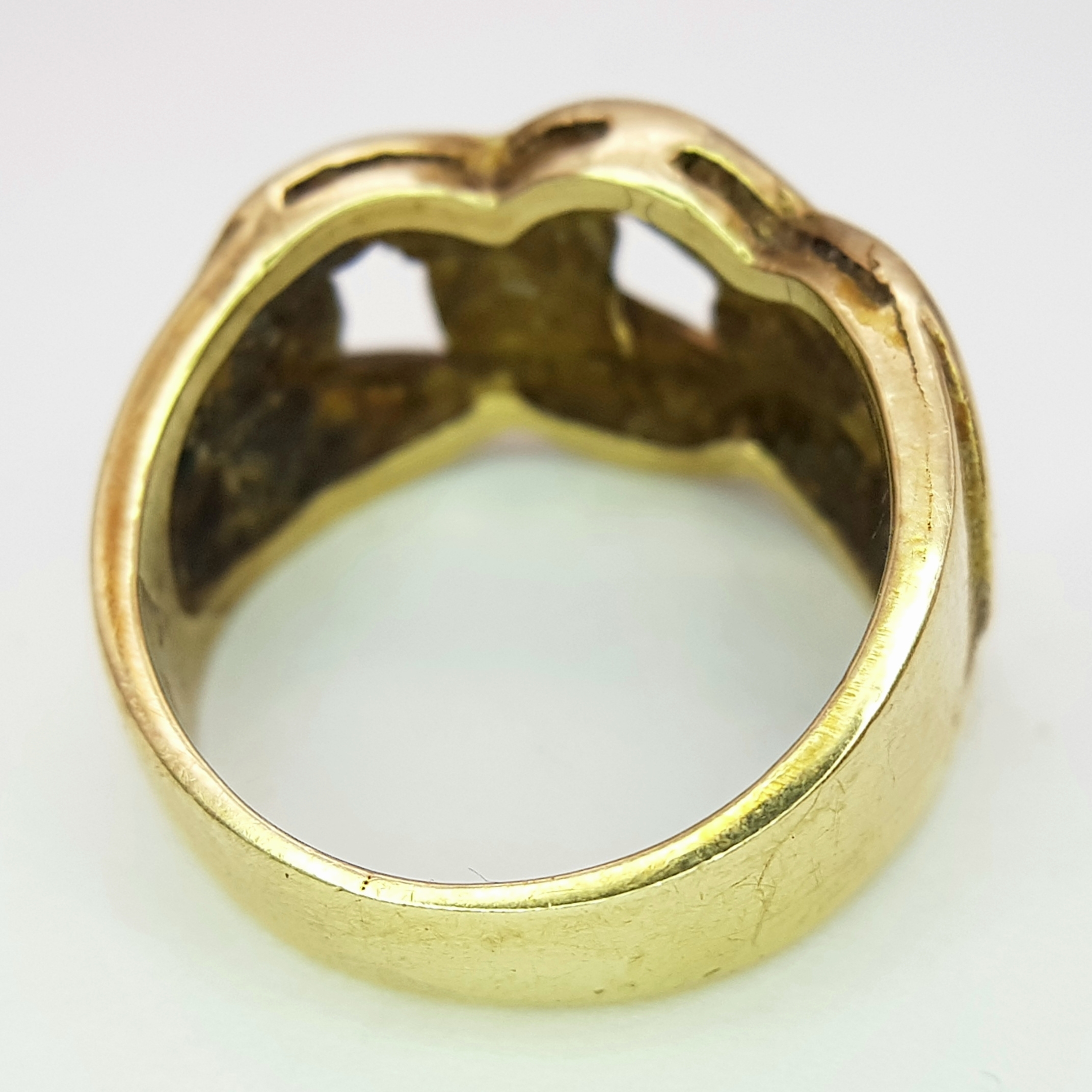 A GENTS 9K GOLD RING WITH DISTINCTIVE PIERCED DESIGN. 6.9gms size O