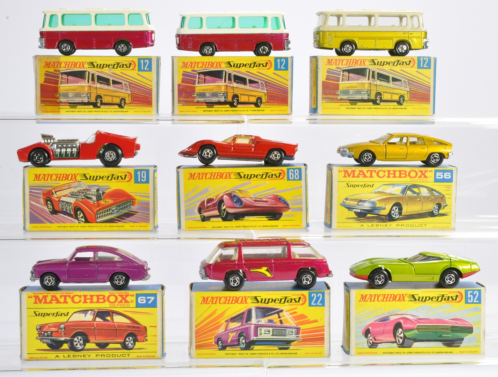 Matchbox Superfast comprising nine boxed issues as shown. Setra Coach x 3. VW 1600TL, Porsche etc. Mostly very good or excellent in some good but mostly very good/excellent boxes. Generally Ex-Shop Stock.