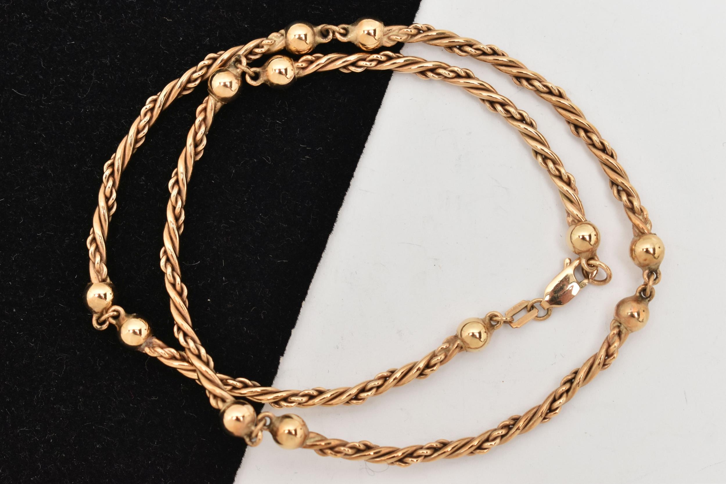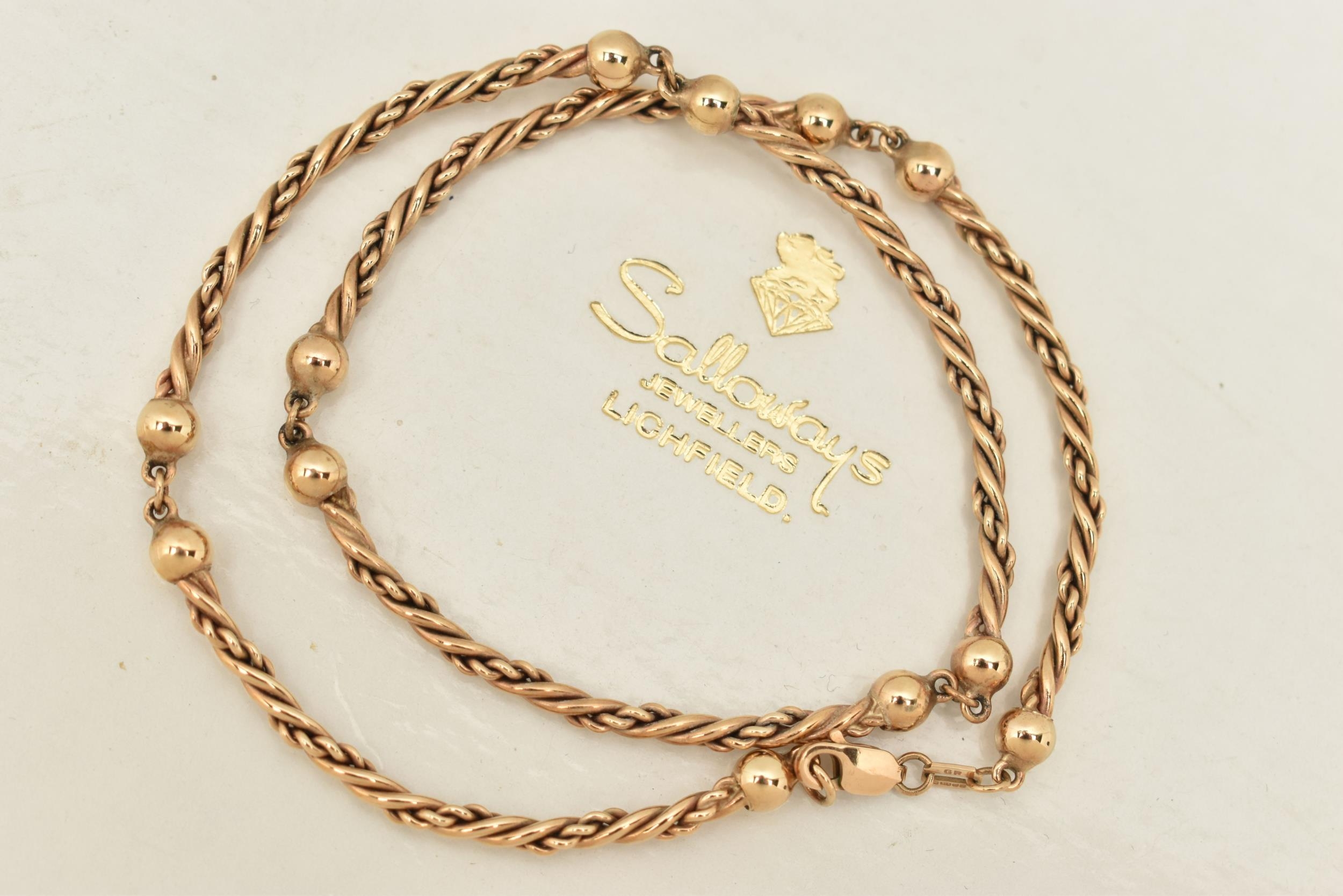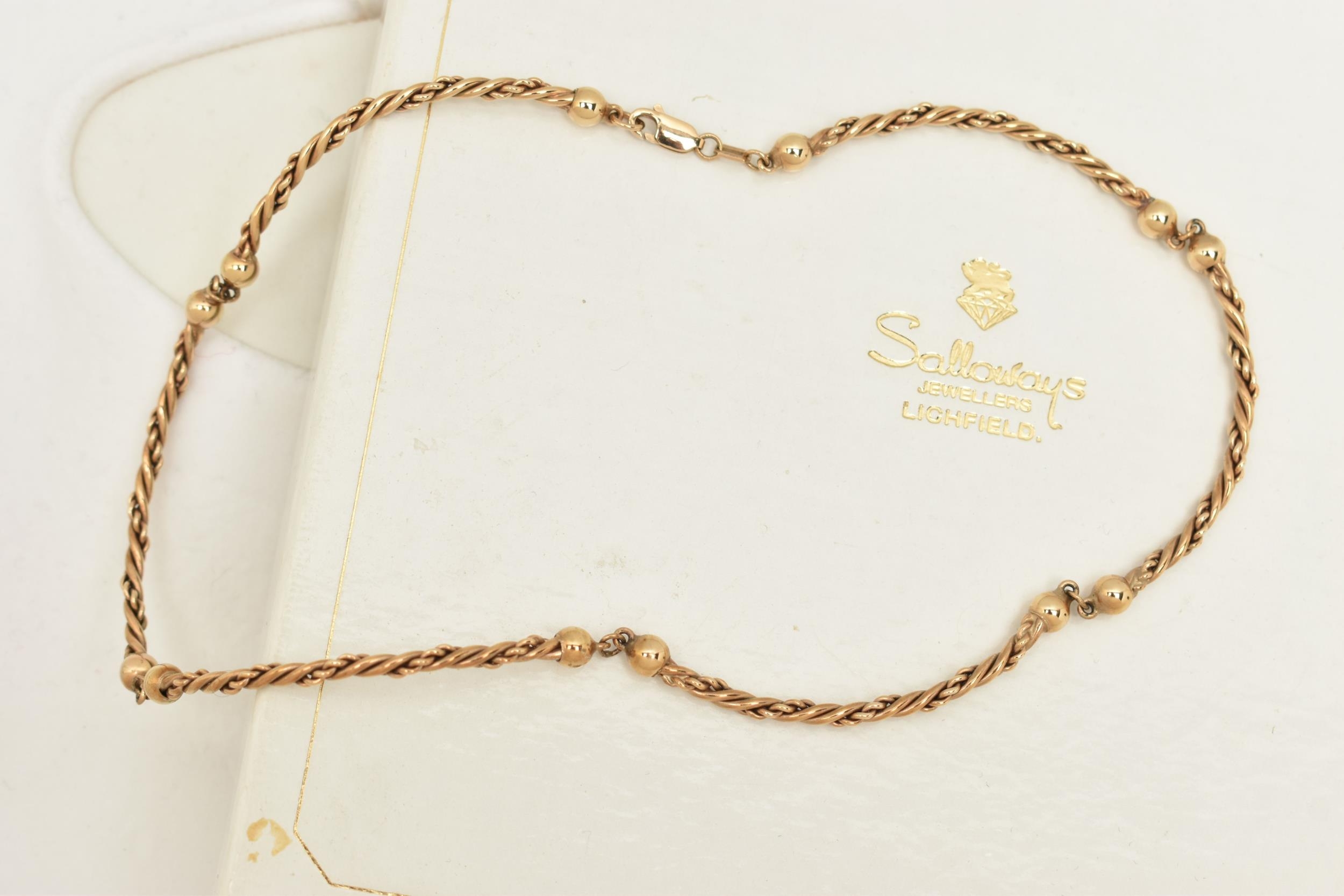 A 9CT YELLOW GOLD NECKLACE, designed as a series of rope-twist design curved links, with plain polished spherical bead spacers, to the lobster claw clasp, hallmarked 9ct gold Birmingham, approximate length of necklace 360mm, approximate gross weight 18.01 grams, necklace with accompanying Salloways box (condition report: overall condition very good)