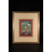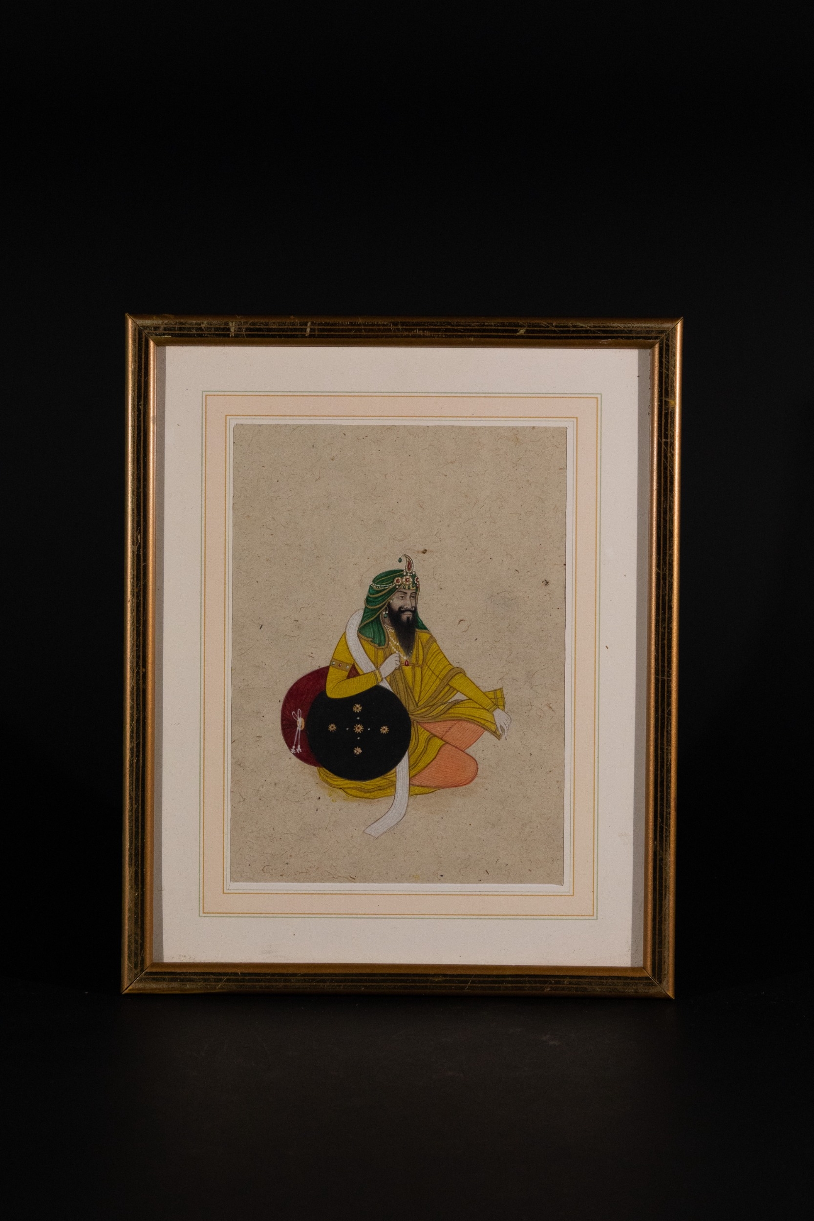 An Indian Sikh Miniature Painting of a Nobleman, Possibly Sher Singh, 19th Century - A framed South Asian miniature painting, executed in watercolor on paper, depicting a bearded male figure. The figure, possibly a noble or warrior, is seated in profile and adorned with a green and gold jeweled turban, a yellow patterned robe, and an orange lower garment. He holds a black round object, possibly a shield or drum, embellished with five star-like motifs.