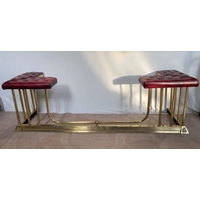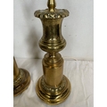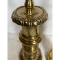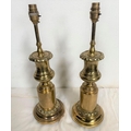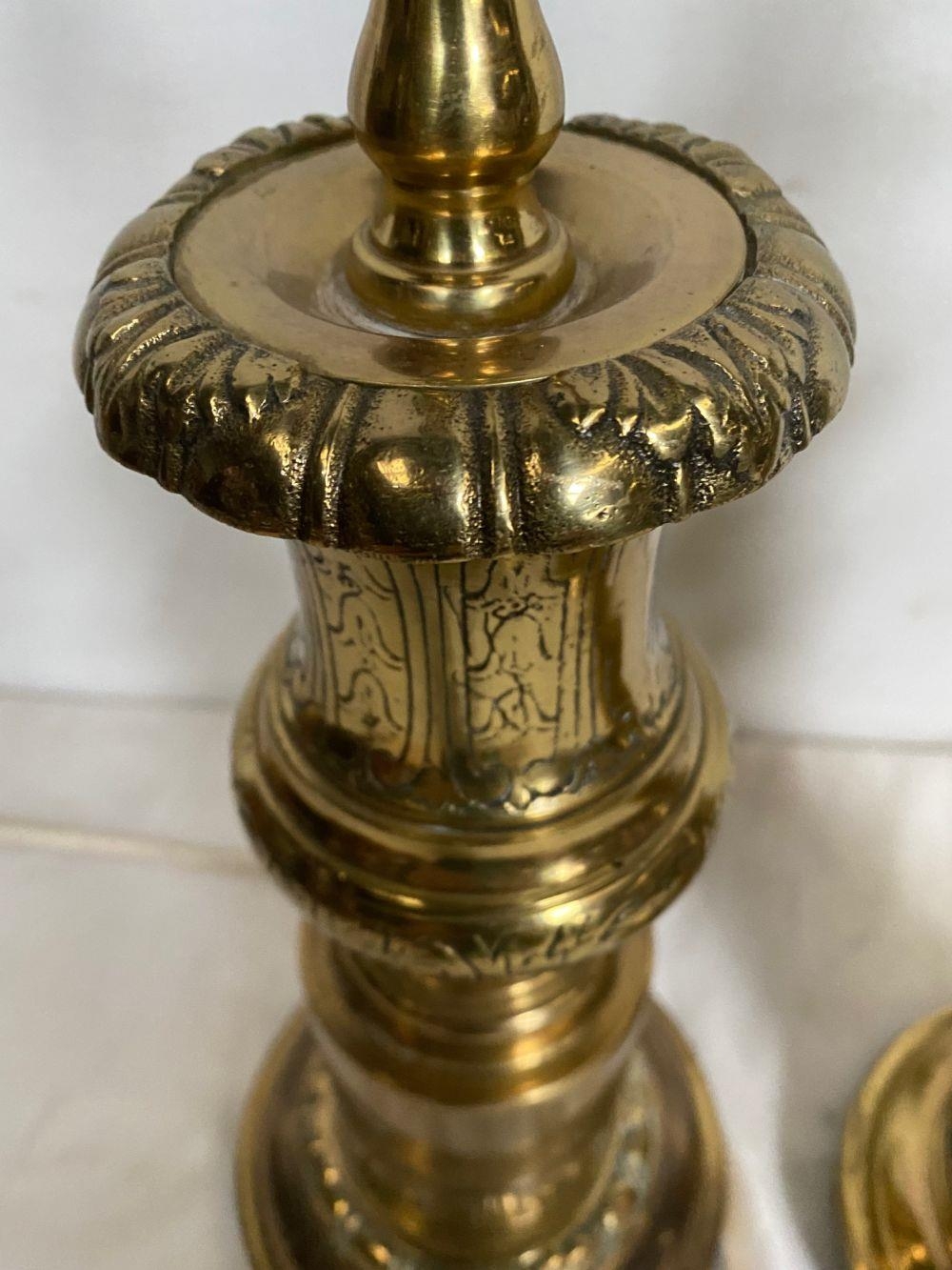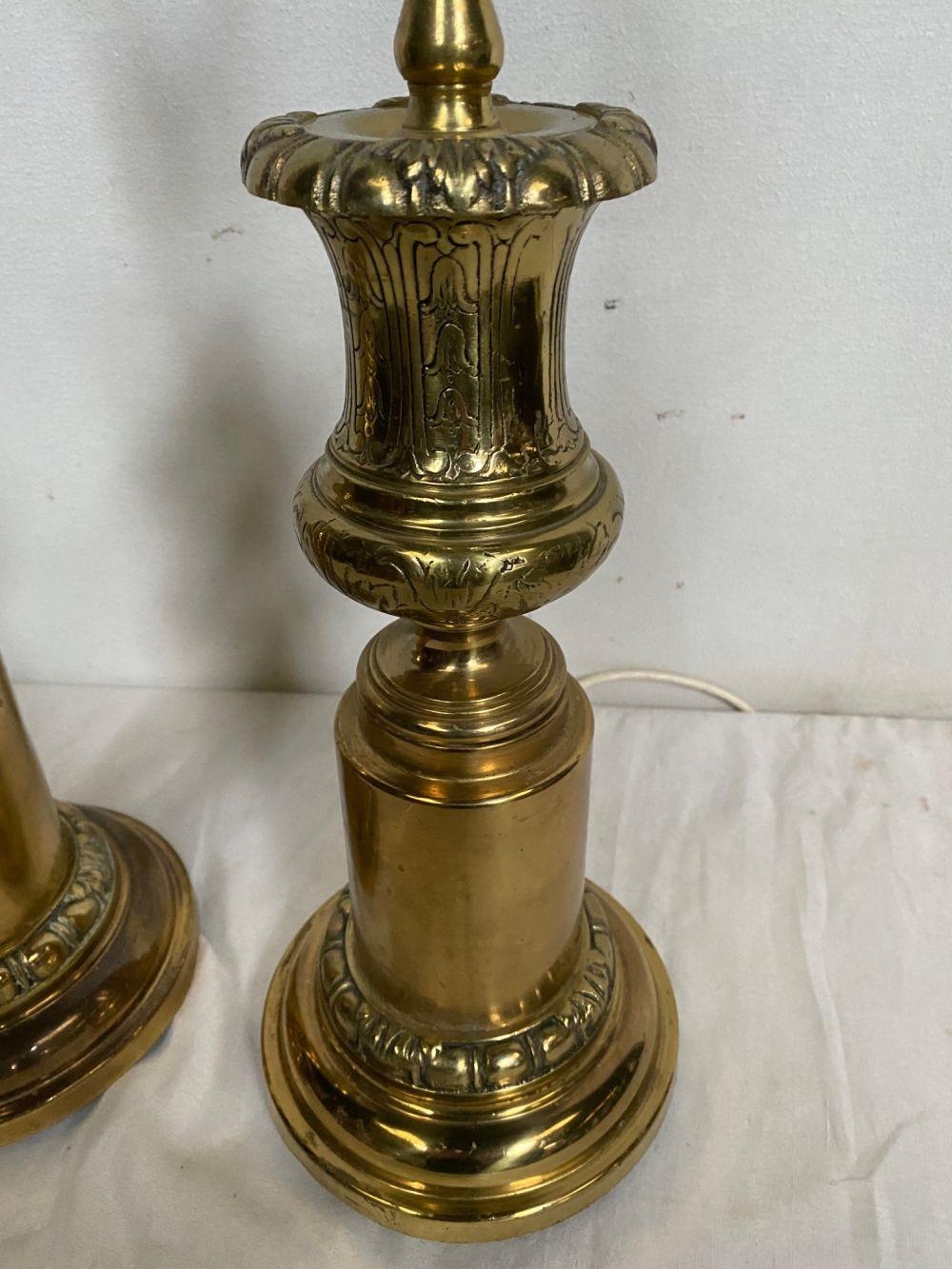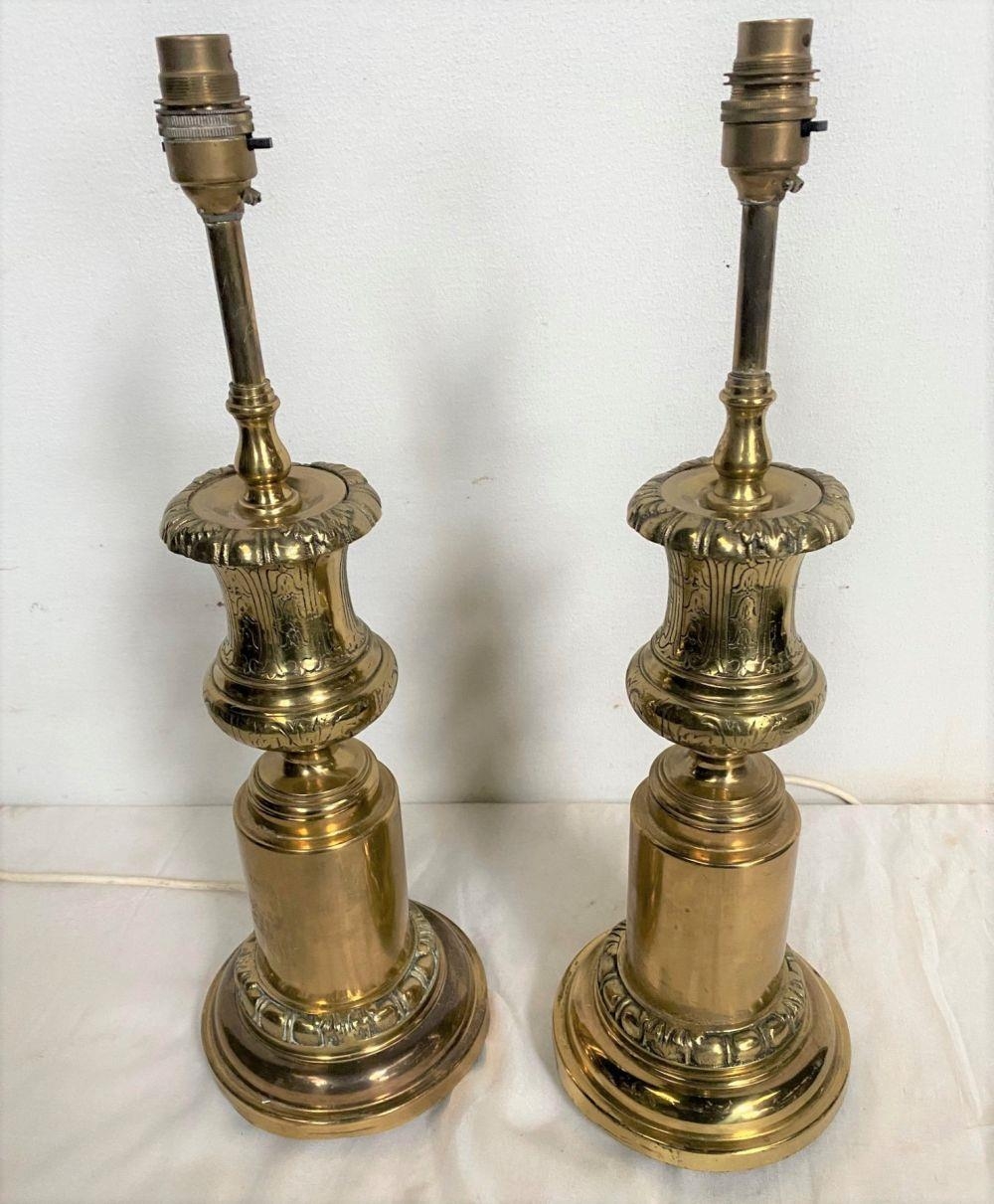 A PAIR OF CIRCULAR POLISHED BRASS LAMPS, with turned supports on circular platform base, with engraved details. Dimensions: 50cm high approx