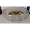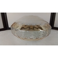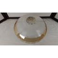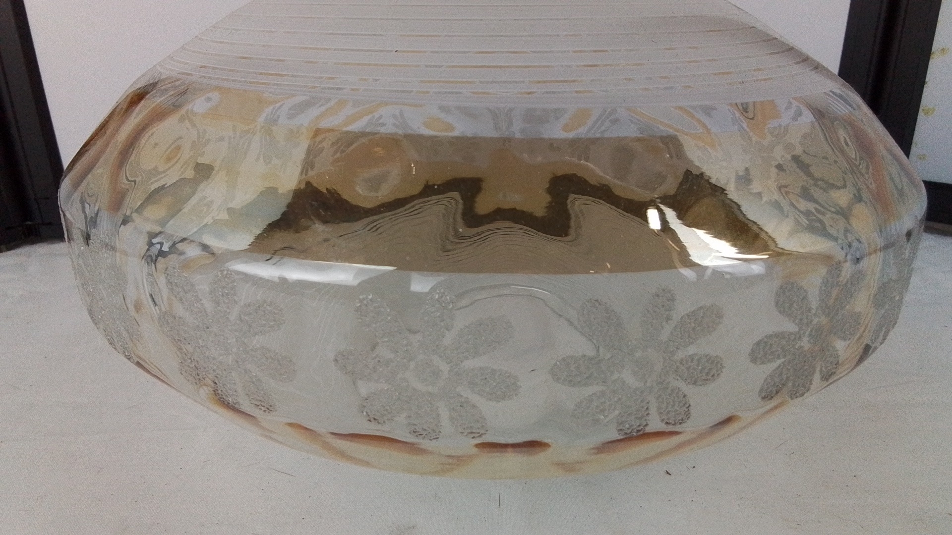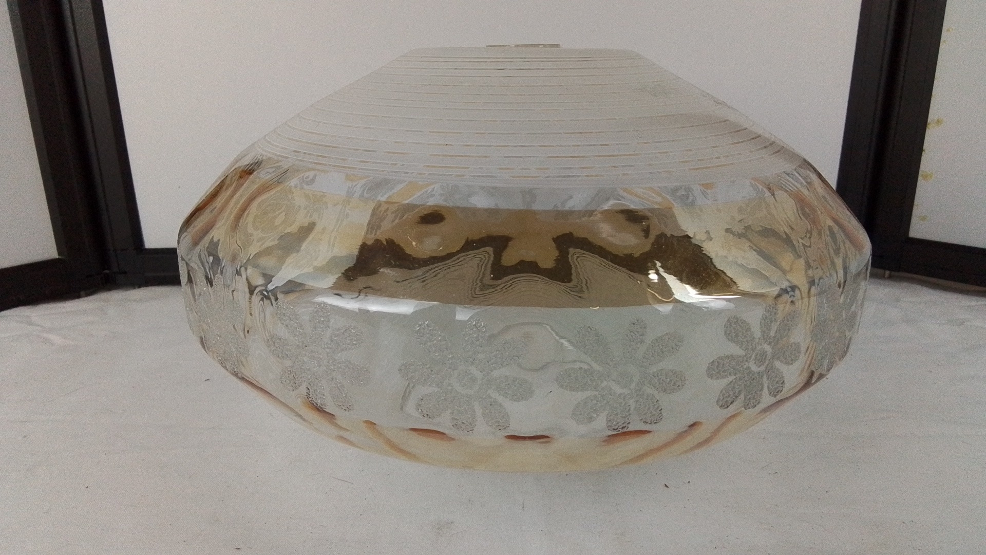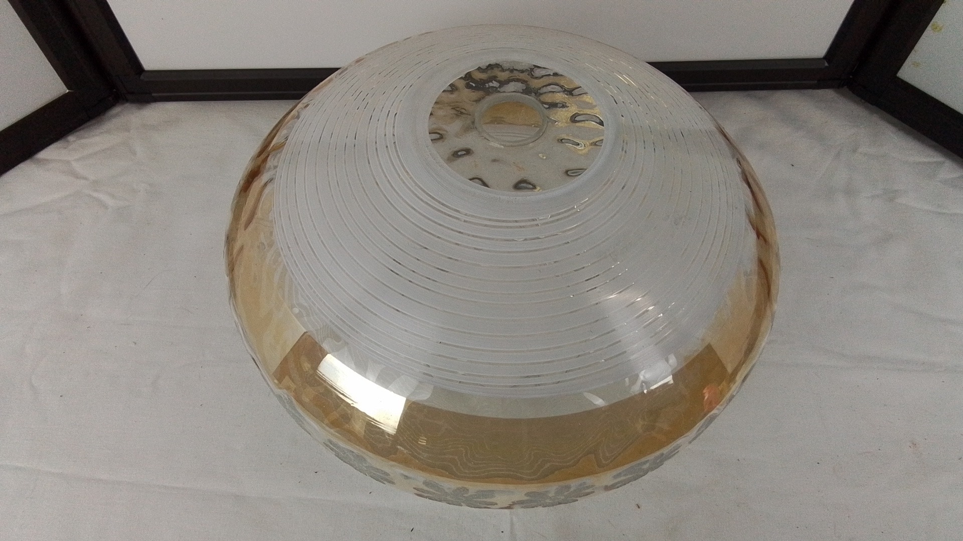 A moulded glass ceiling light shade of shallow domed form, with concentric frosted bands and acid-etched floral decoration, the centre with circular fitter aperture.