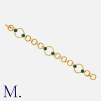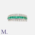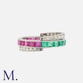 A Reversible Ruby, Emerald And Diamond Ring in white gold, set to one side with a row of calibre cut rubies, the other side set with calibre cut emeralds, flanked by articulated rows of round cut diamonds. Unmarked, tests indicate 18 carat white gold.