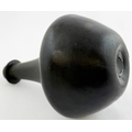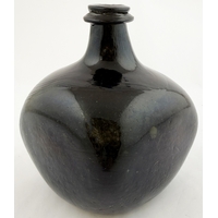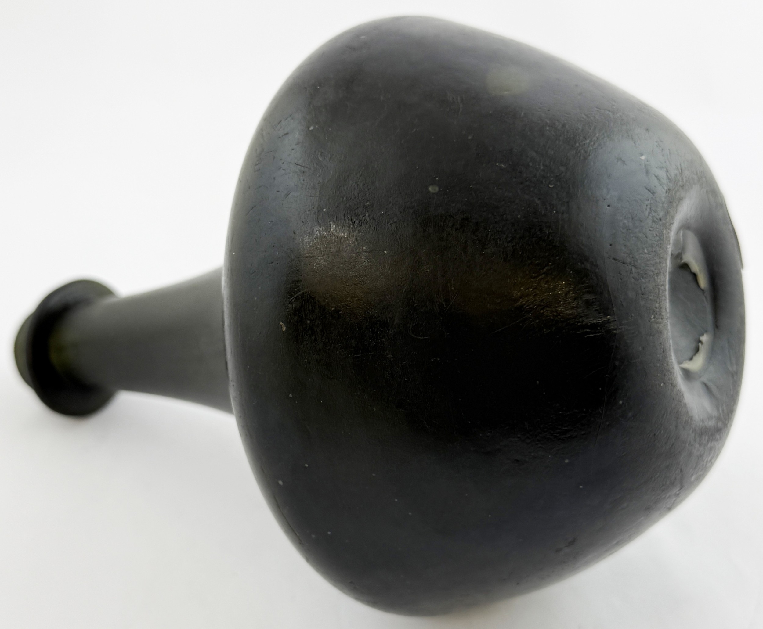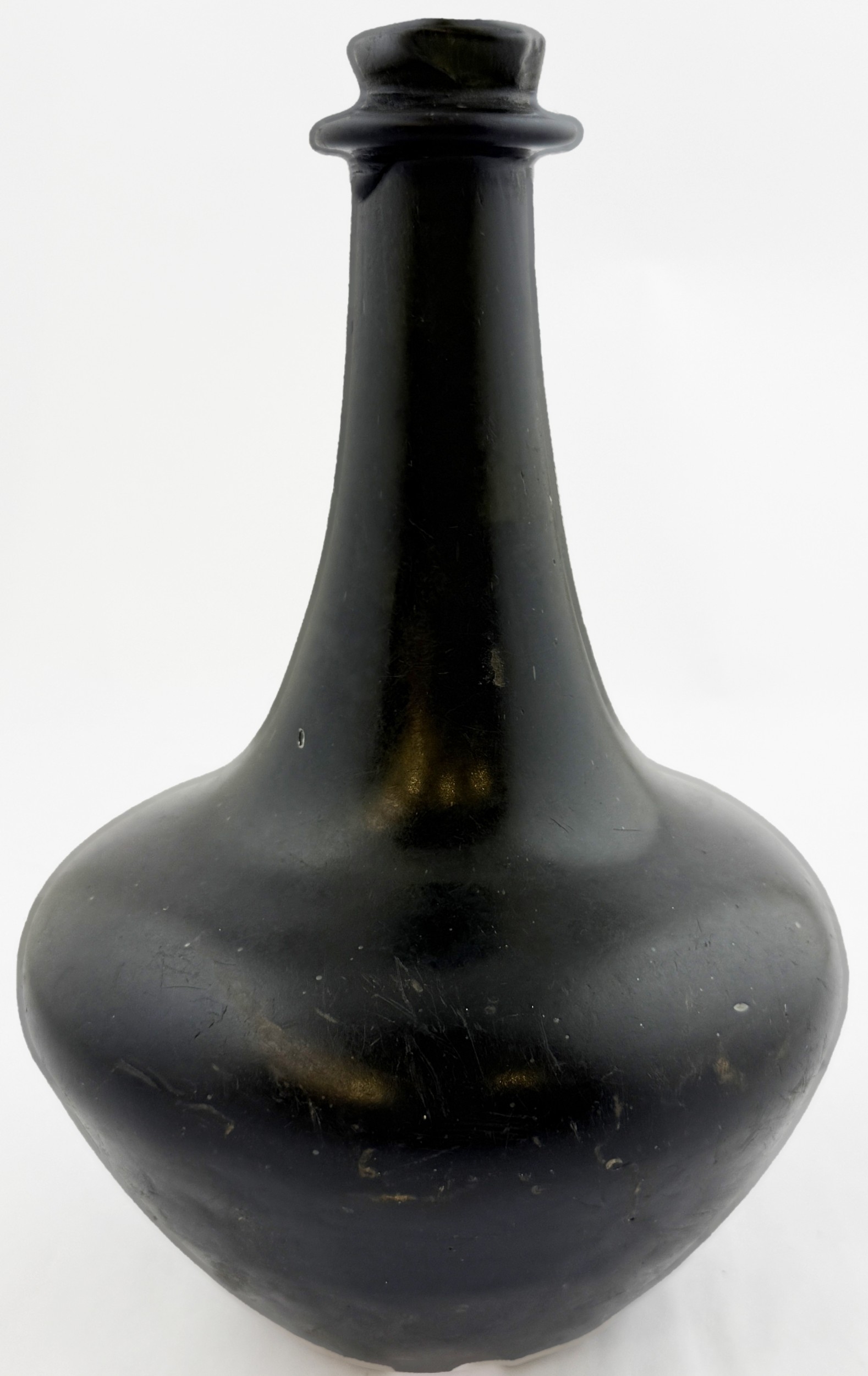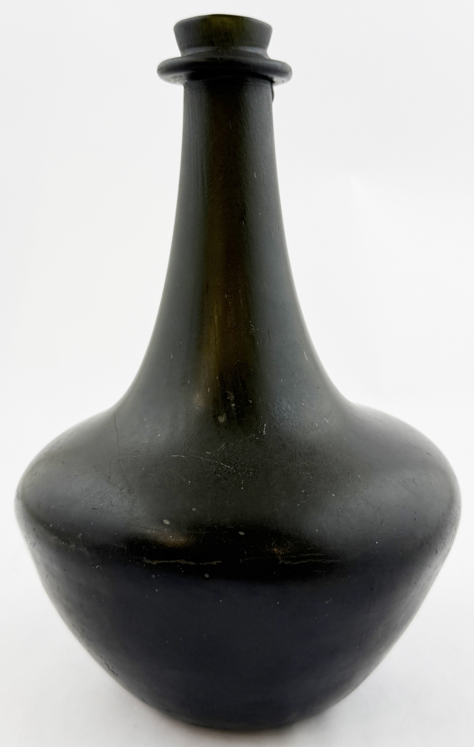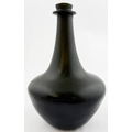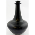 ENGLISH BLACK GLASS SHAFT & GLOBE BOTTLE. 8ins tall, c. 1670. Free Free blown shaft & globe form. Black glass/ dark olive green. Classic flower pot lower body shape, tapering long neck, very pronounced, rounded, string rim. Shallow kick up with blowpipe base pontil. A classic form, delightfully patinated/ overall matt, in a most spectacular condition.