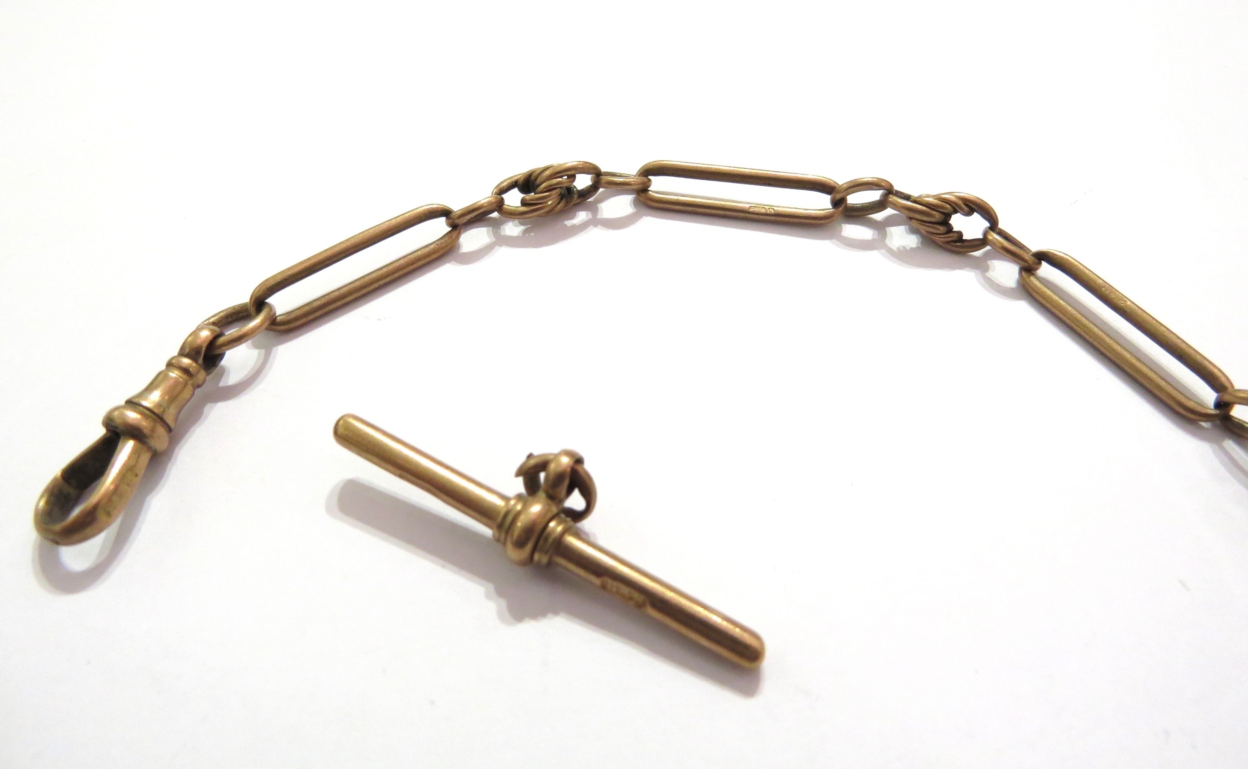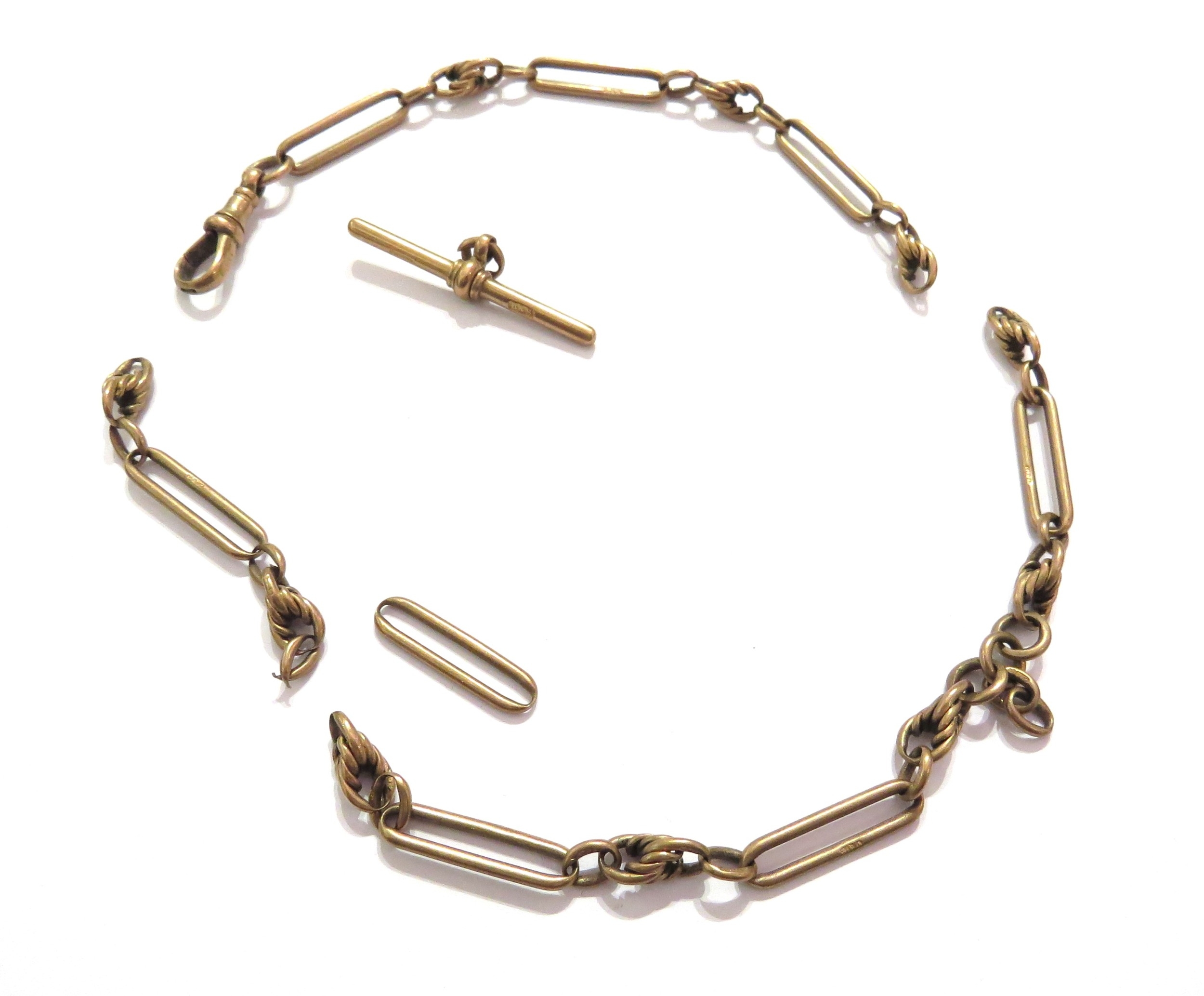 A 9ct gold watch chain, in parts with T-bar, 29.2g