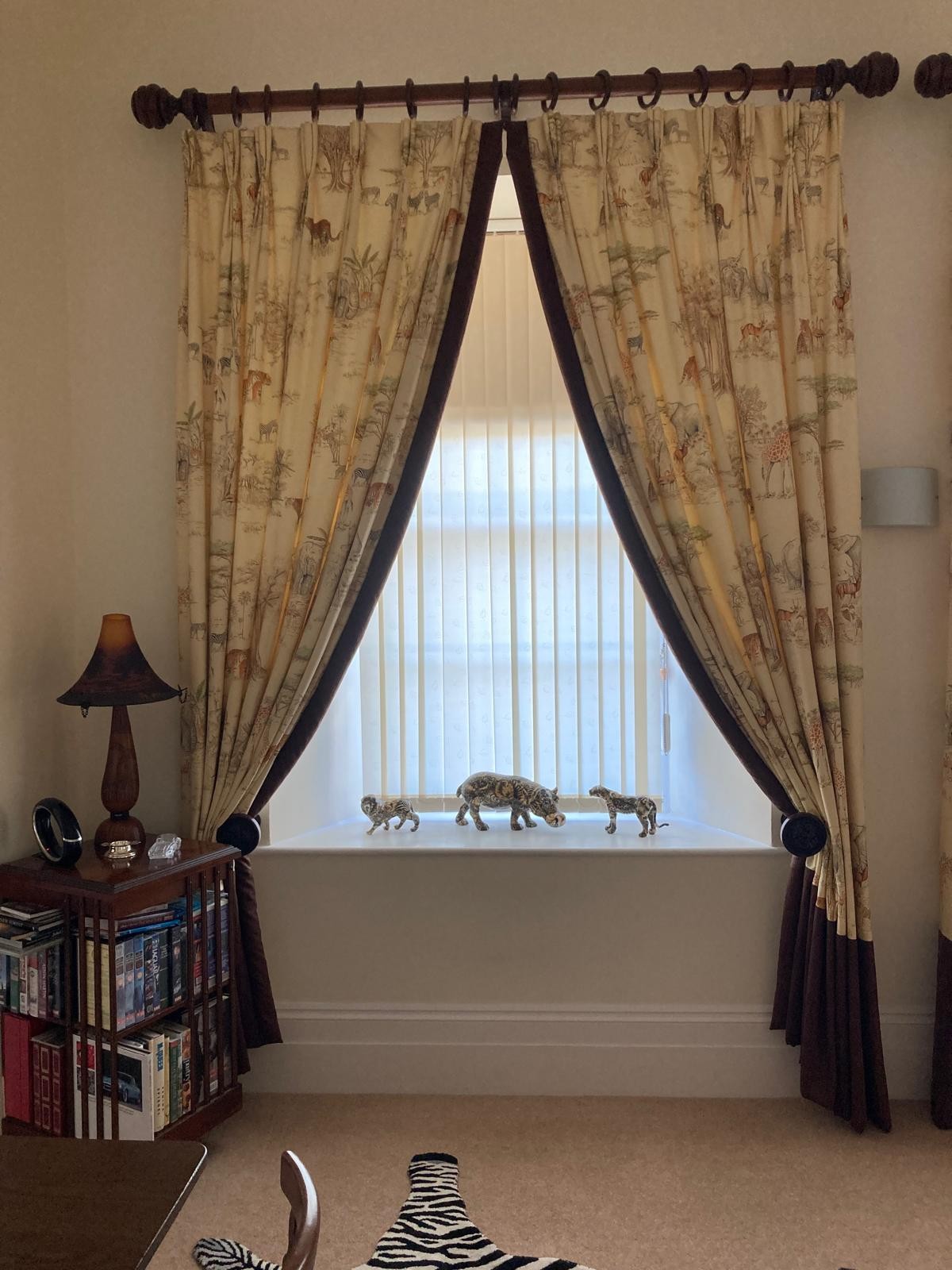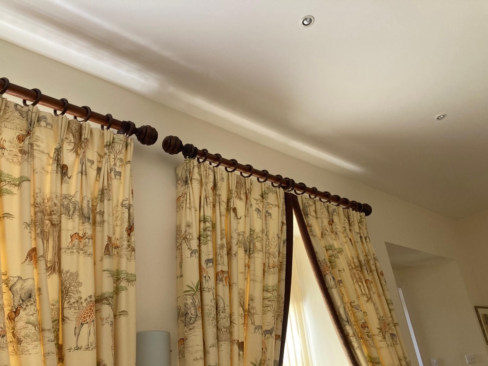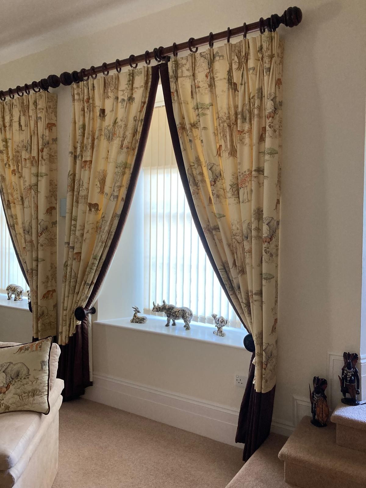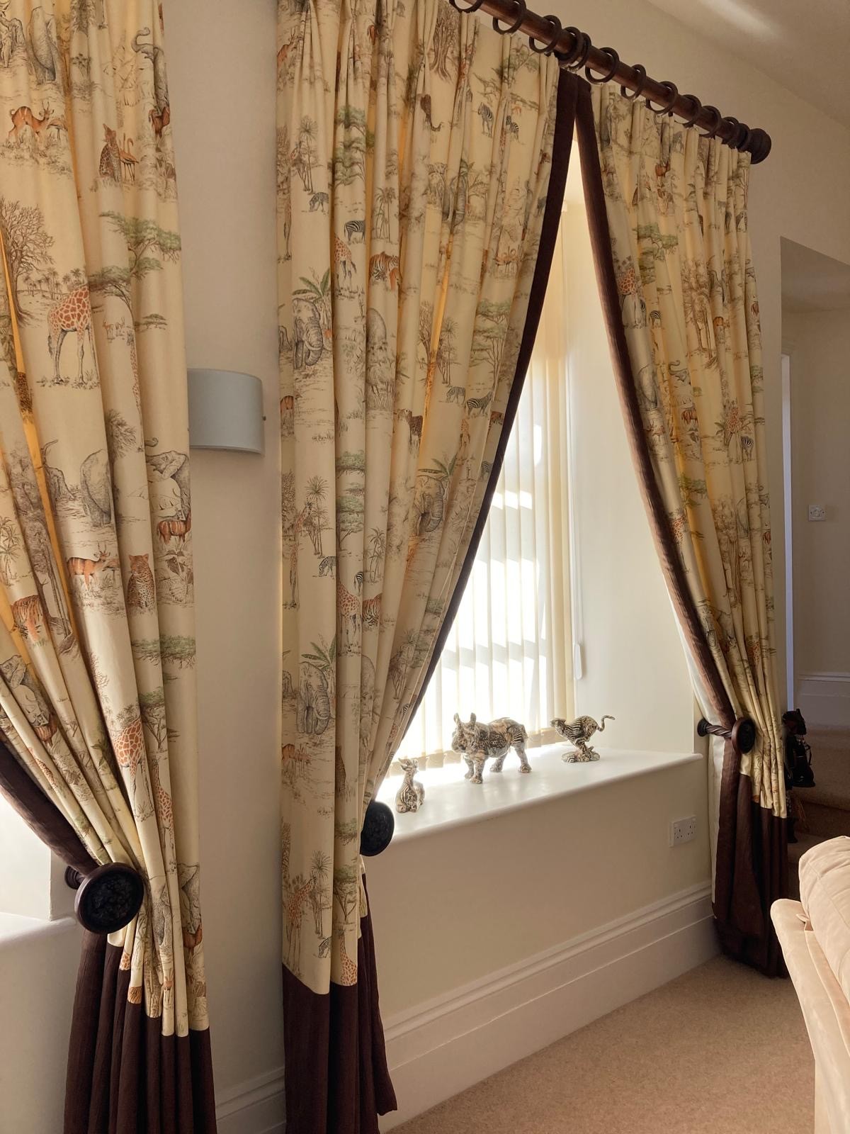 Curtains with Walnut poles in a Safari theme. Includes curtains 114" drop x 92"wide , poles 76"/77", rings and resin hold backs 9" deep x 5" wide