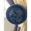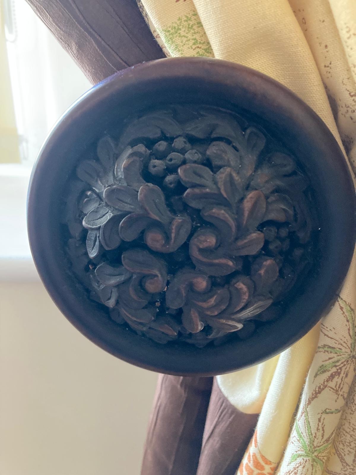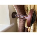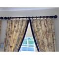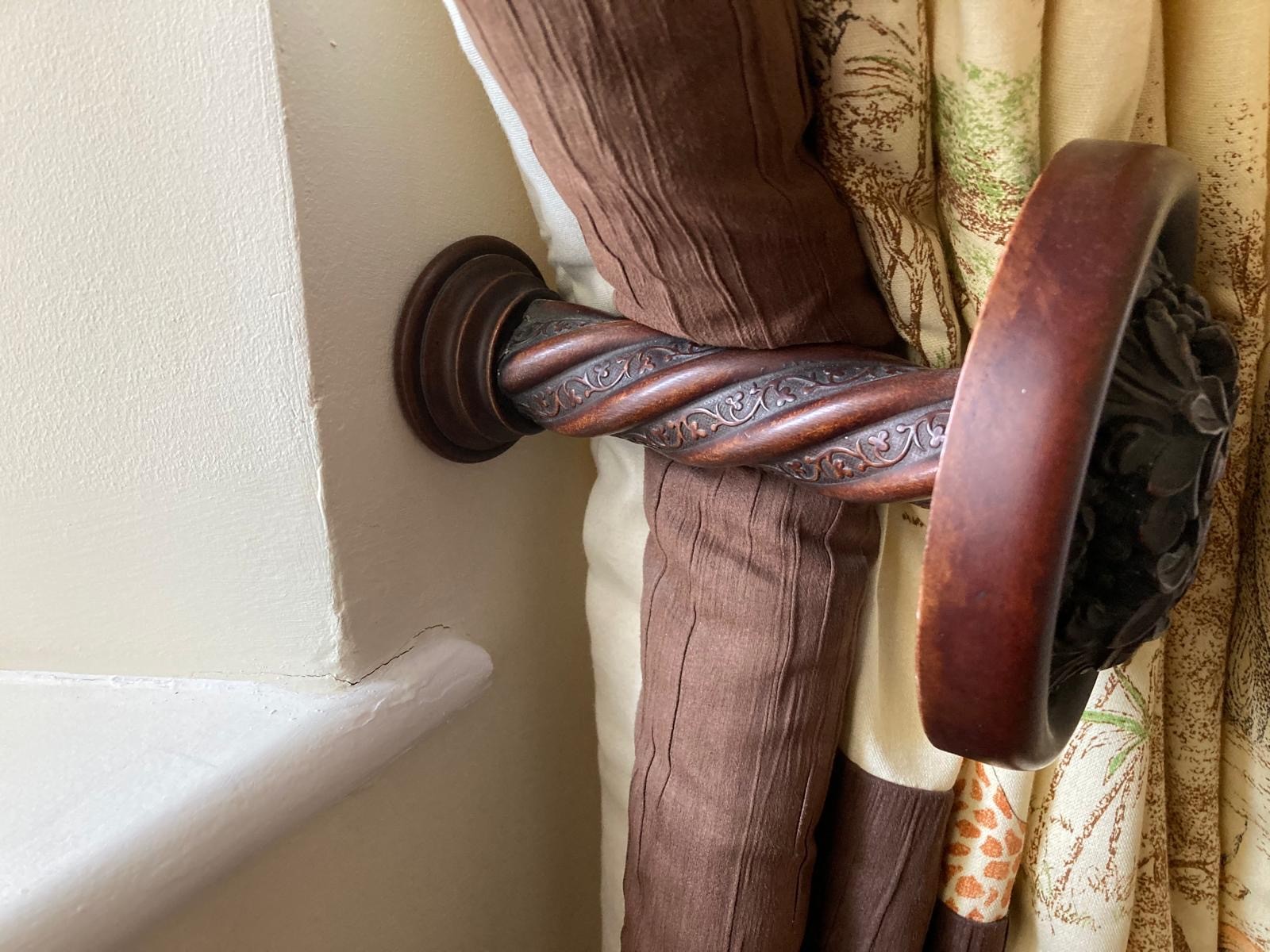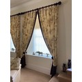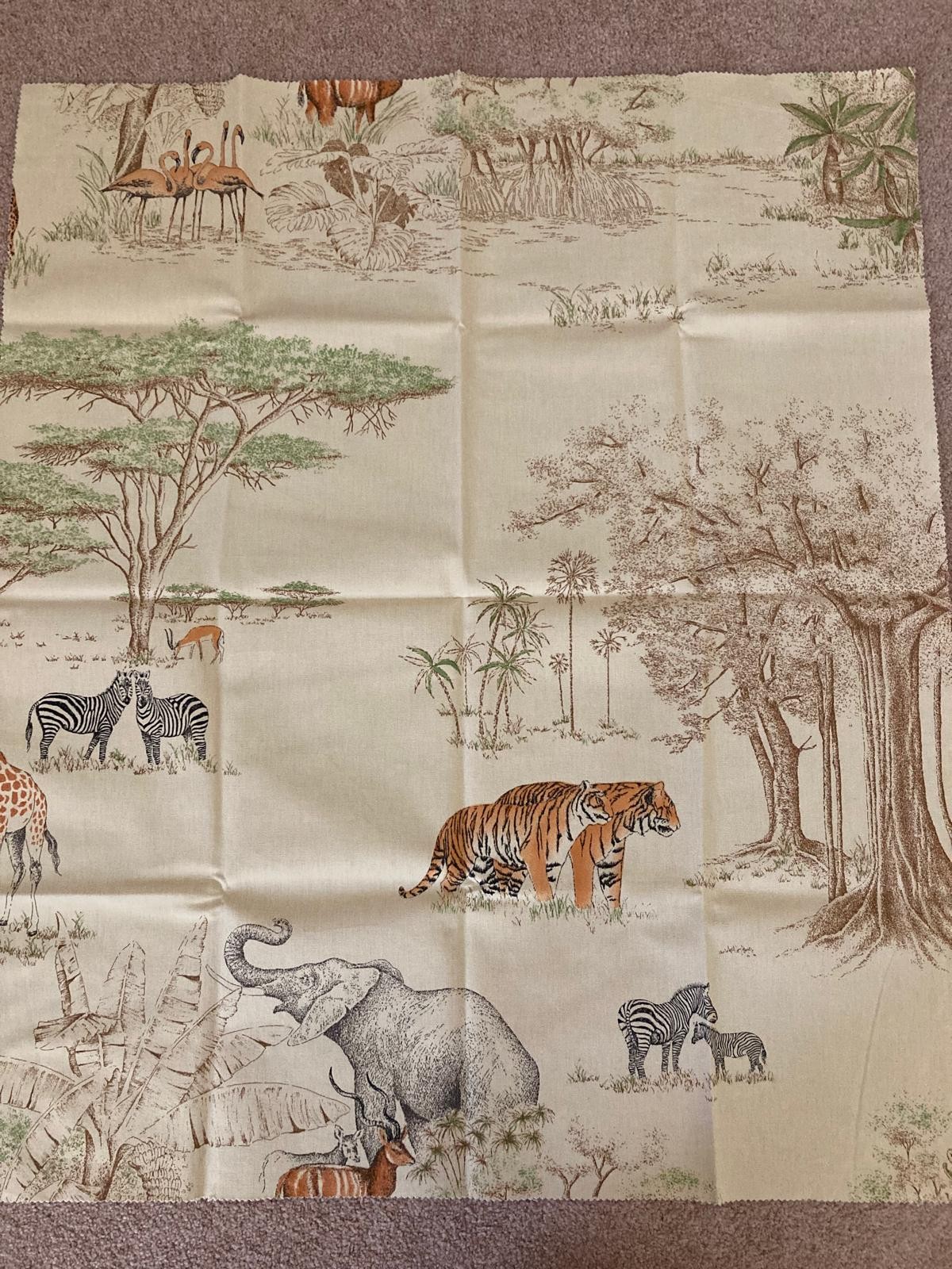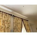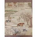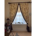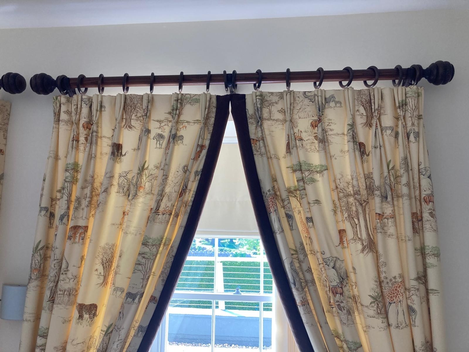Curtains with Walnut poles in a Safari theme. Includes curtains 114" drop x 92"wide , poles 76"/77", rings and resin hold backs 9" deep x 5" wide