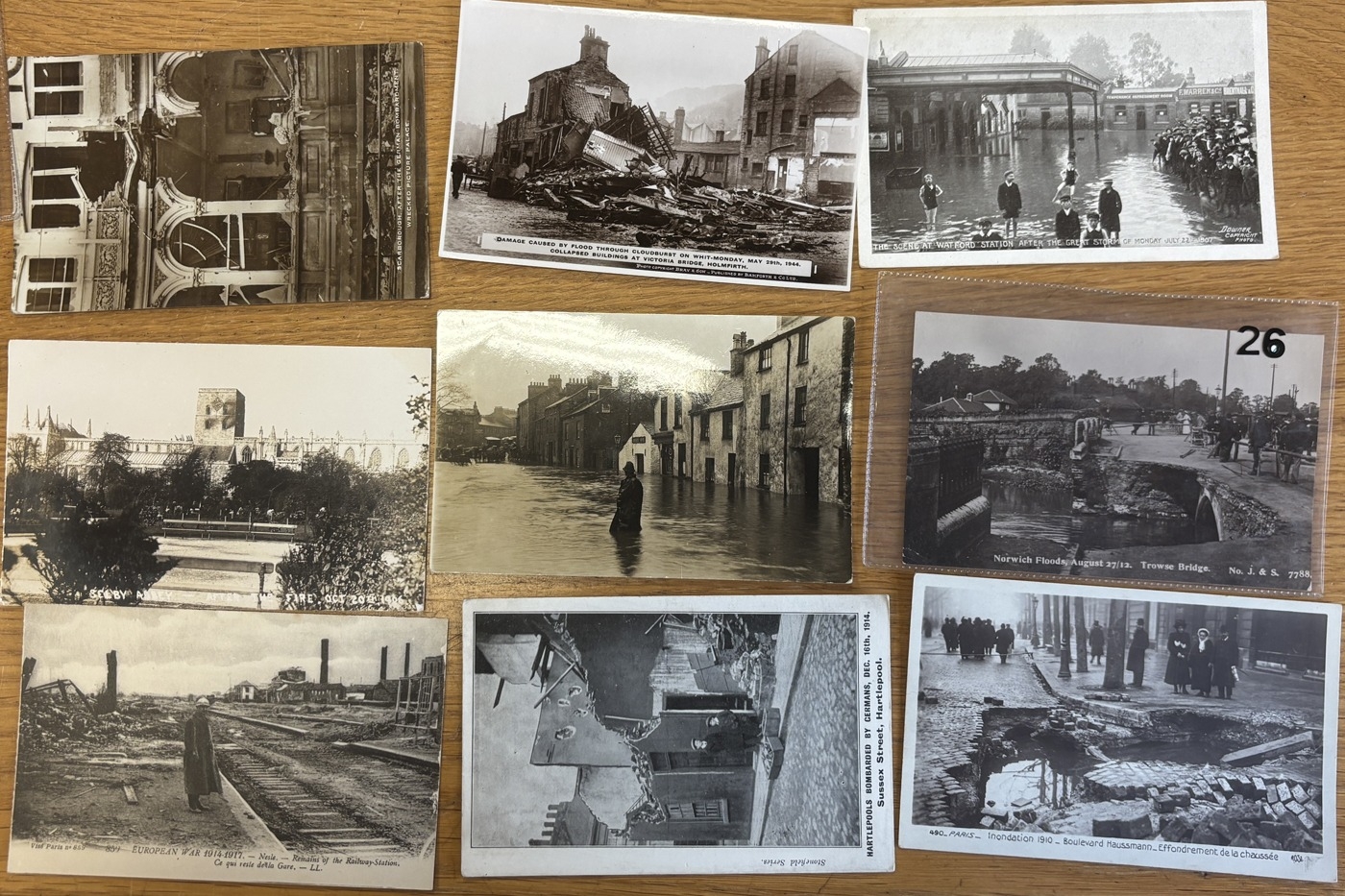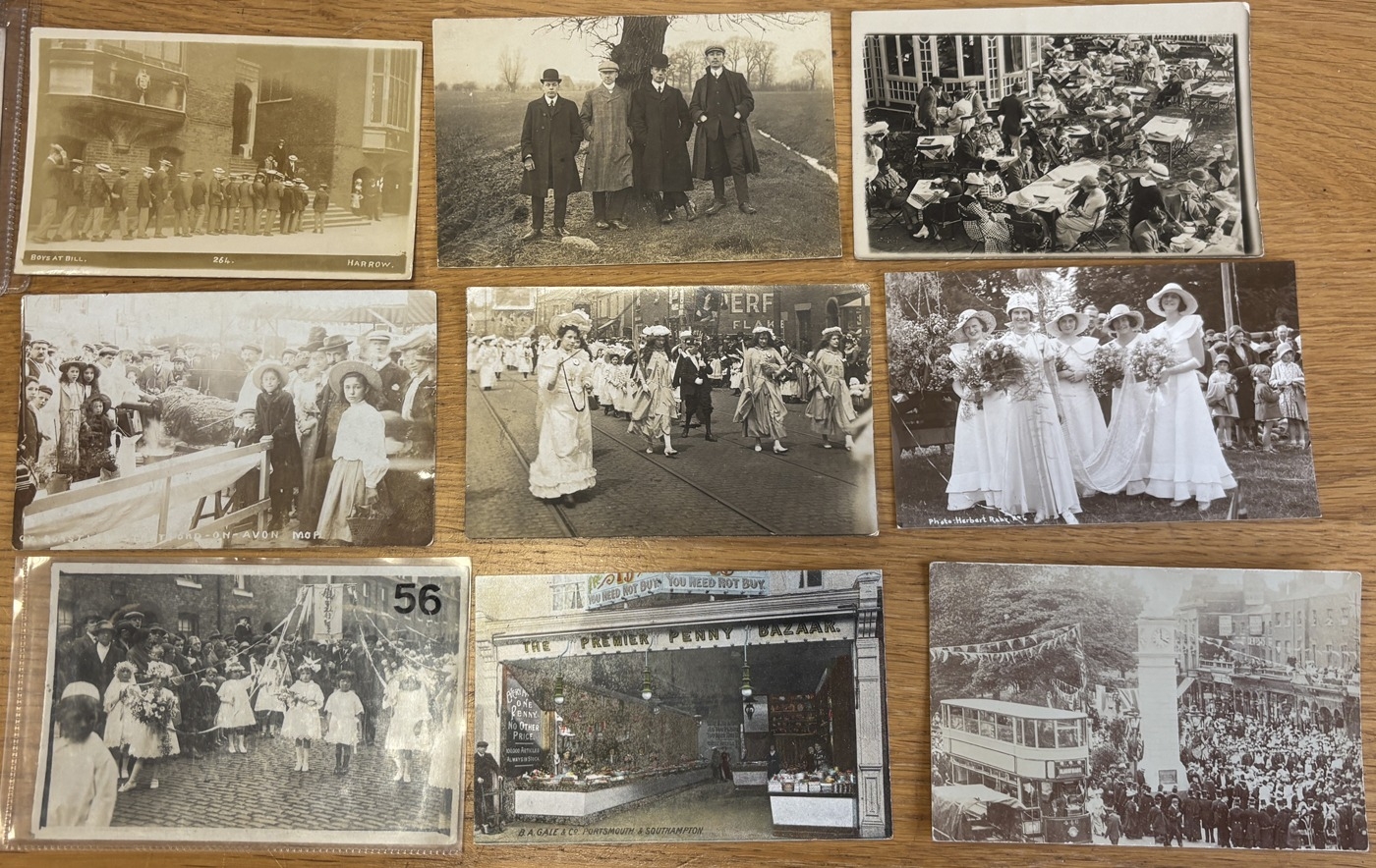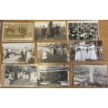 Social History. Coln. of vintage cards, with artist drawn, ptd and R.P's, incl. Royal Chain Current Events 1902 series, disasters with bombing, floods, fires, Suffragettes (5) Lancashire carnival and Stratford upon Avon Mop Fair. Qty. Approx 150+. (R)