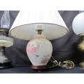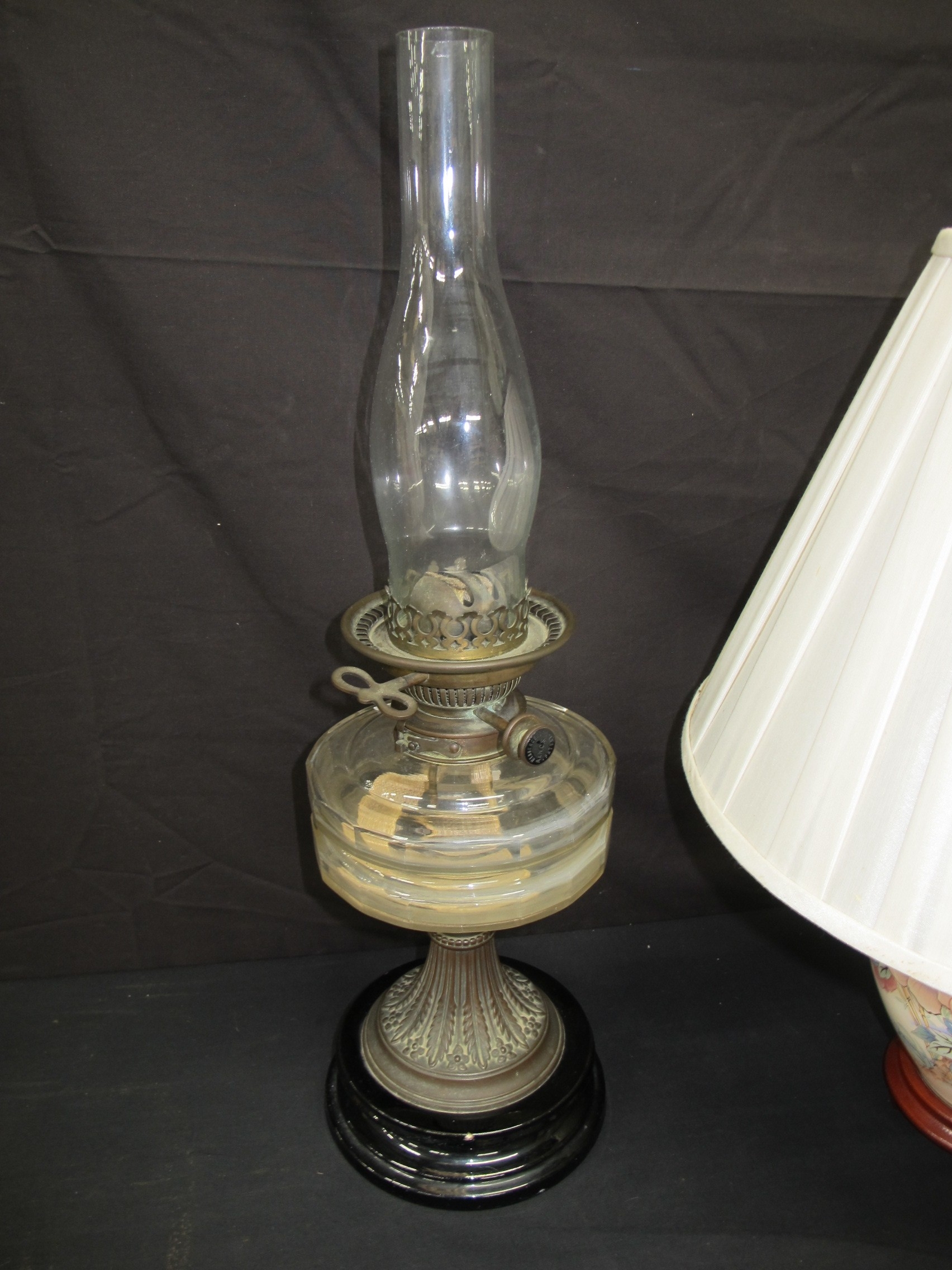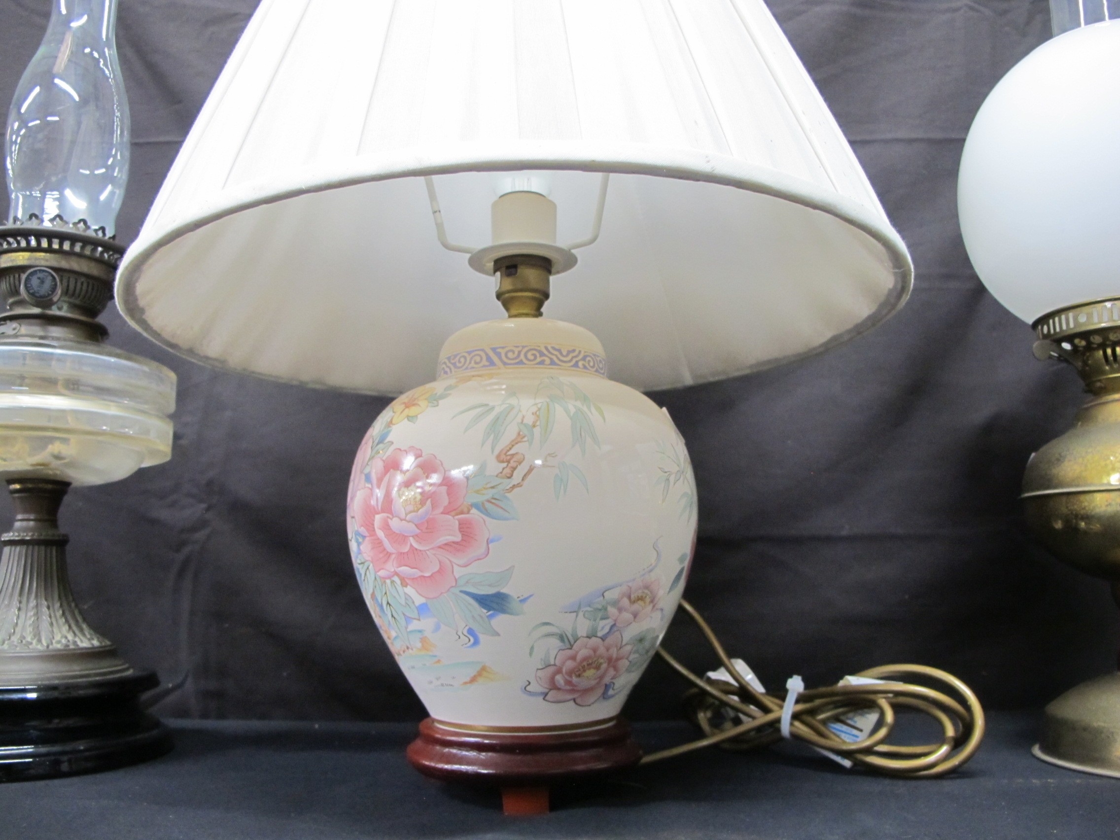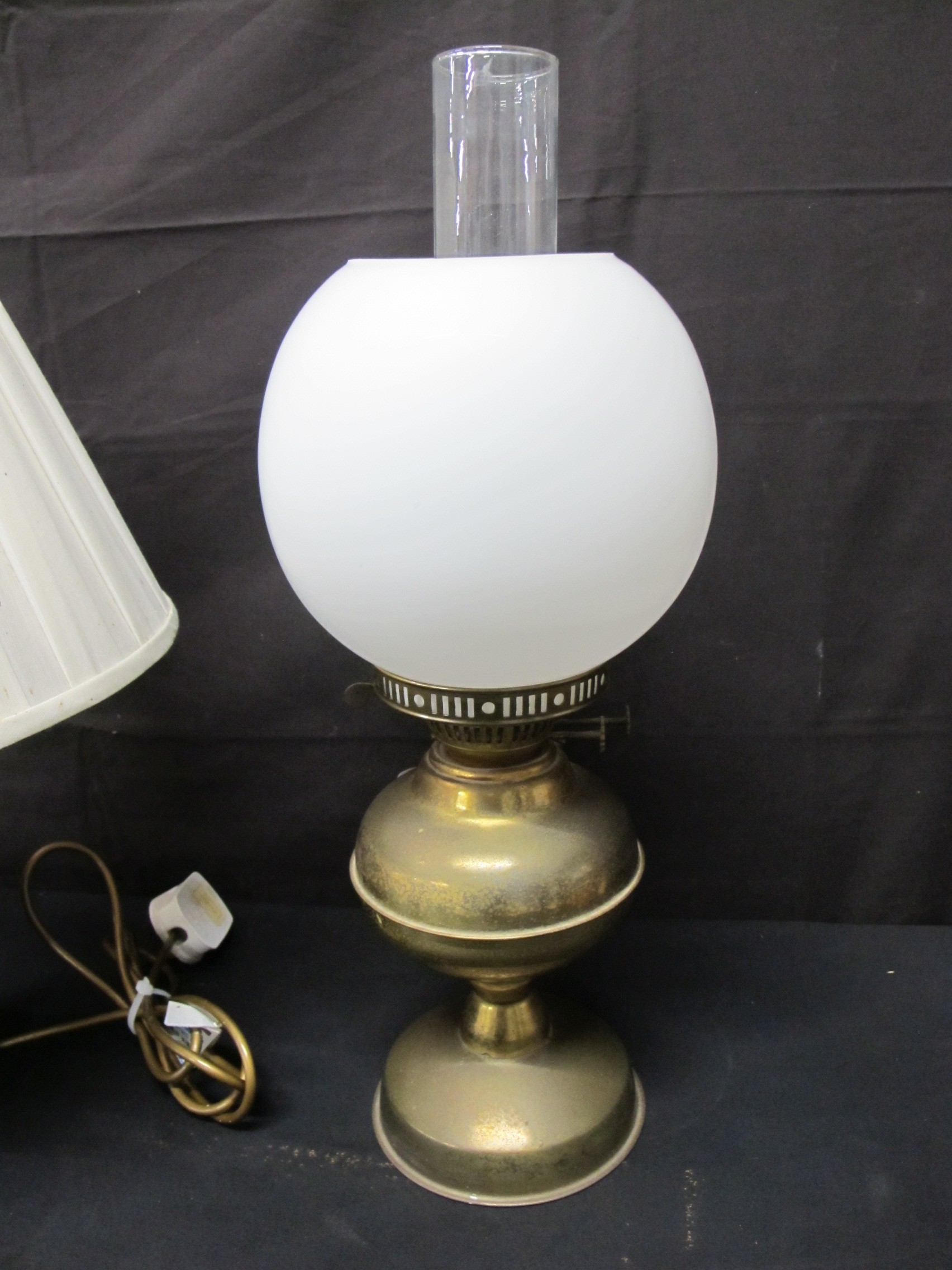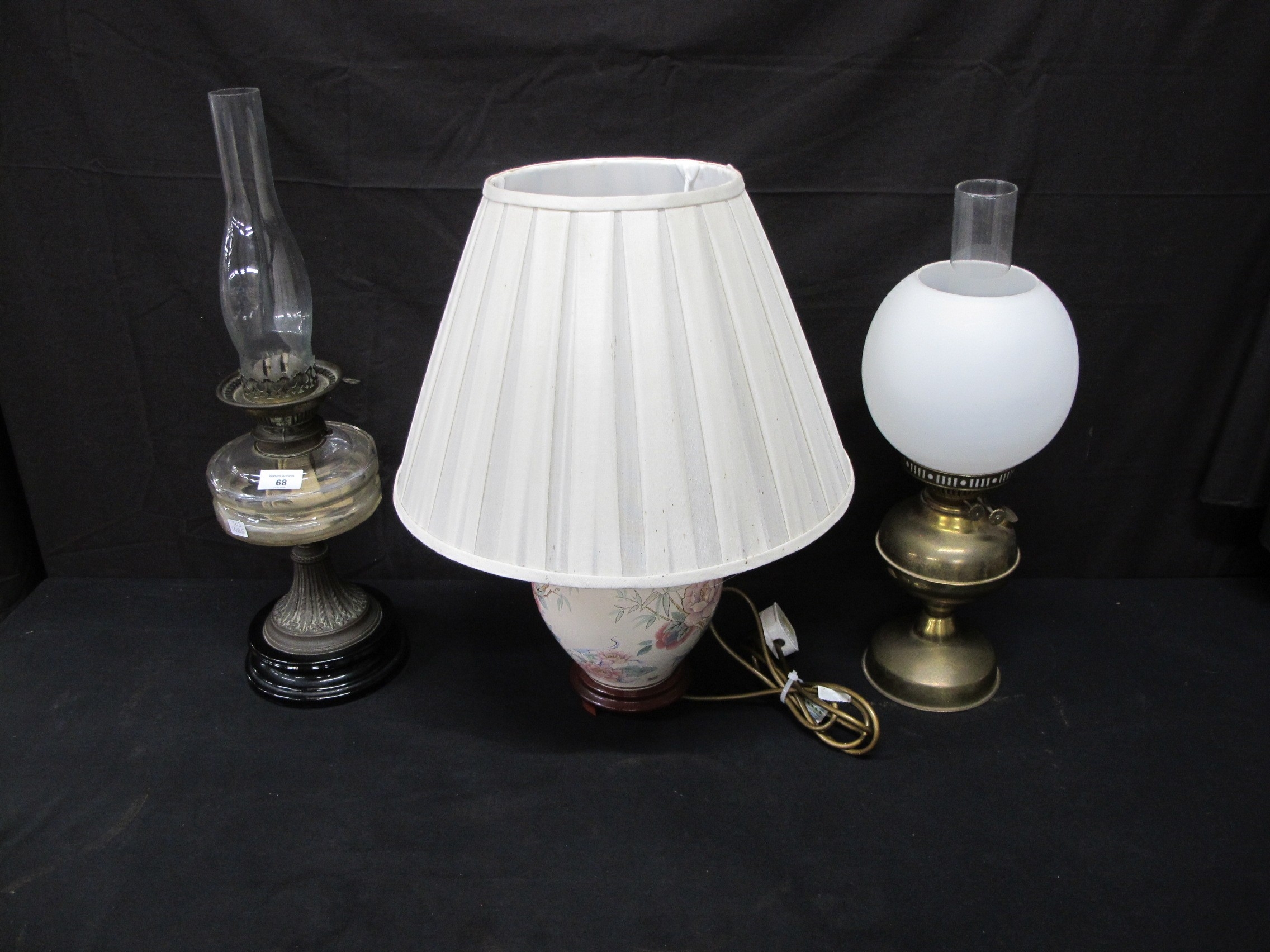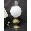 Two oil lamps together with a table lamp