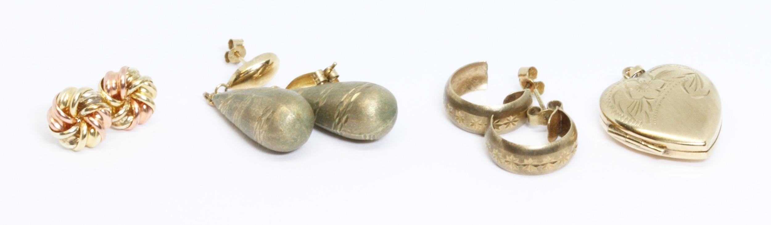 Three pairs of earrings, unmarked, and a hallmarked 9ct gold locket, gross weight 6.7g.
