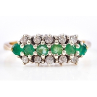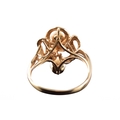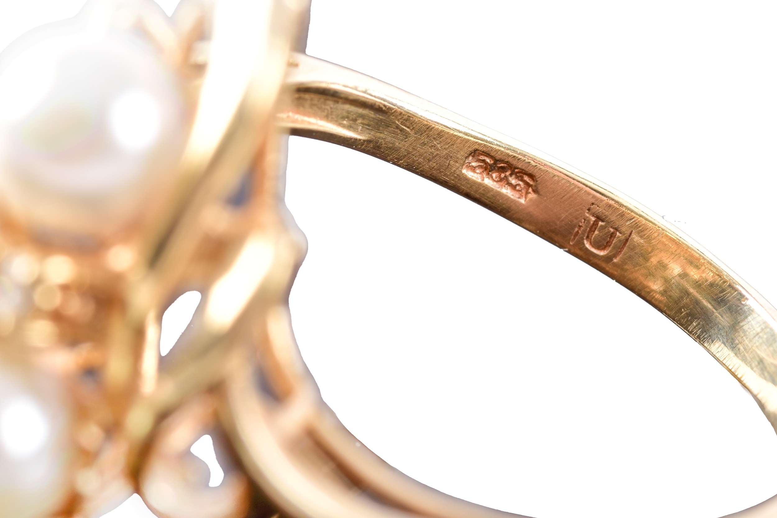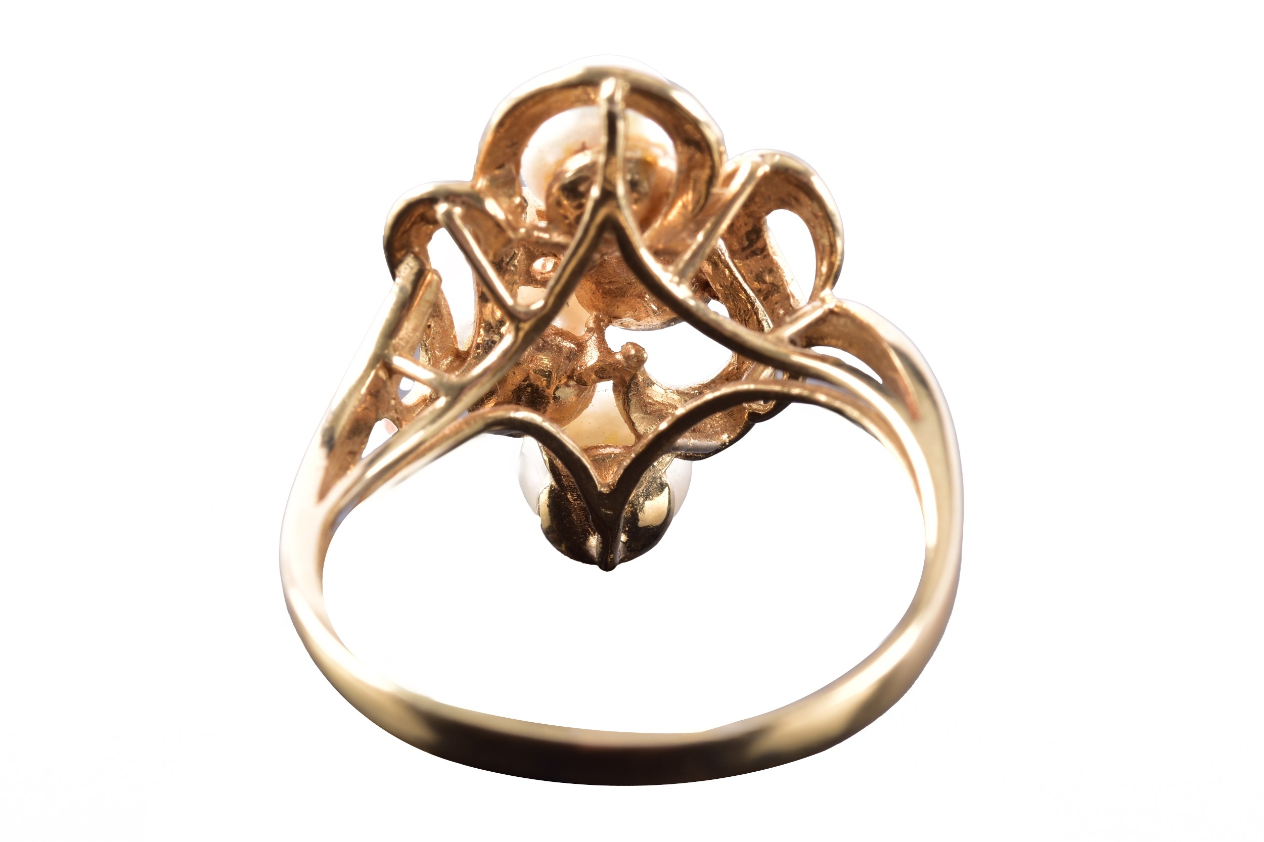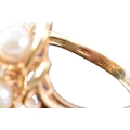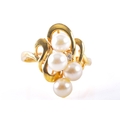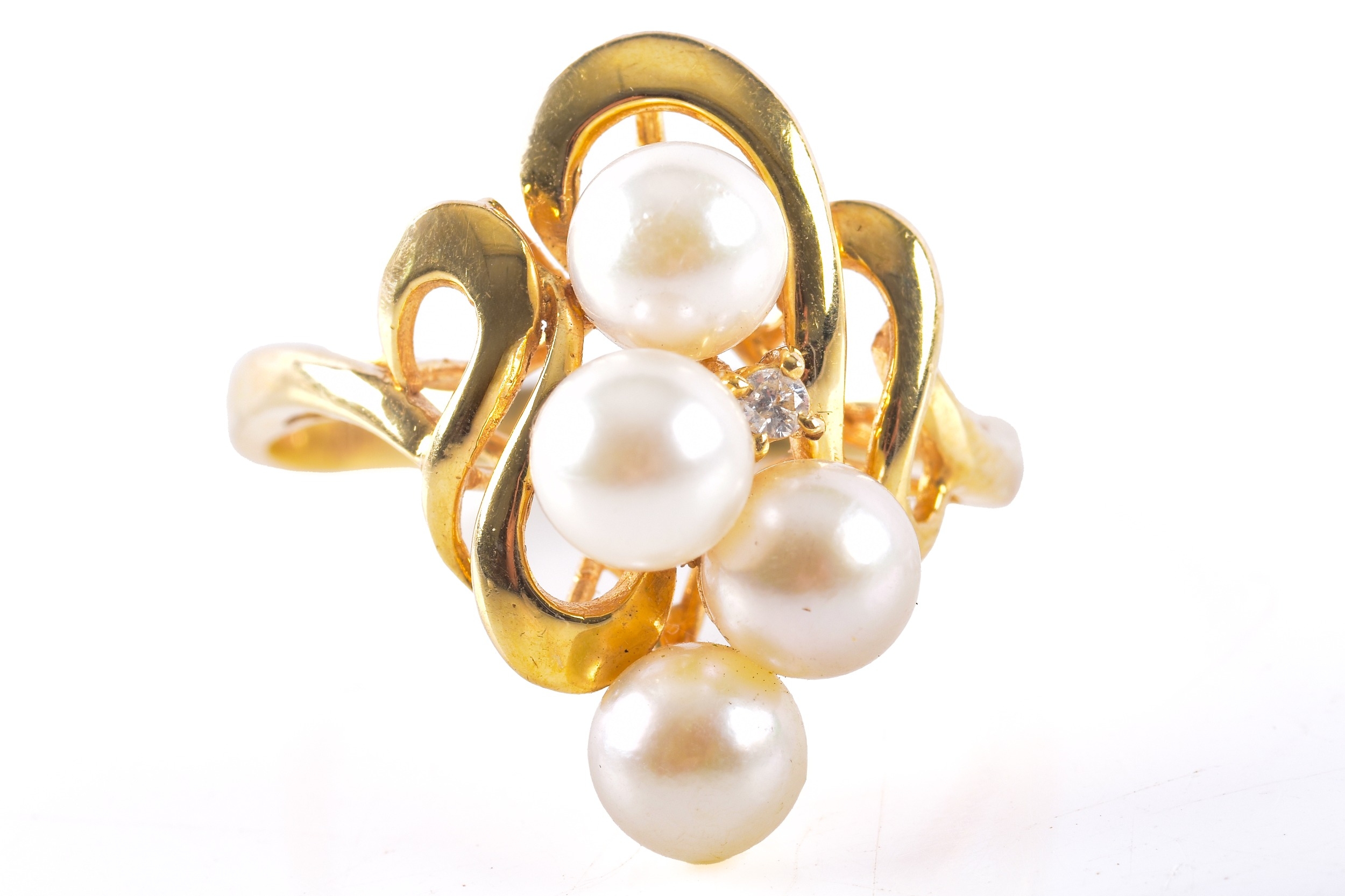 A 14ct yellow gold pearl and diamond ring, set with four cultured pearls each measuring approximately 5.4 mm diameter, further set with a small round eight cut diamond, in a yellow gold abstract openwork design, size O.