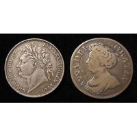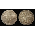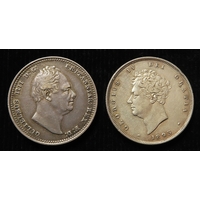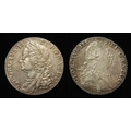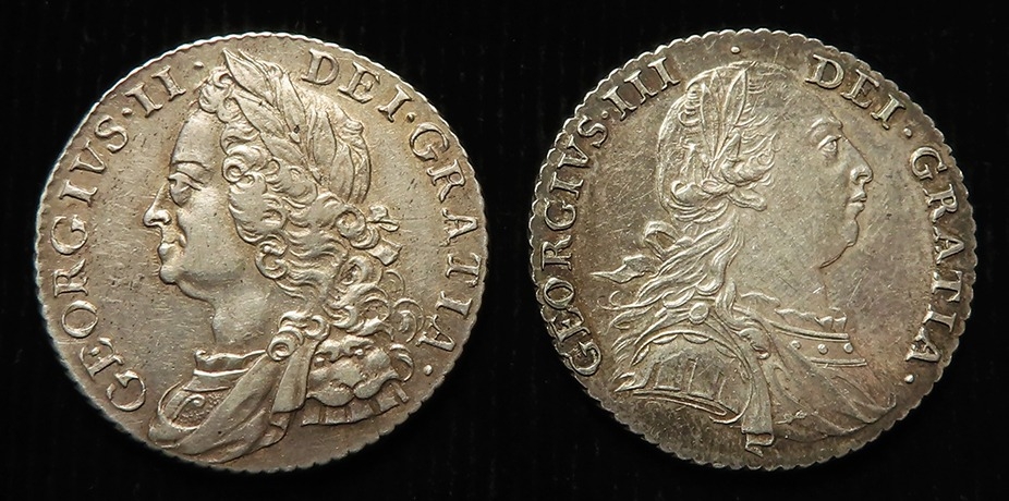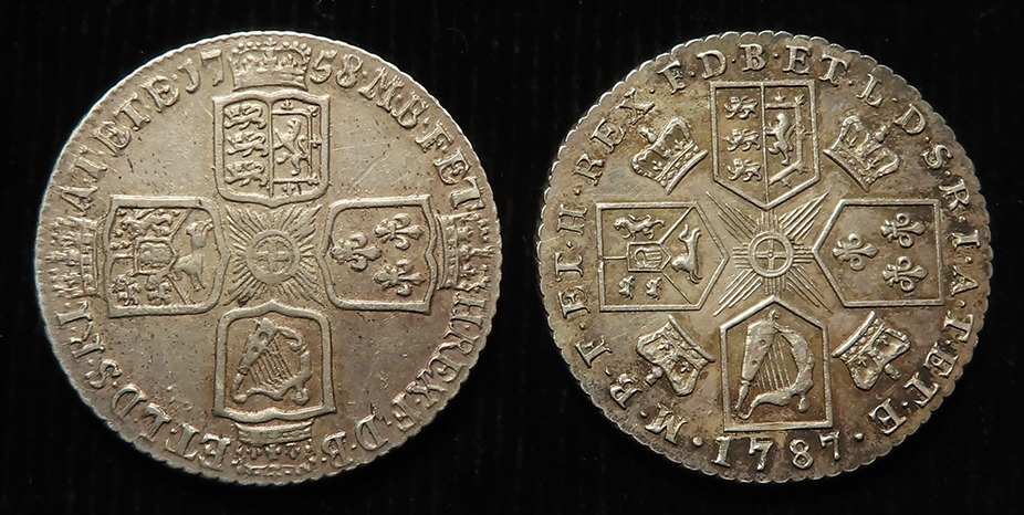 Shillings (2): 1758 GVF, and 1787 no hearts, EF light hairlines.