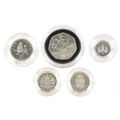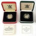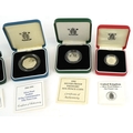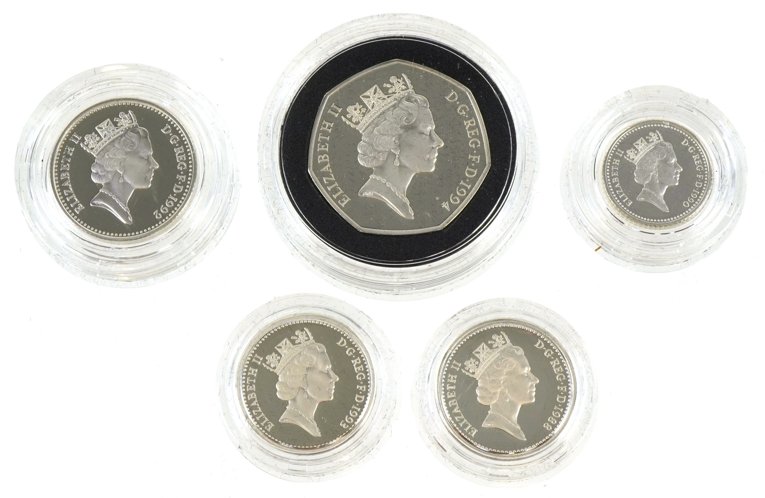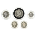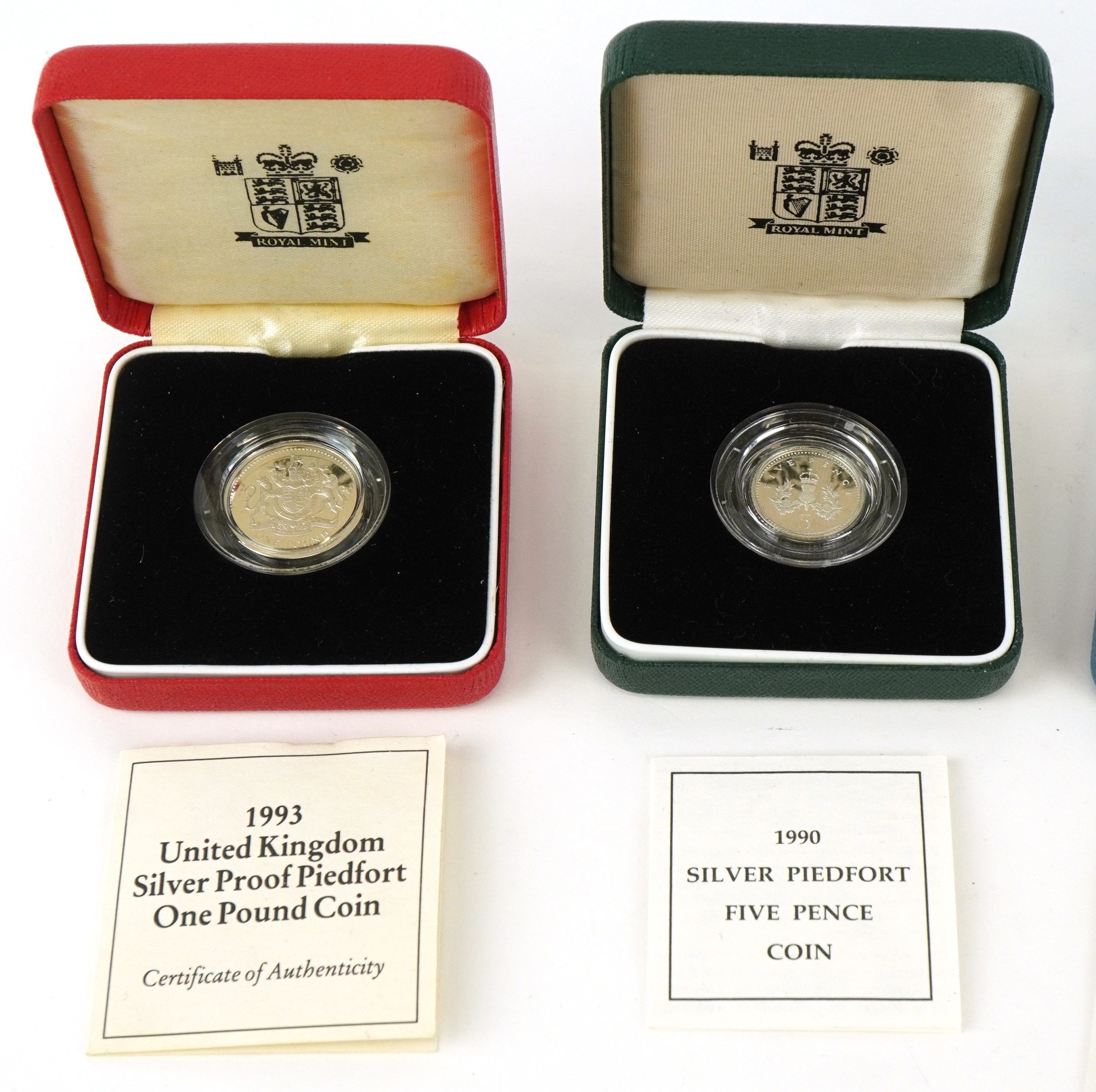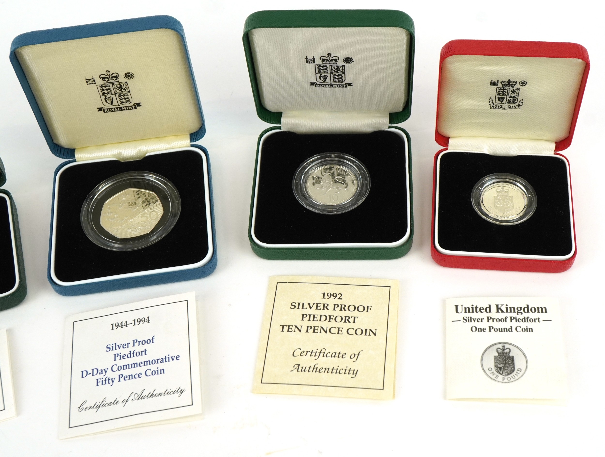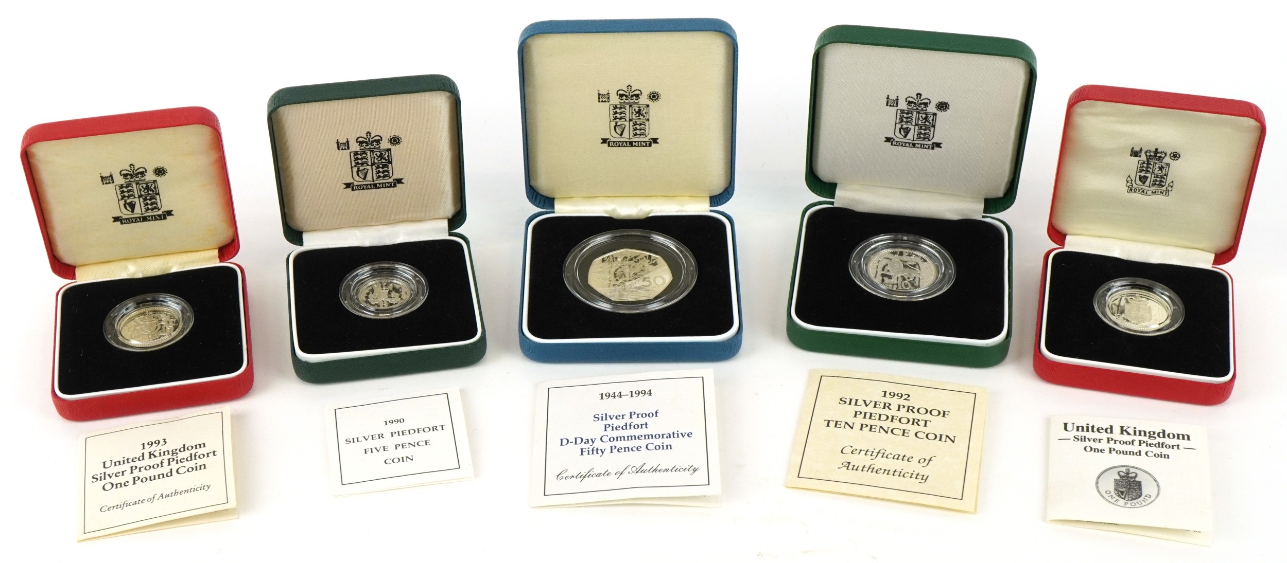 Five Royal Mint silver proof Piedfort silver coins including two one pound coins, fifty pence commemorating 50th Anniversary of D-Day, ten pence and a five pence, all with certificates of authenticity, each housed in presentation box.