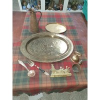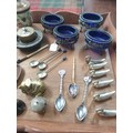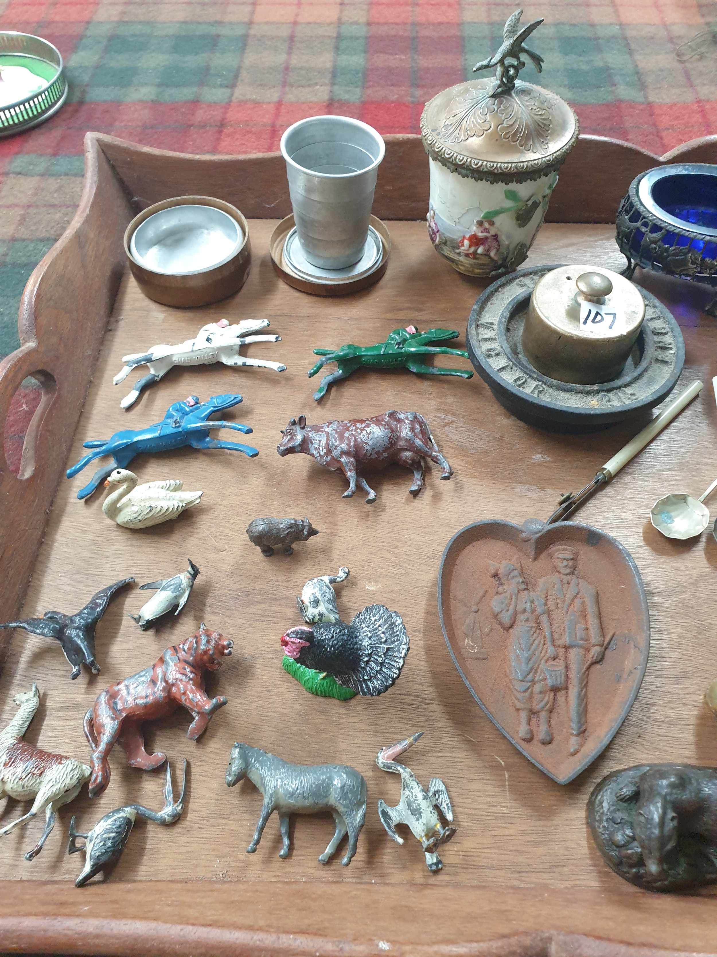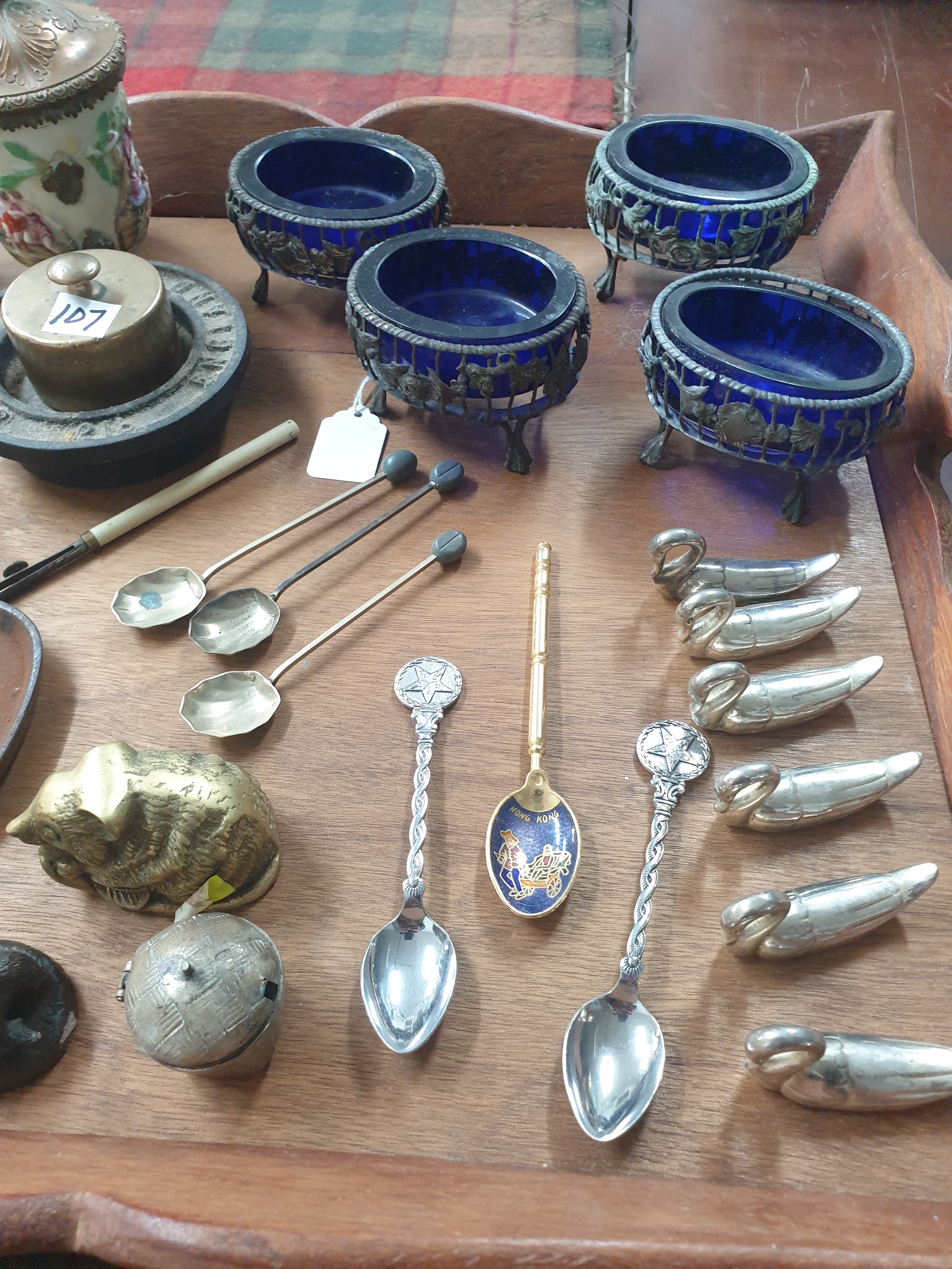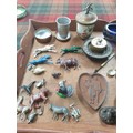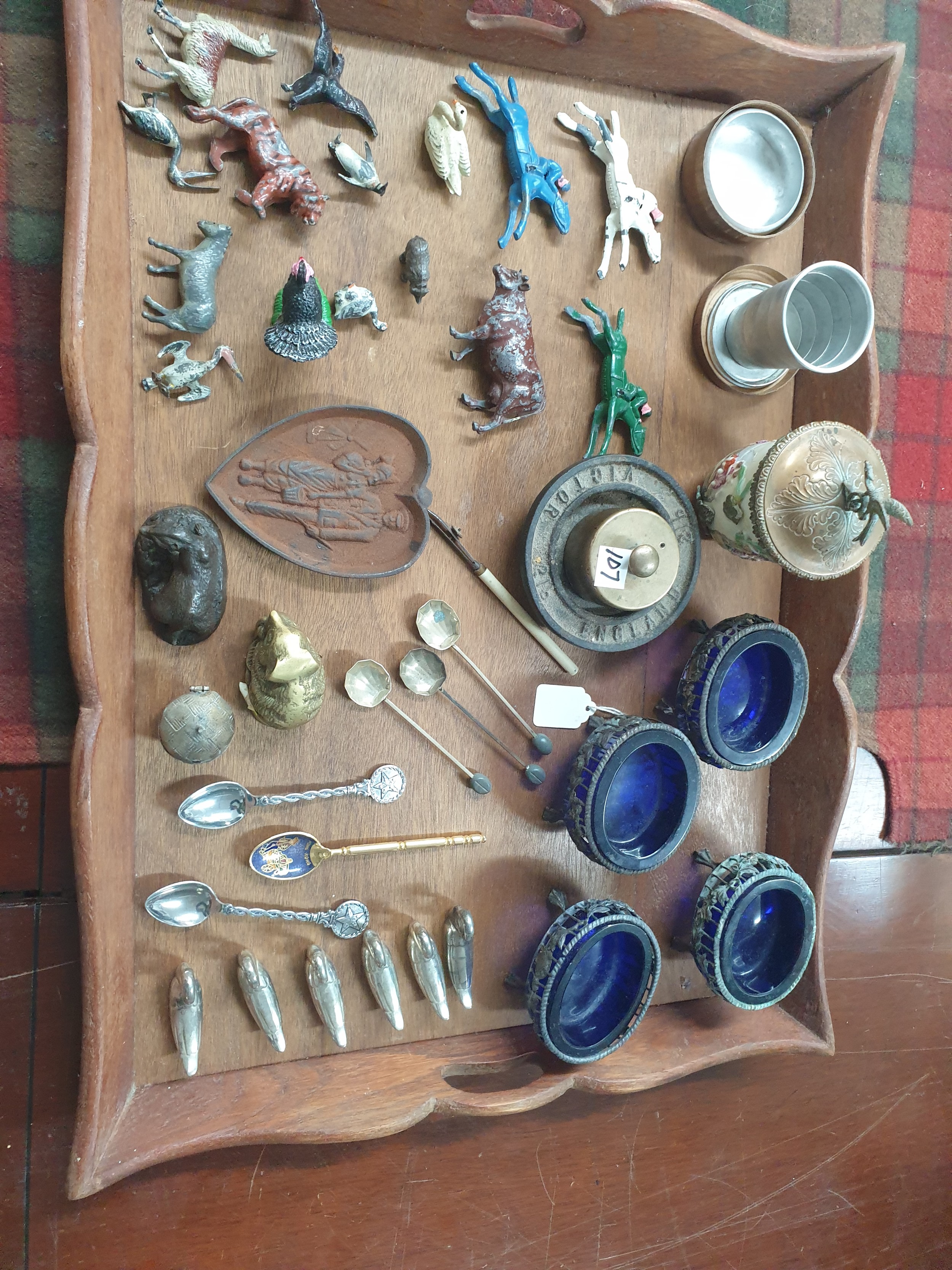 Tray Of Collectables Victorian Salts With Blue Glass Liners, Ink Well, Folding Cup Metal Animals, Sweetheart Plaque etc