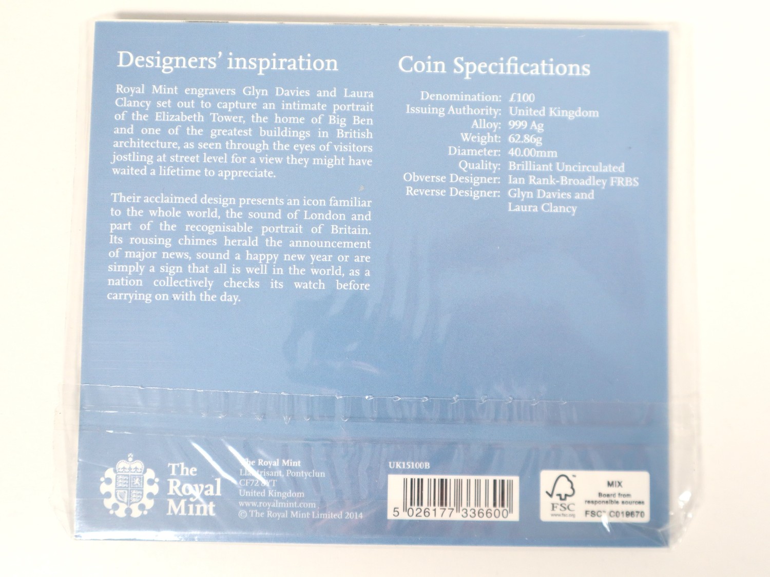 2015 UK £100 Fine Silver Coin 999Ag 62.86g
