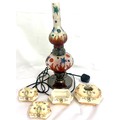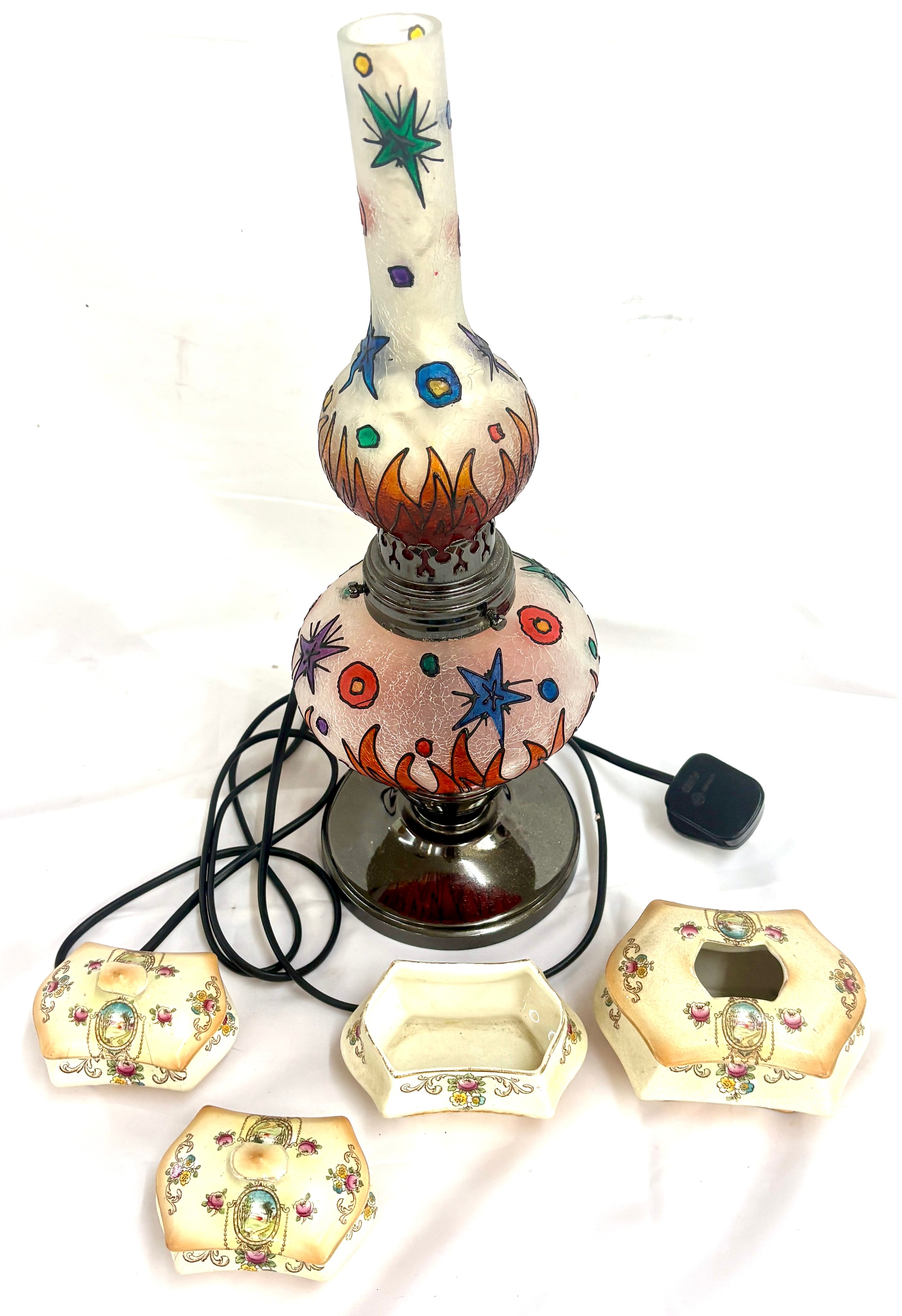 Converted hand painted oil lamp, together with a part vanity set / trinkets, lamp in working order