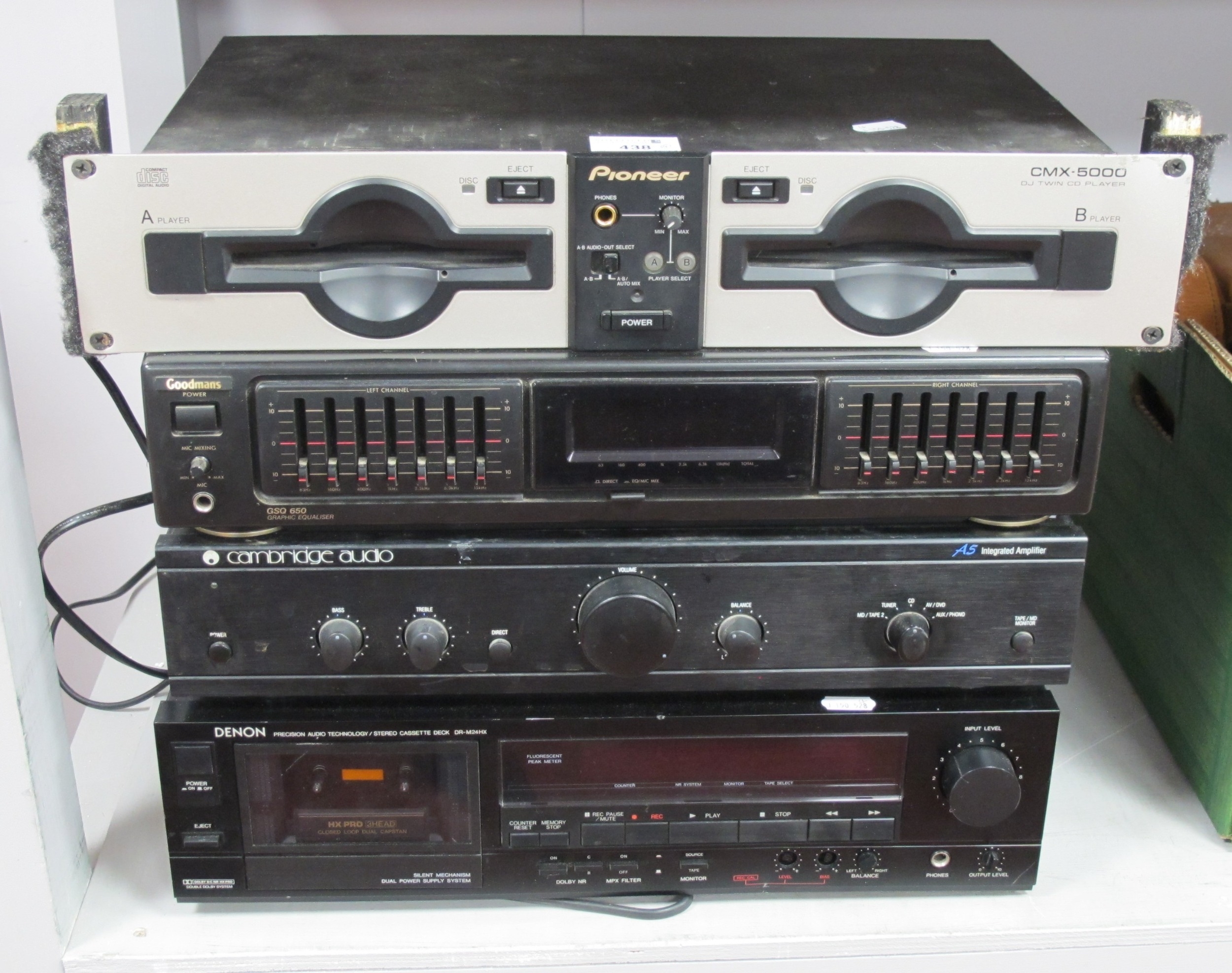 A Denon DR-M24HX Precision Audio Technology/ Stereo Cassette Deck, black, together with a Cambridge Audio A5 Integrated Amplifier, Goodmans GSQ 650 Graphic Equaliser and a Pioneer CMX-5000 DJ Twin CD Player, Untested. (4)