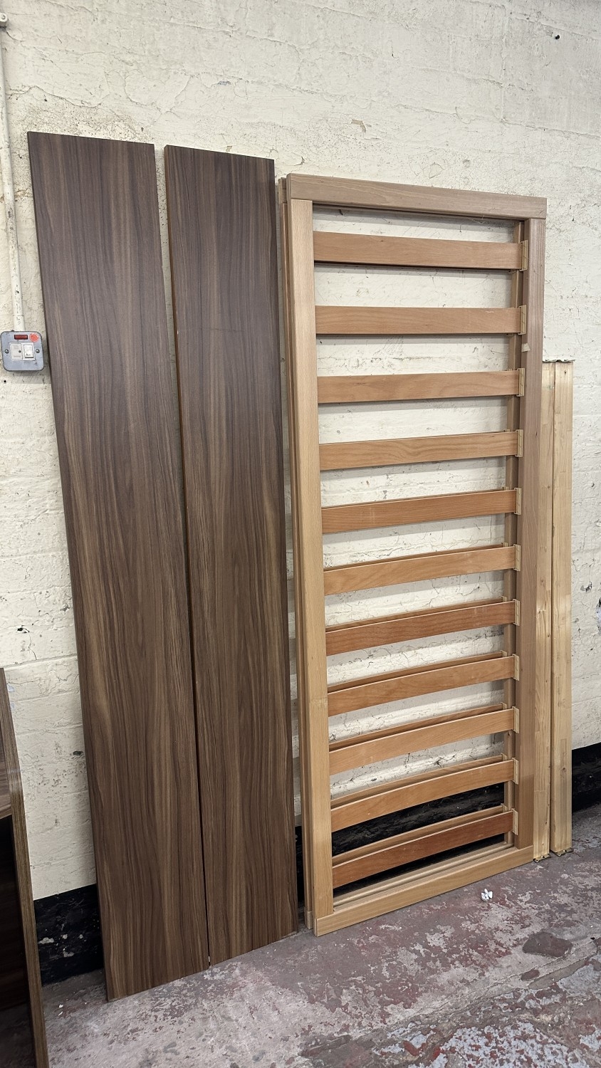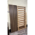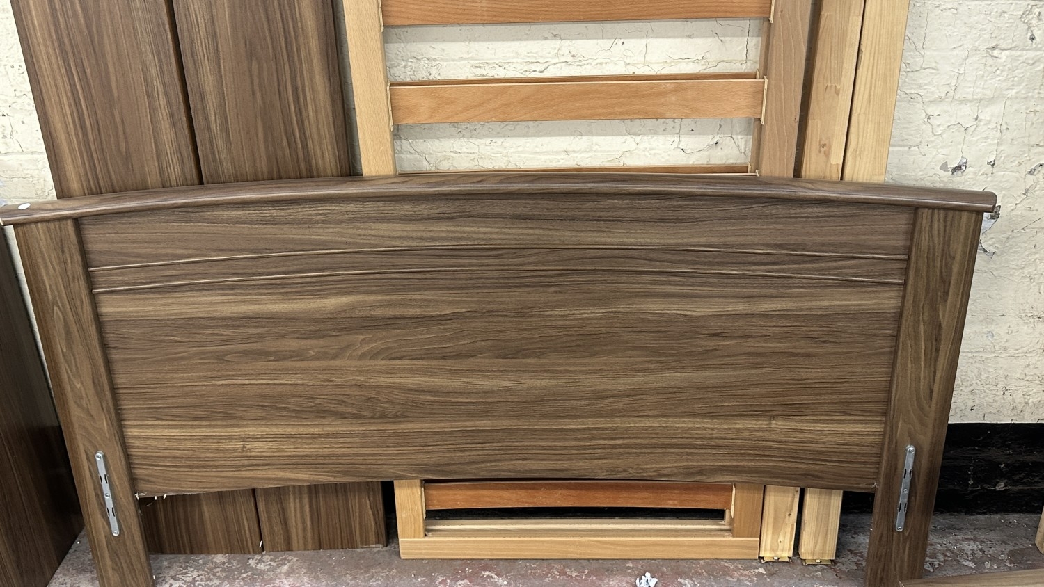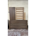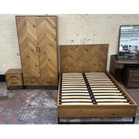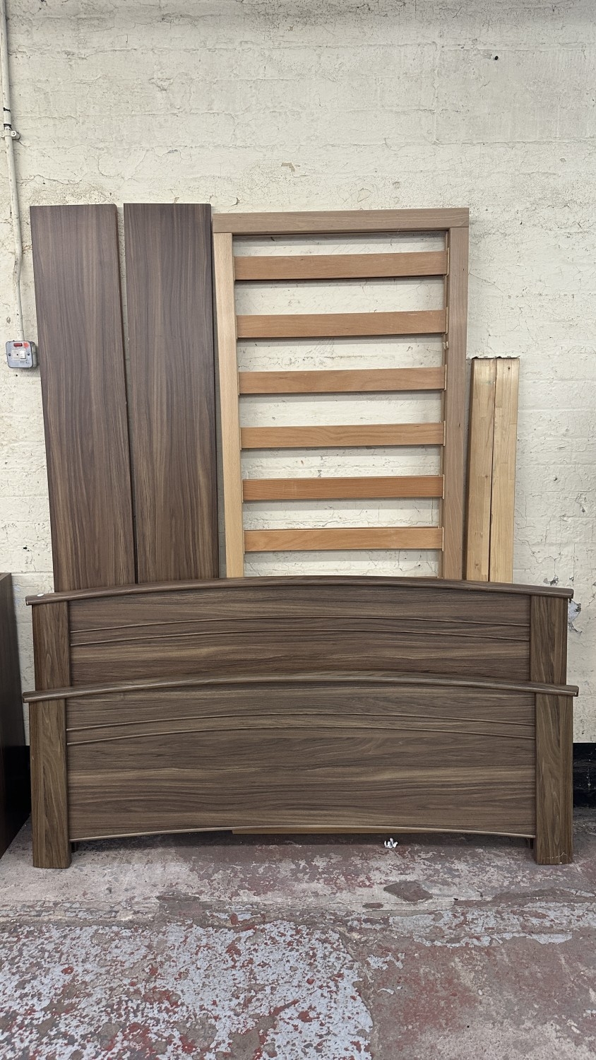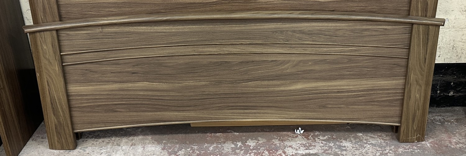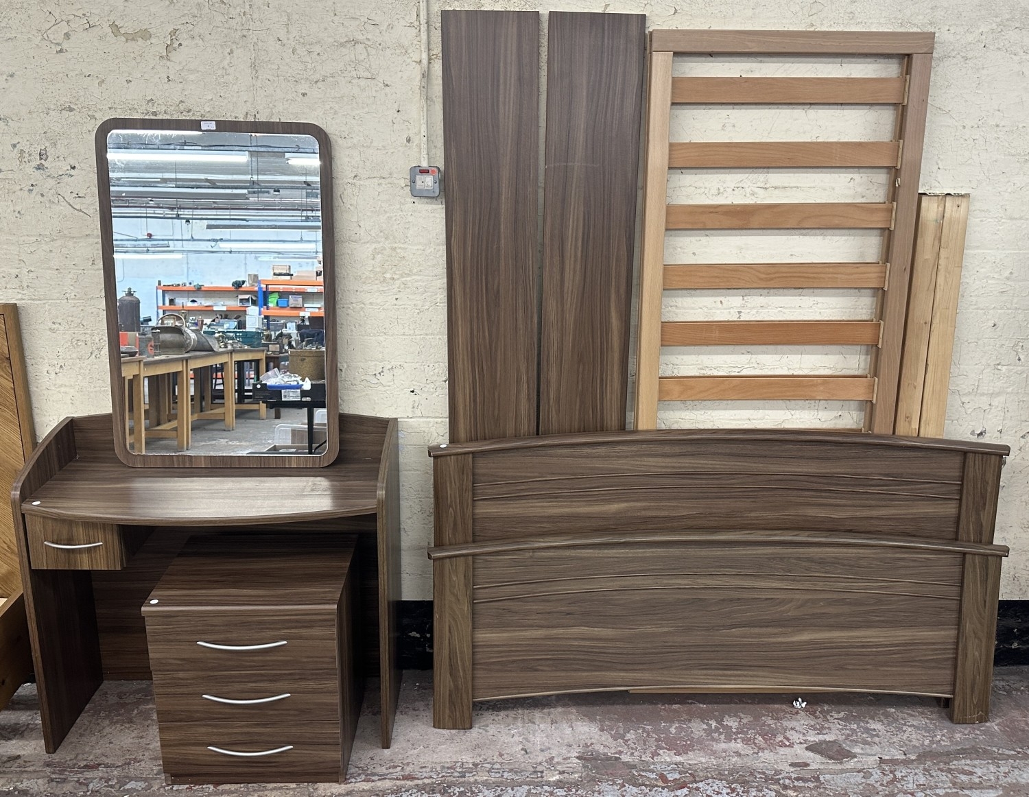 A modern walnut effect four piece bedroom suite comprising dressing table - approx. 88cm high x 96cm wide x 43cm deep, bedside chest of drawers - approx. 57cm high x 48cm wide x 43cm deep, wall mirror - approx. 63cm x 97cm and bedframe - approx. 171cm wide