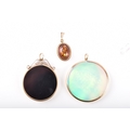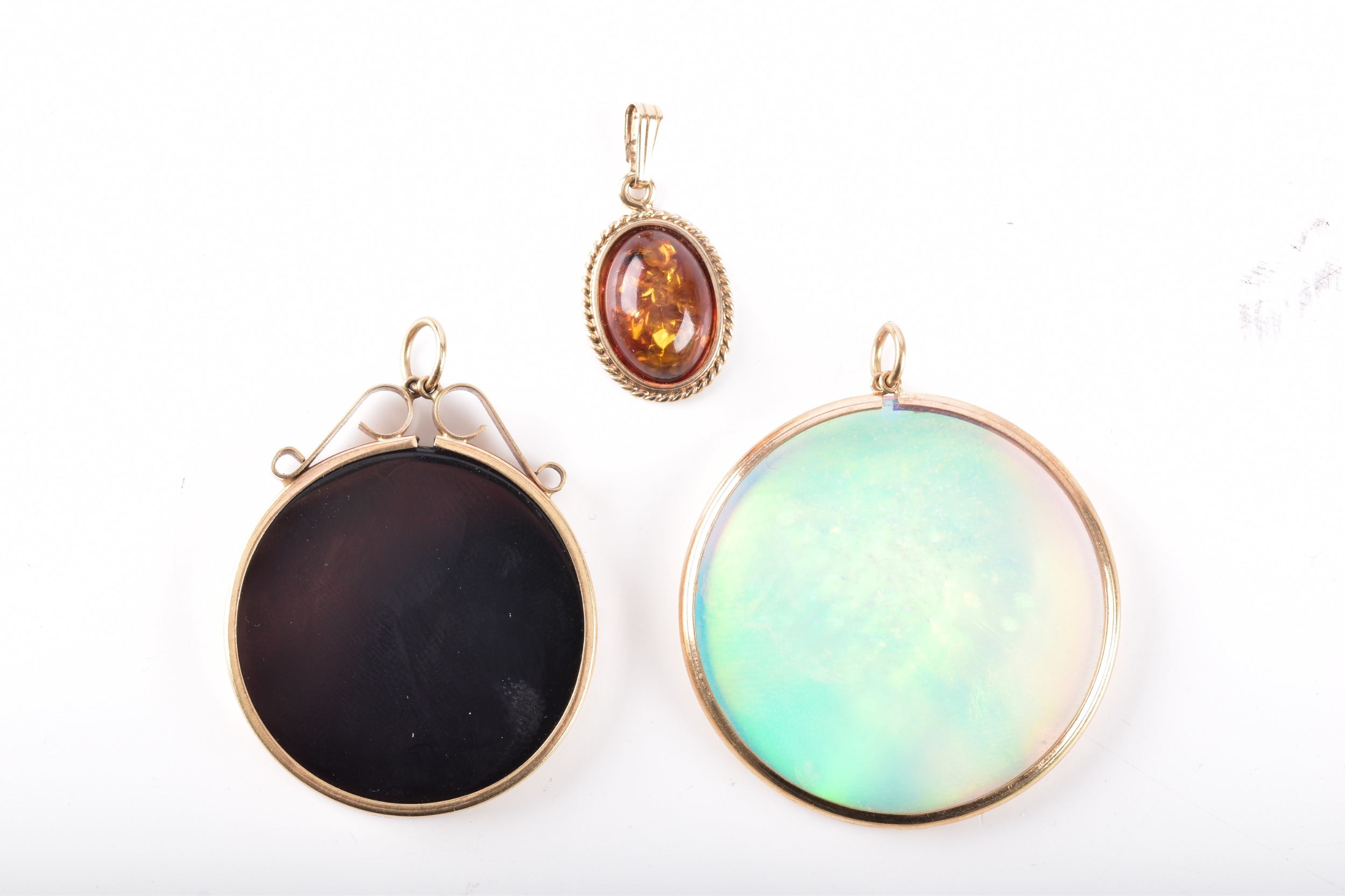 Three pendants, including a 9ct hologram pendant in a 9ct yellow gold mount and bale, 4 cm diameter, a jet pendant in a 9ct yellow gold mount and bale, 3.3 cm diameter, 3.6 cm long excluding bale, together with a 9ct yellow gold amberlite oval pendant, 2.6 cm total length. (3)
